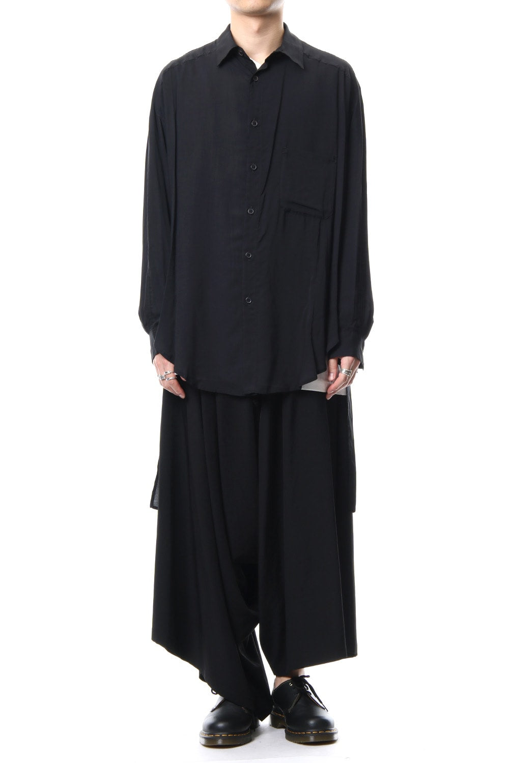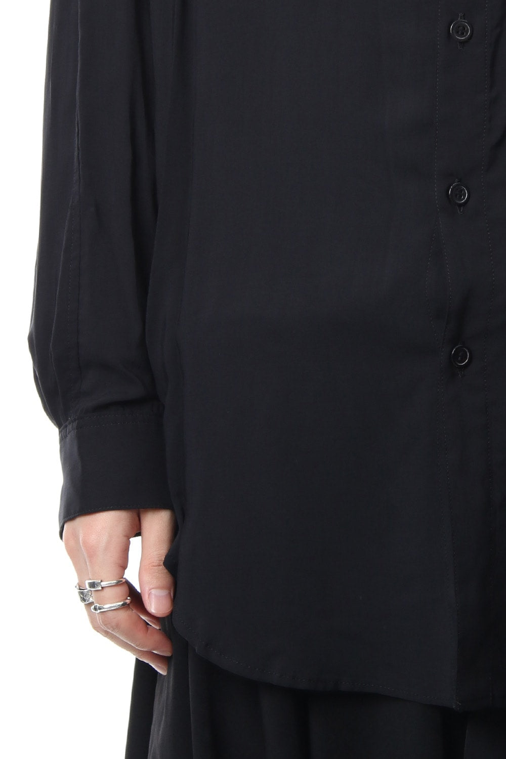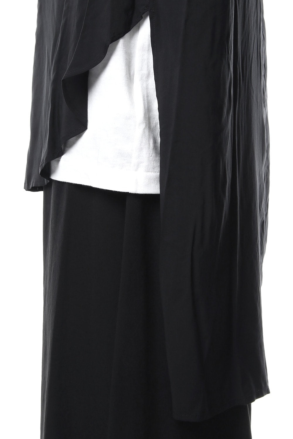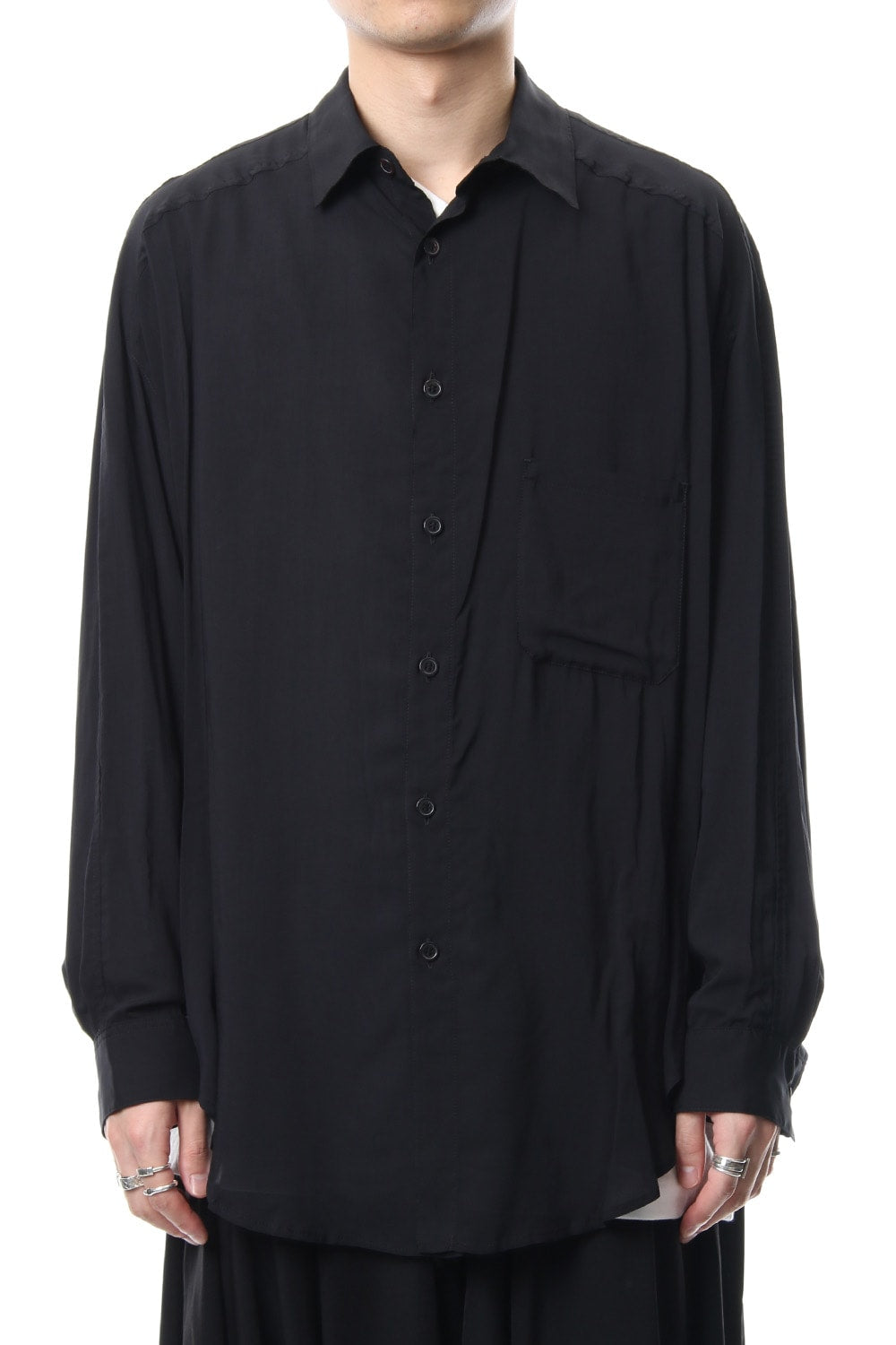 ベーシックなシャツの表情ながら、前がレギュラー、後ろがロングと段違いの丈になったレーヨンスパンローンのシャツです。前後の丈の違いを生かしたレイヤードスタイルを楽しんでいただけます。軽やかな落ち感の生地が特徴です。