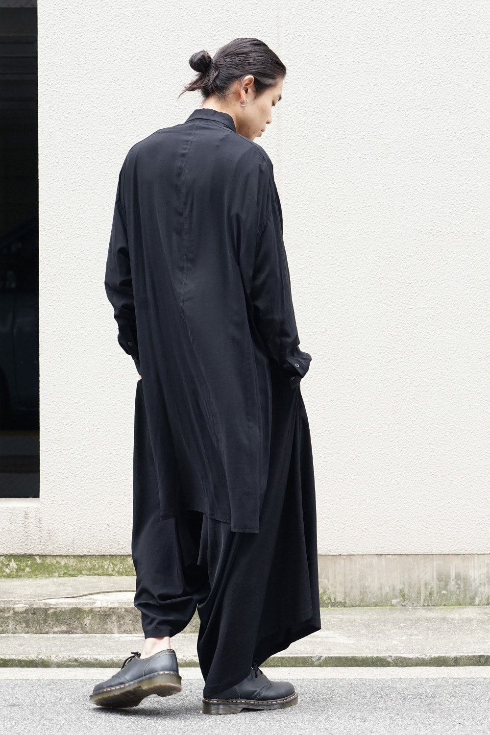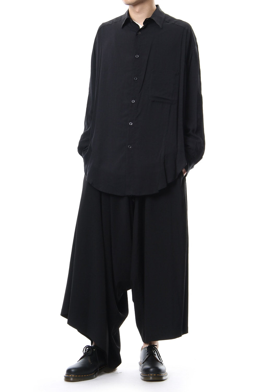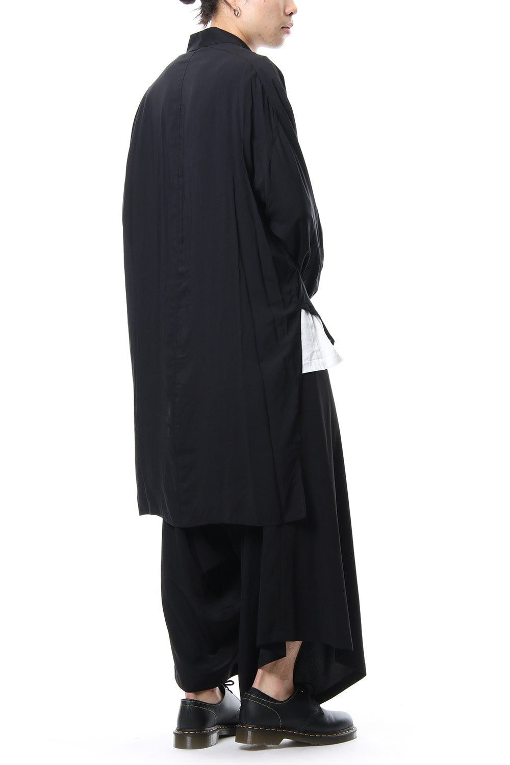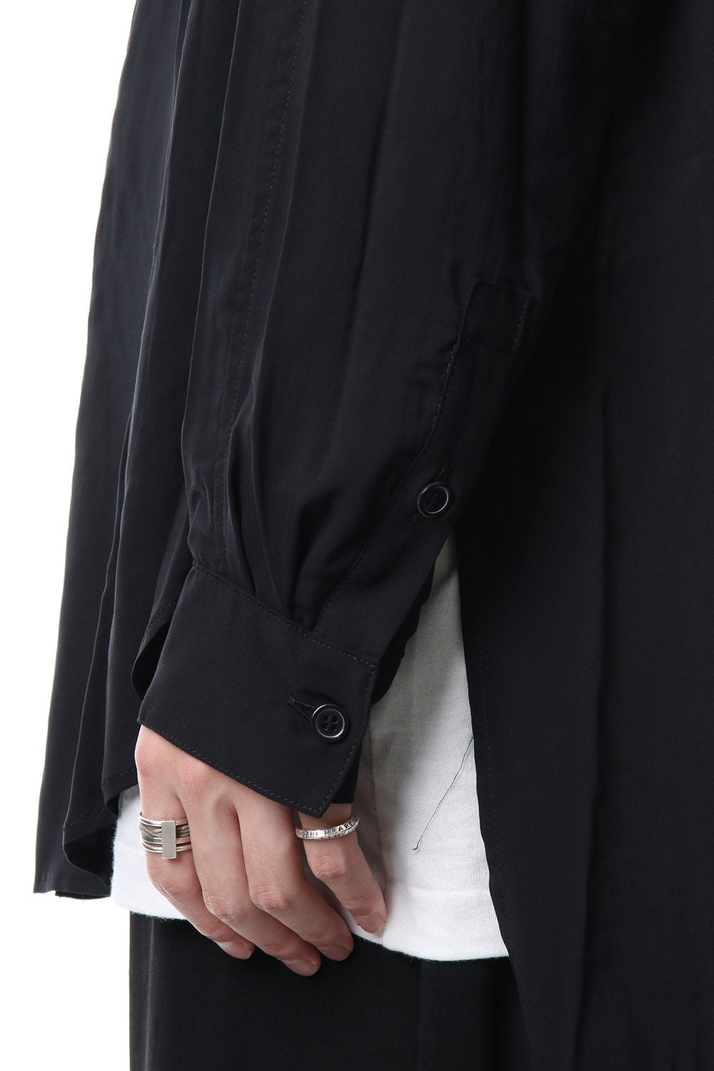 ベーシックなシャツの表情ながら、前がレギュラー、後ろがロングと段違いの丈になったレーヨンスパンローンのシャツです。前後の丈の違いを生かしたレイヤードスタイルを楽しんでいただけます。軽やかな落ち感の生地が特徴です。