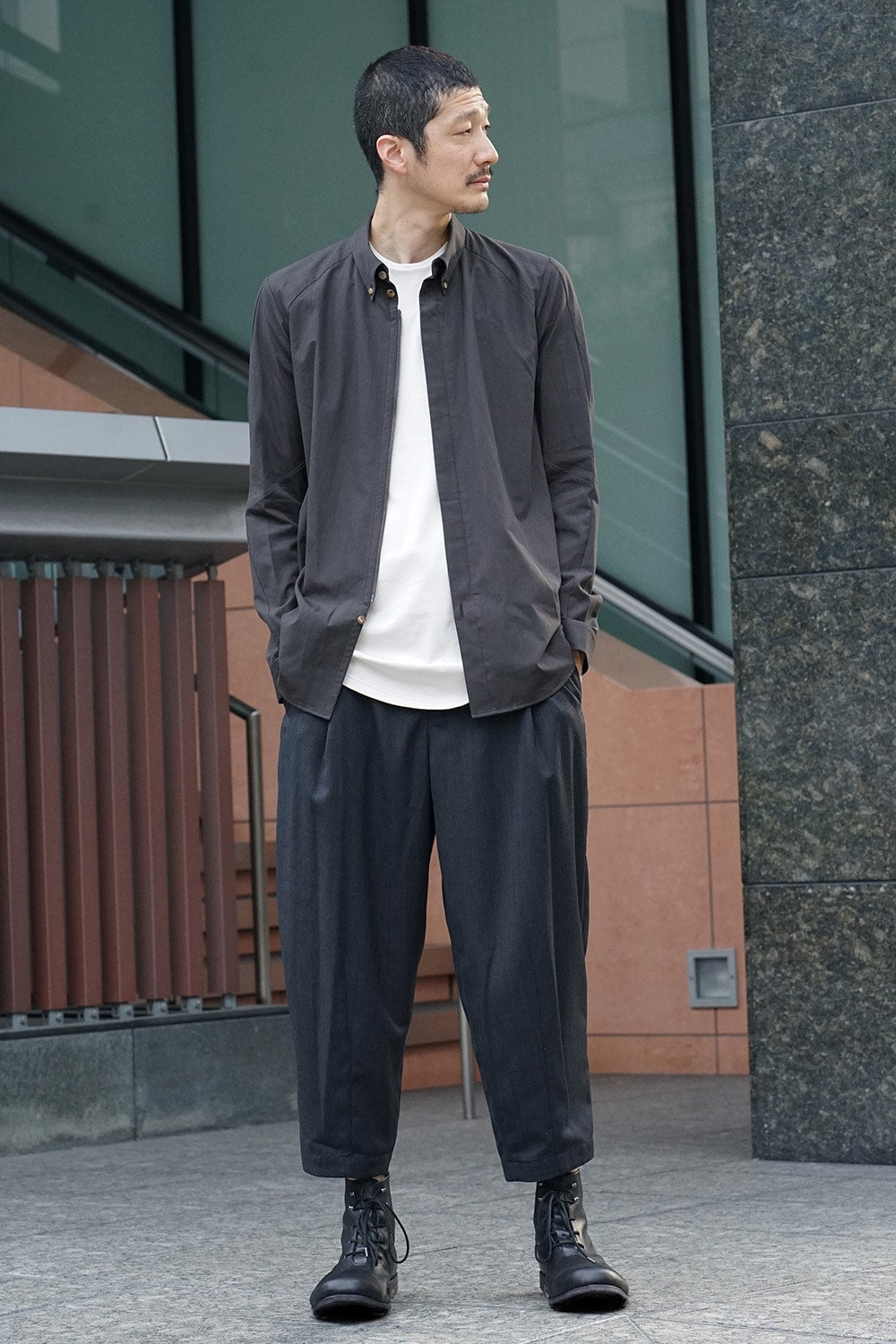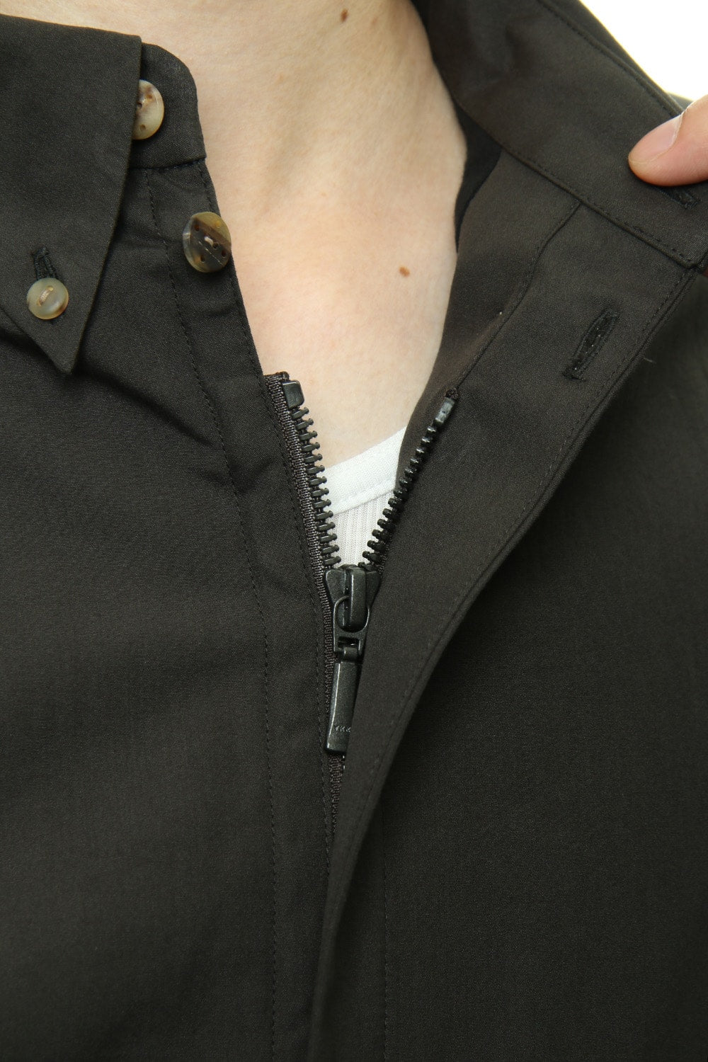 エジプト綿と、シーアイランドコットンを交配し、 改良を重ねて生まれたFINX種を使用。繊維の長さ、強さ、繊細さは、他のコットンに比べてとてもすぐれています。 シルエットはレギュラーフィット、フロントは比翼でファスナー仕様です。 カラーはBlack、white Gray、Dark Khakiの3色展開です。