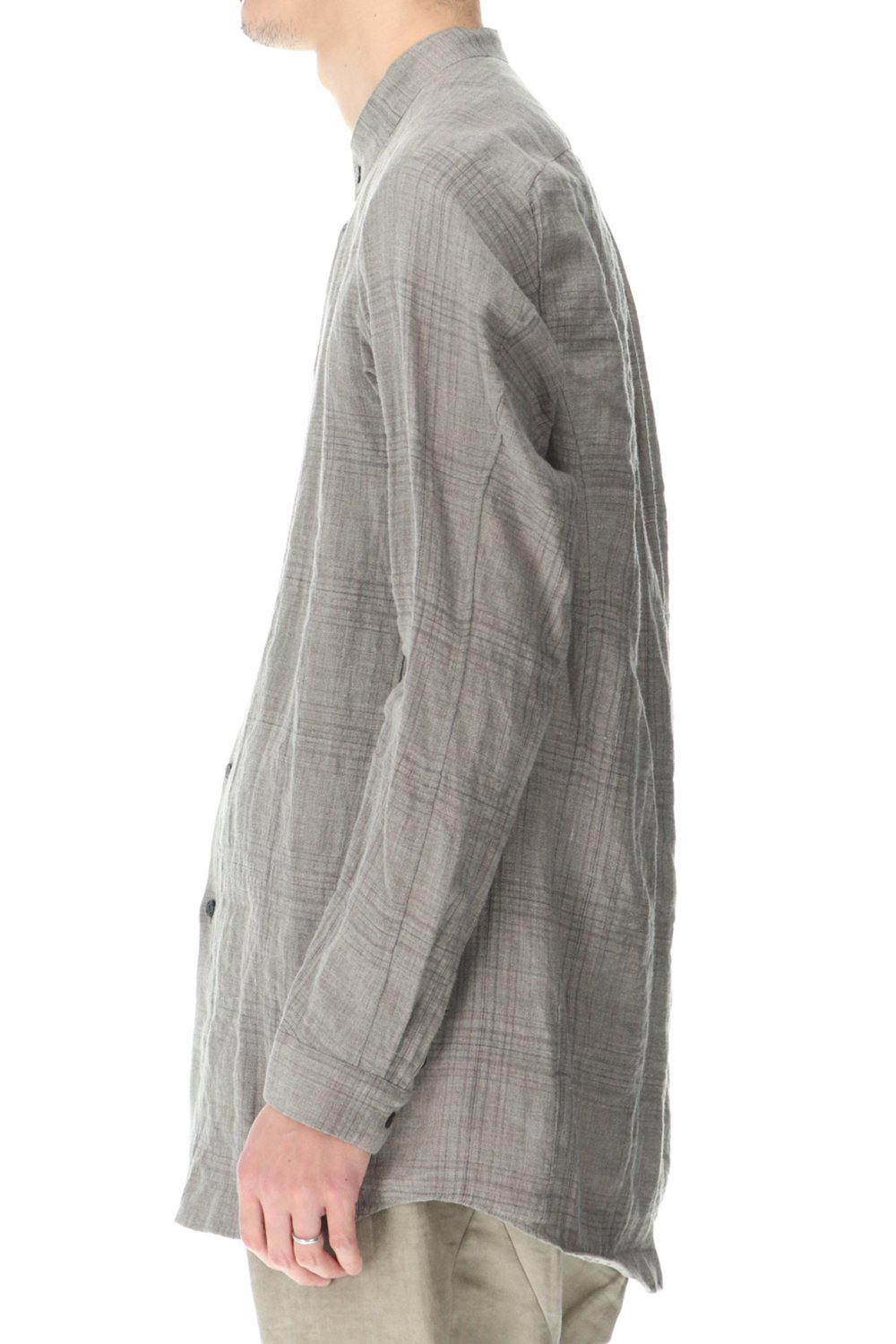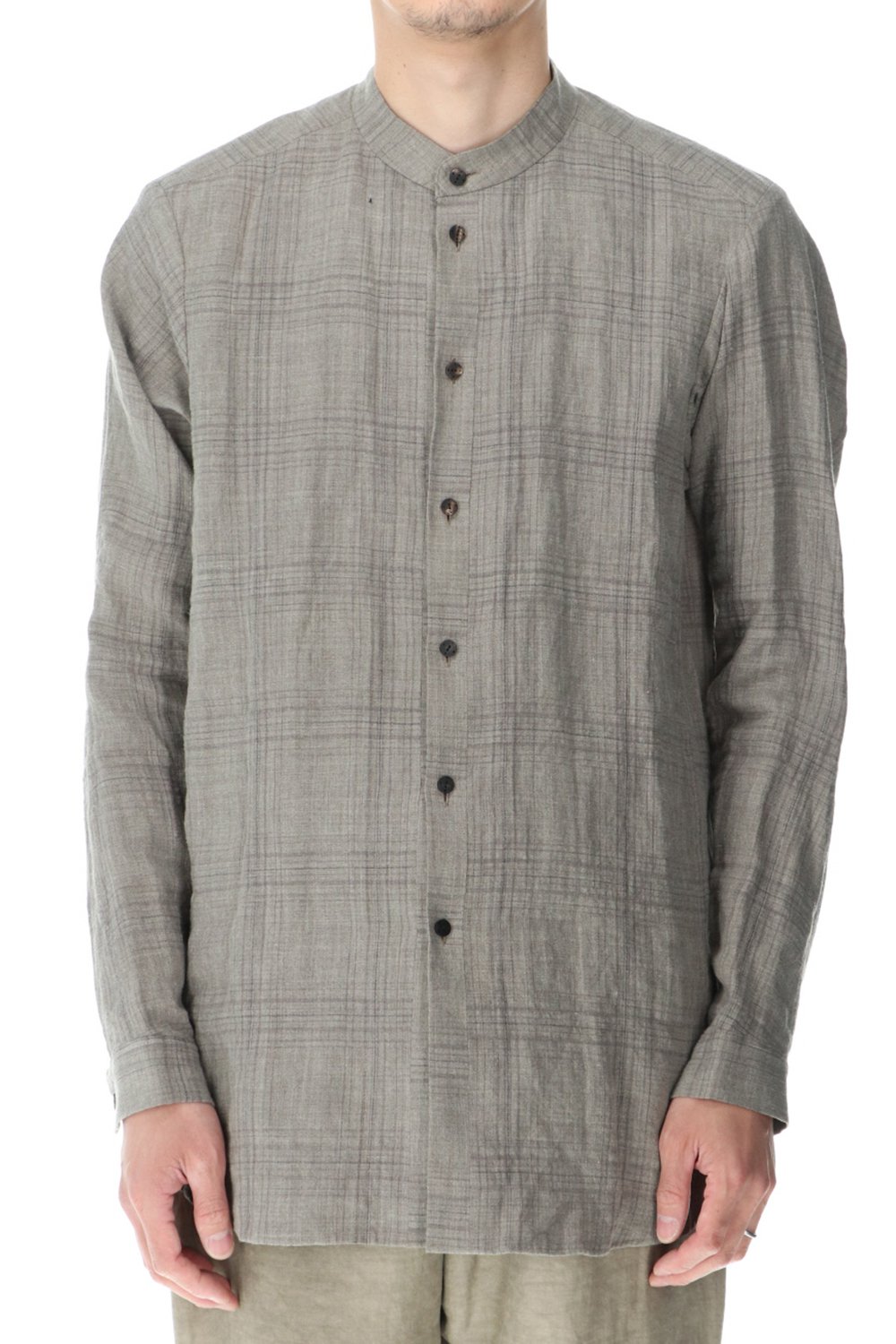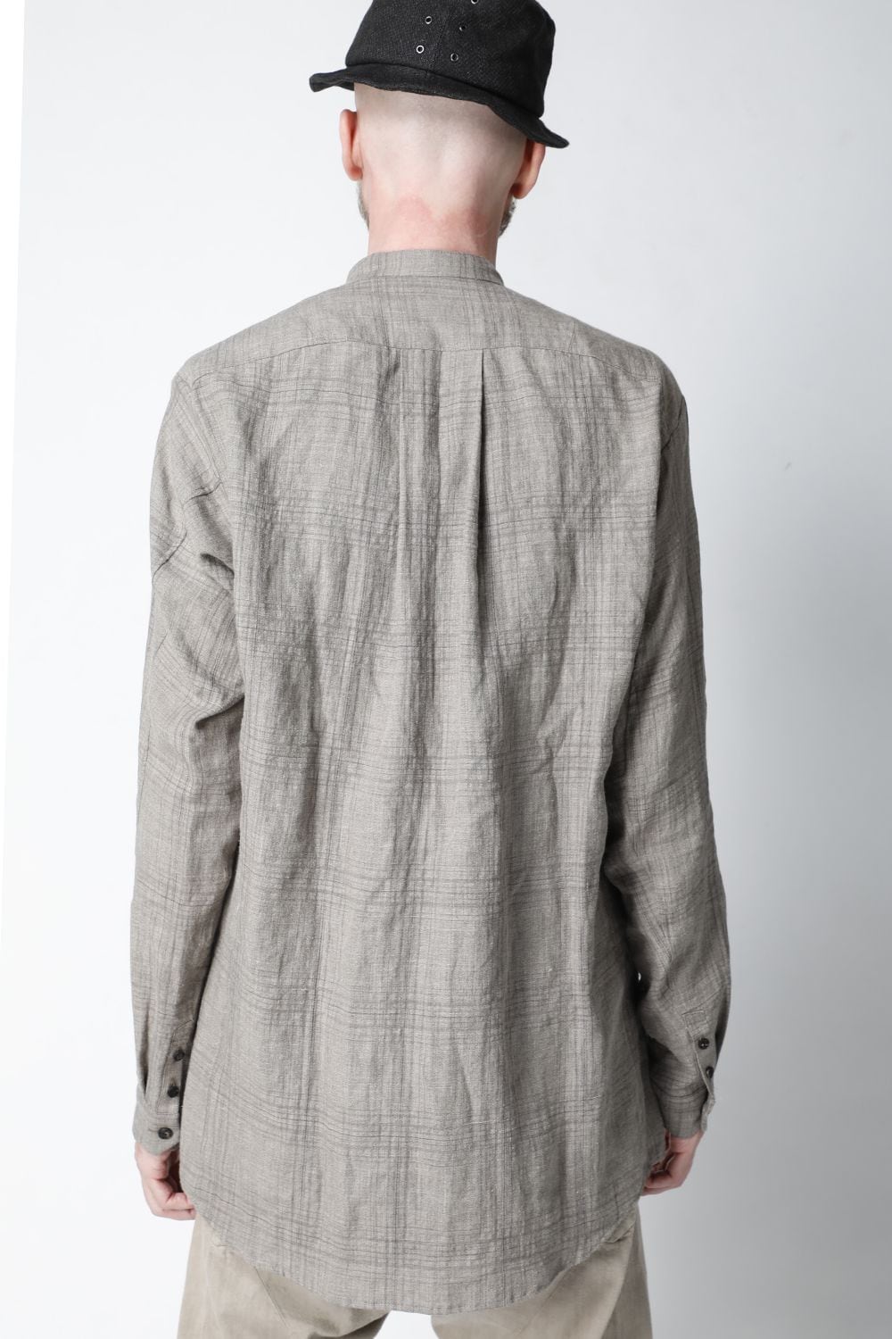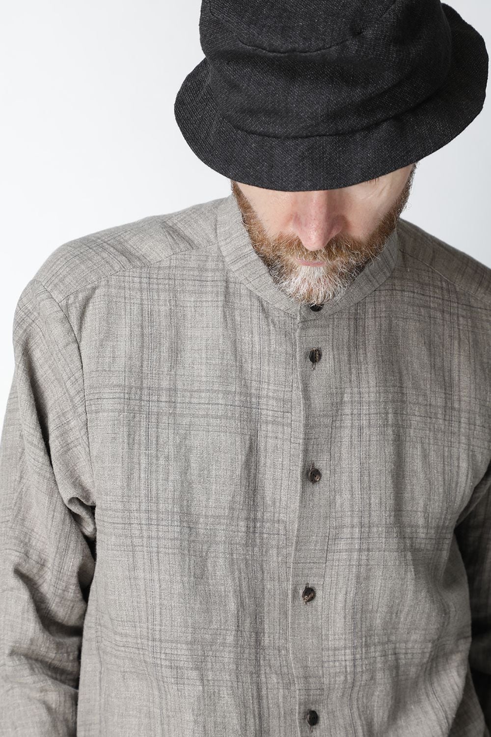 リネン100%の糸でチェック柄を成形。 糸染めした生地に色の奥行をつけるために低温染めでオーバーダイ、そのあとにシリコン加工を施し、リネン本来の反発性を高め、着古した生地の風合いを作っています。シルエットは着丈を長めに設定し、ゆとりのあるリラックスフィットで制作。ボタンは水牛のパラシュートボタン仕様。くすみのあるアースカラーとかすれたような雰囲気のチェック柄も特徴的です。この生地はマオカラーとレギュラータイプの2種類で作成。