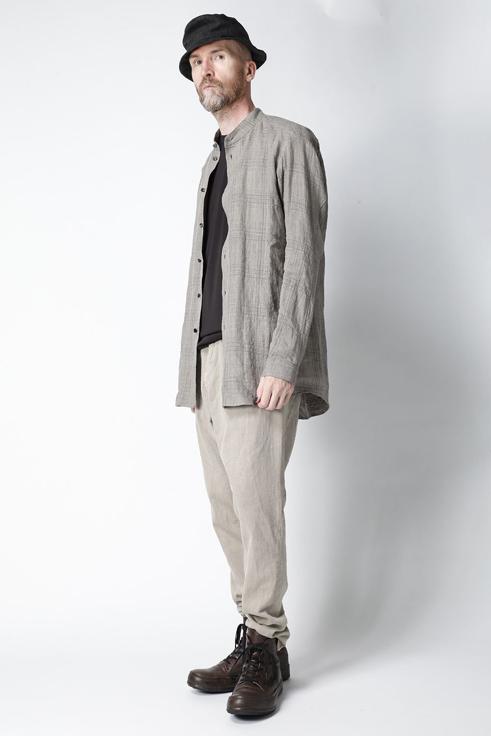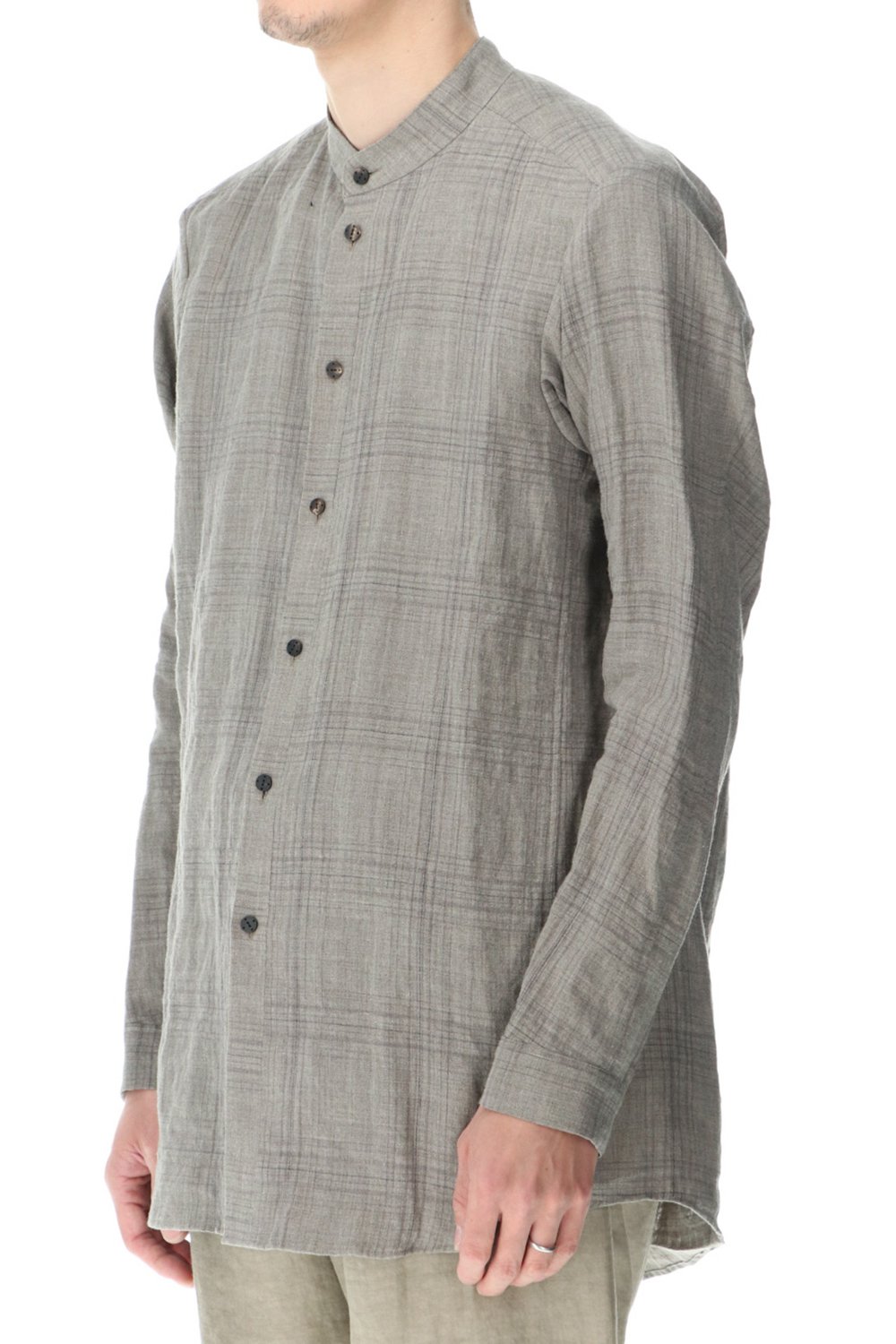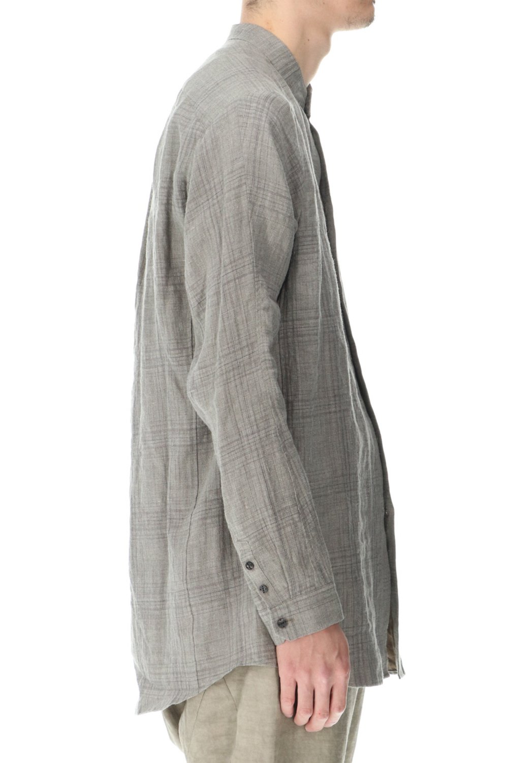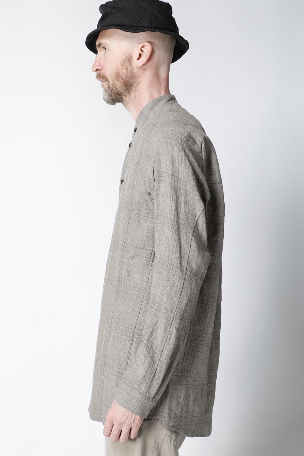 リネン100%の糸でチェック柄を成形。 糸染めした生地に色の奥行をつけるために低温染めでオーバーダイ、そのあとにシリコン加工を施し、リネン本来の反発性を高め、着古した生地の風合いを作っています。シルエットは着丈を長めに設定し、ゆとりのあるリラックスフィットで制作。ボタンは水牛のパラシュートボタン仕様。くすみのあるアースカラーとかすれたような雰囲気のチェック柄も特徴的です。この生地はマオカラーとレギュラータイプの2種類で作成。