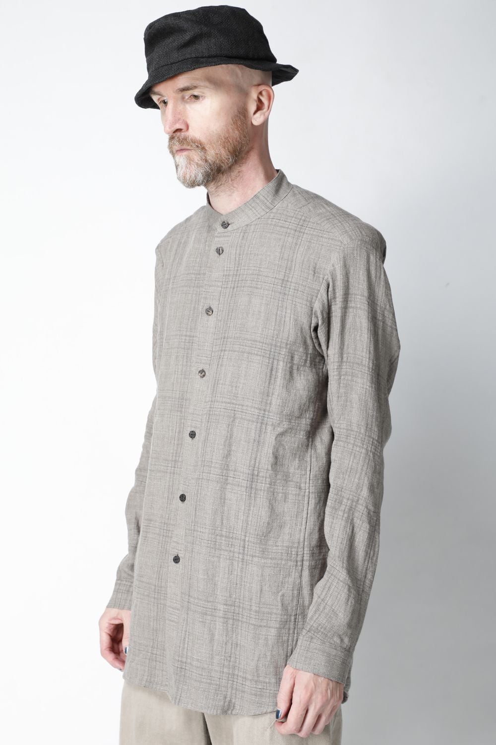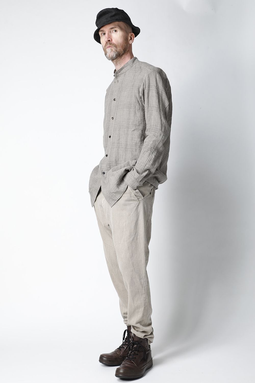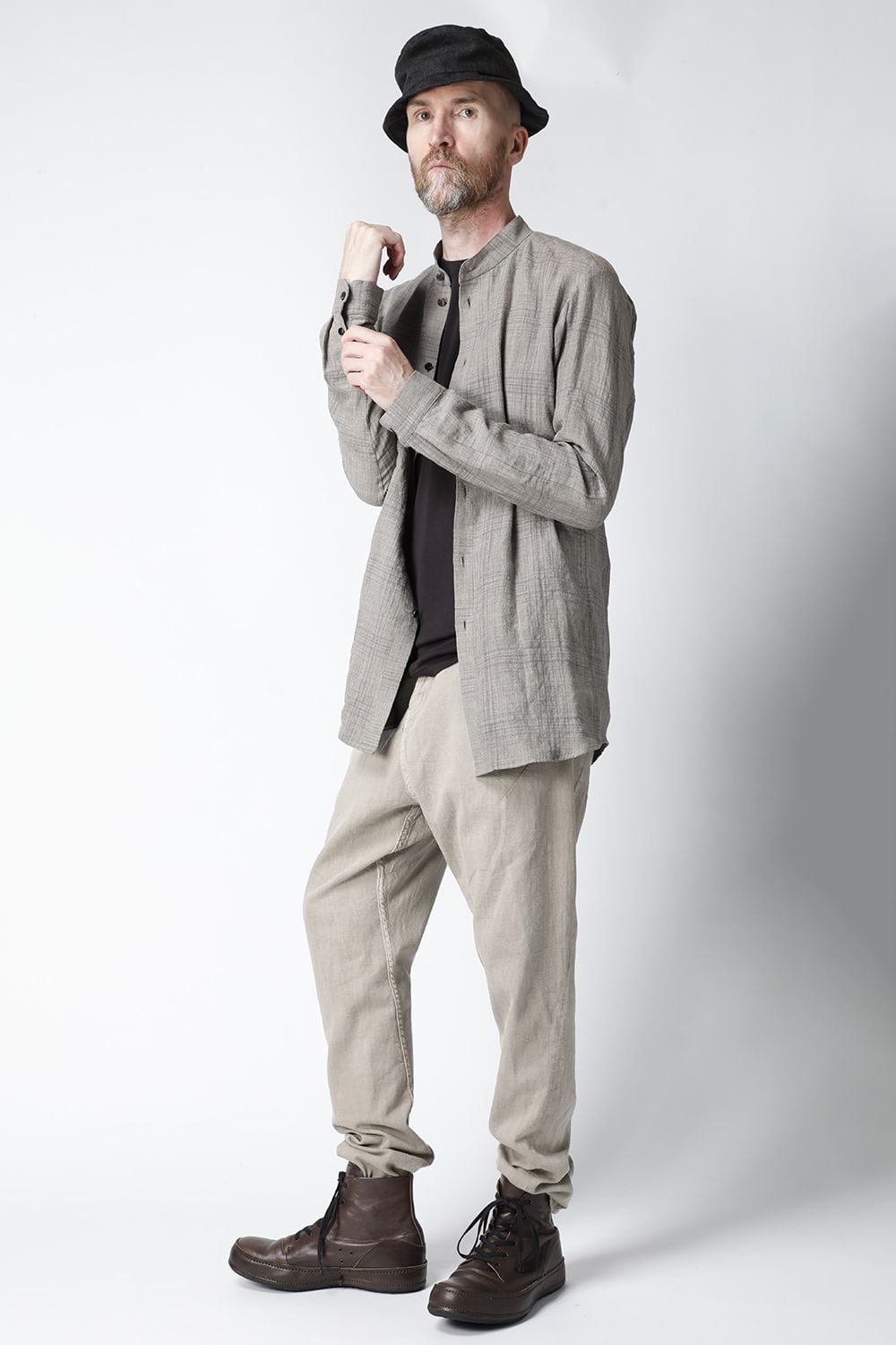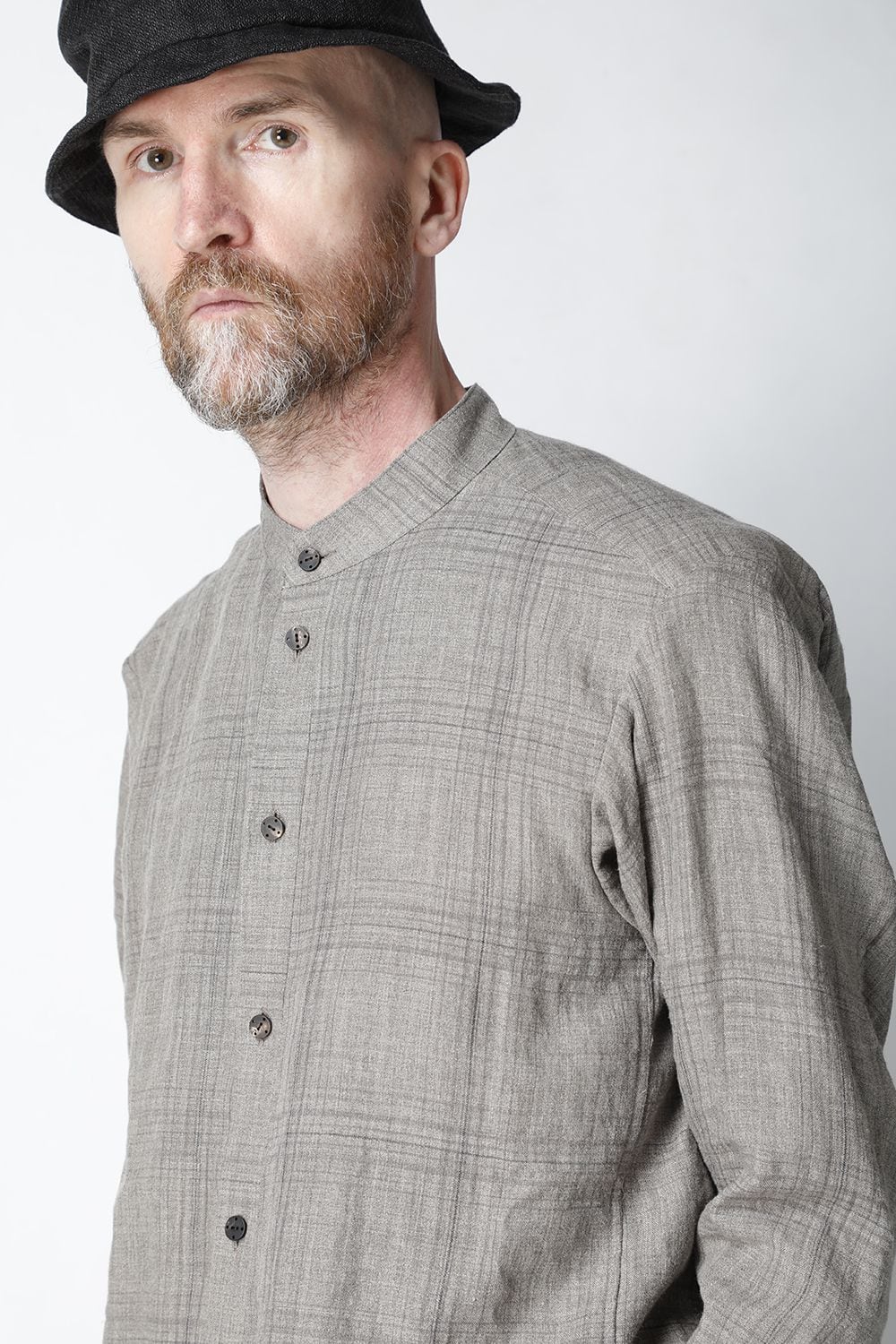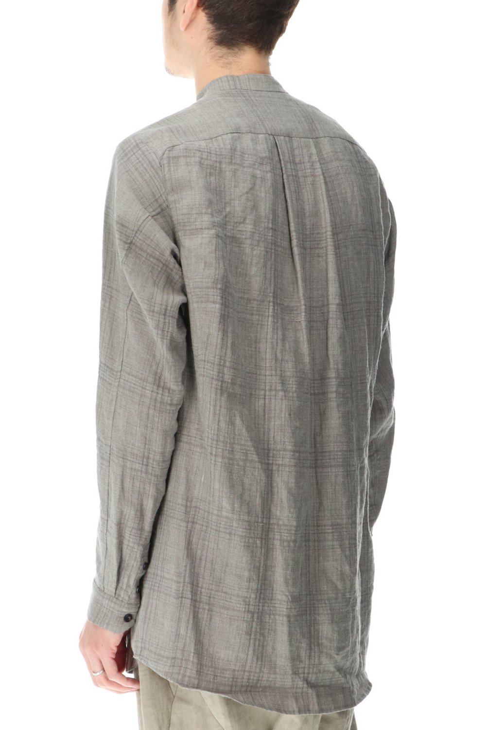 リネン100%の糸でチェック柄を成形。 糸染めした生地に色の奥行をつけるために低温染めでオーバーダイ、そのあとにシリコン加工を施し、リネン本来の反発性を高め、着古した生地の風合いを作っています。シルエットは着丈を長めに設定し、ゆとりのあるリラックスフィットで制作。ボタンは水牛のパラシュートボタン仕様。くすみのあるアースカラーとかすれたような雰囲気のチェック柄も特徴的です。この生地はマオカラーとレギュラータイプの2種類で作成。