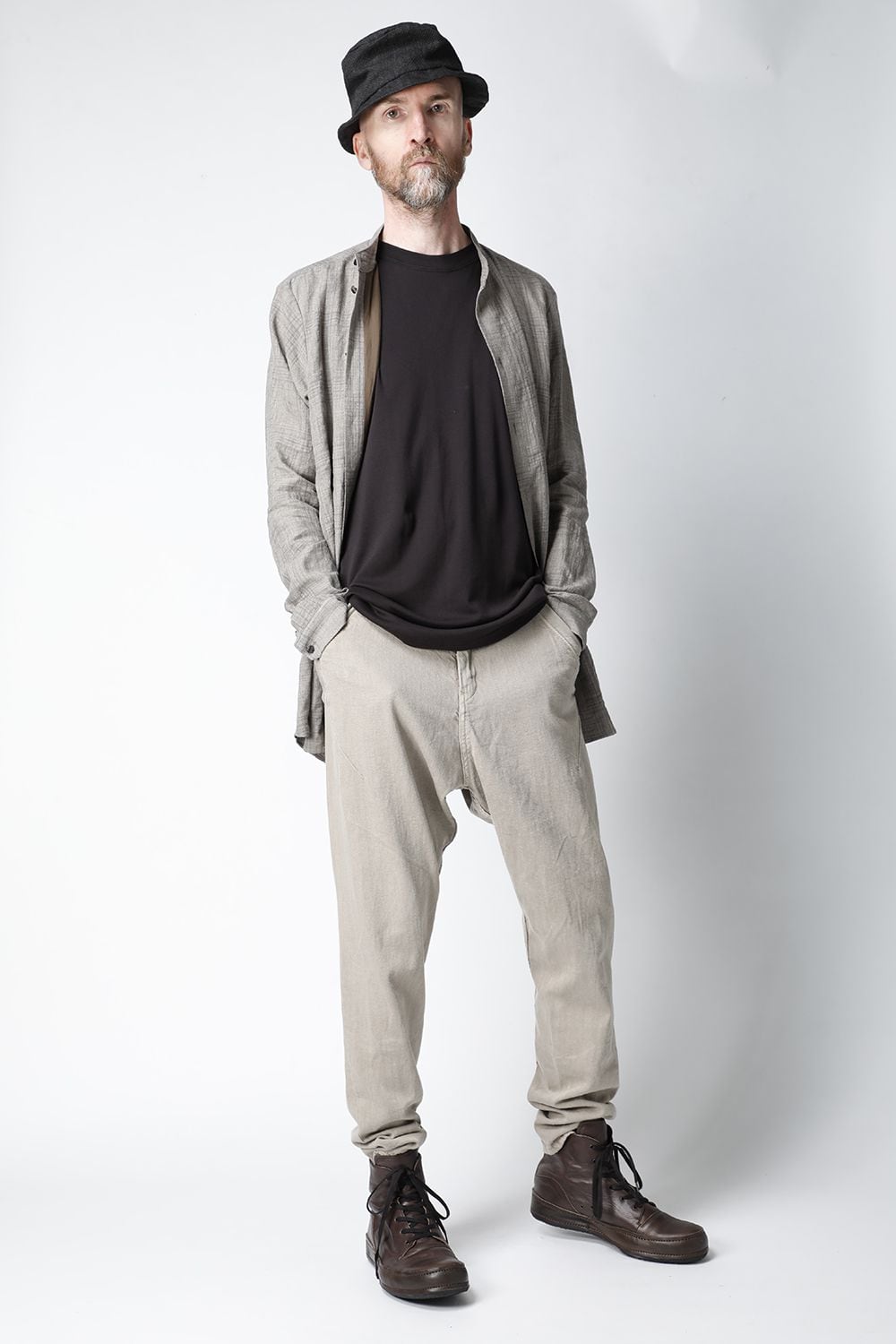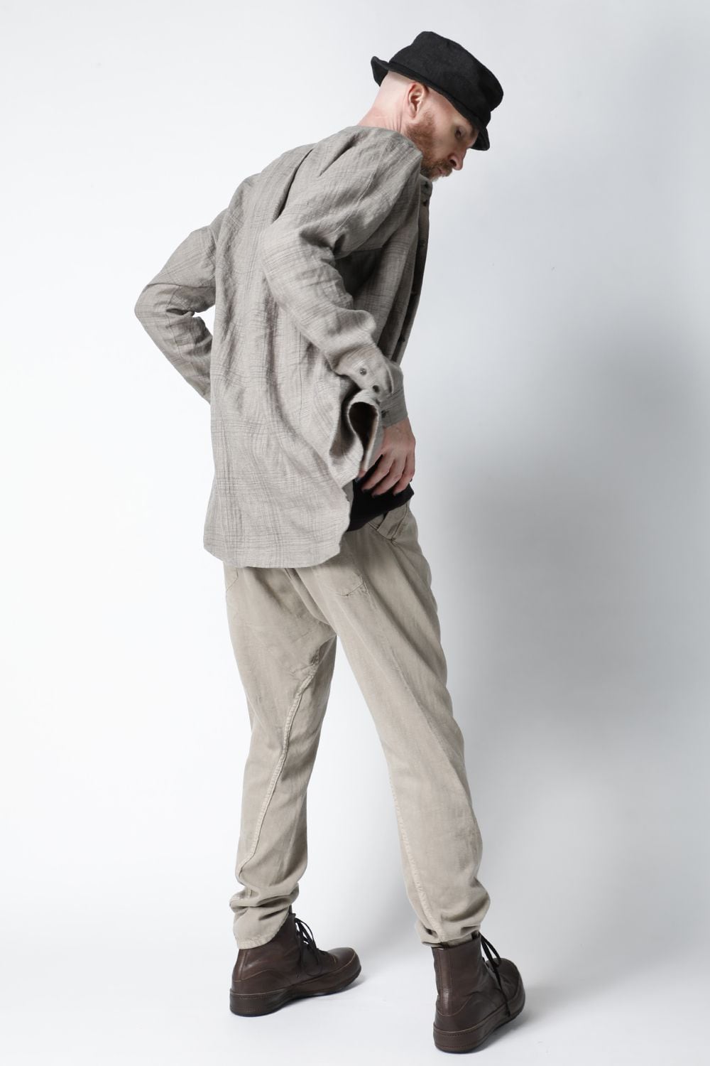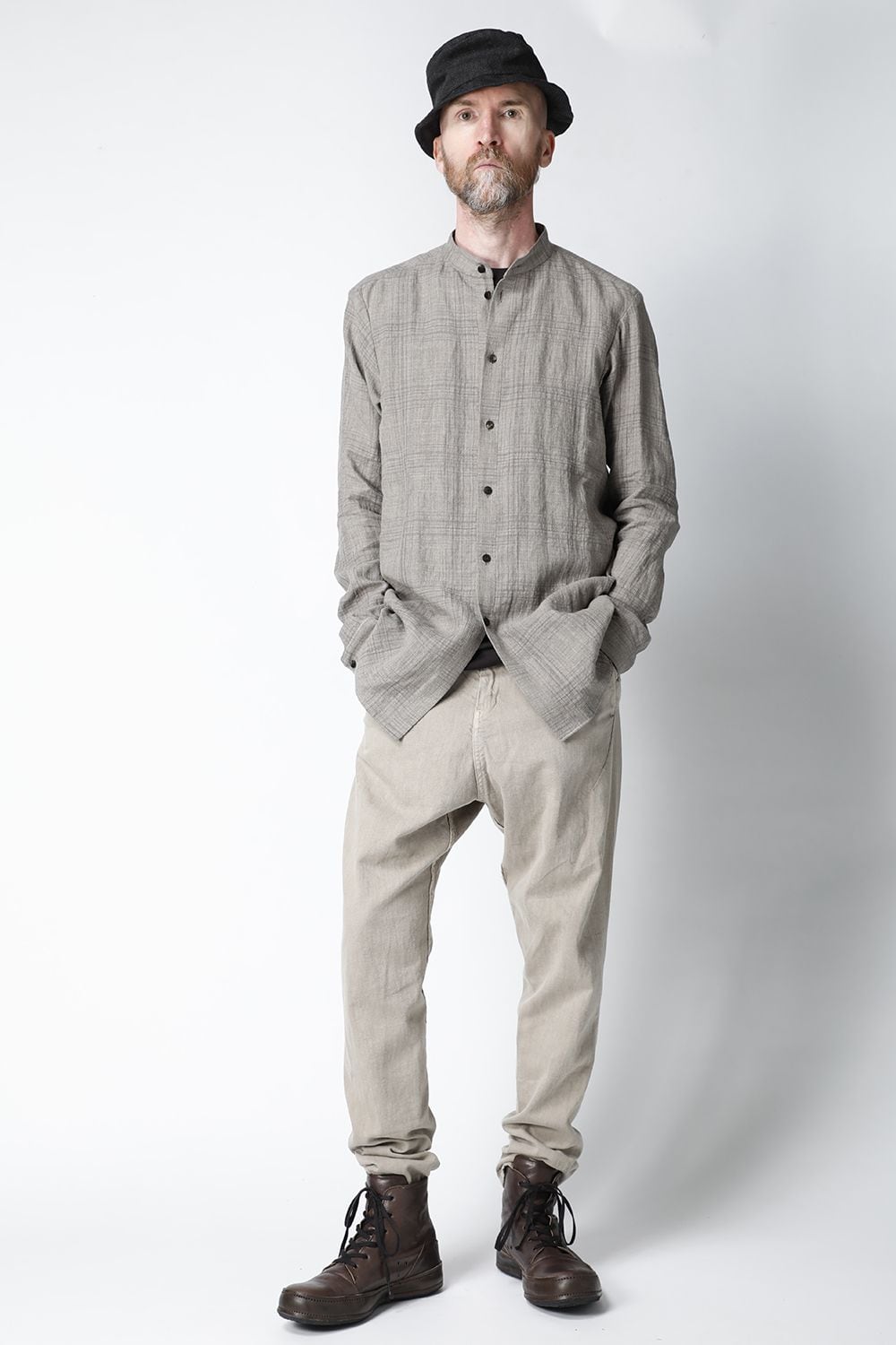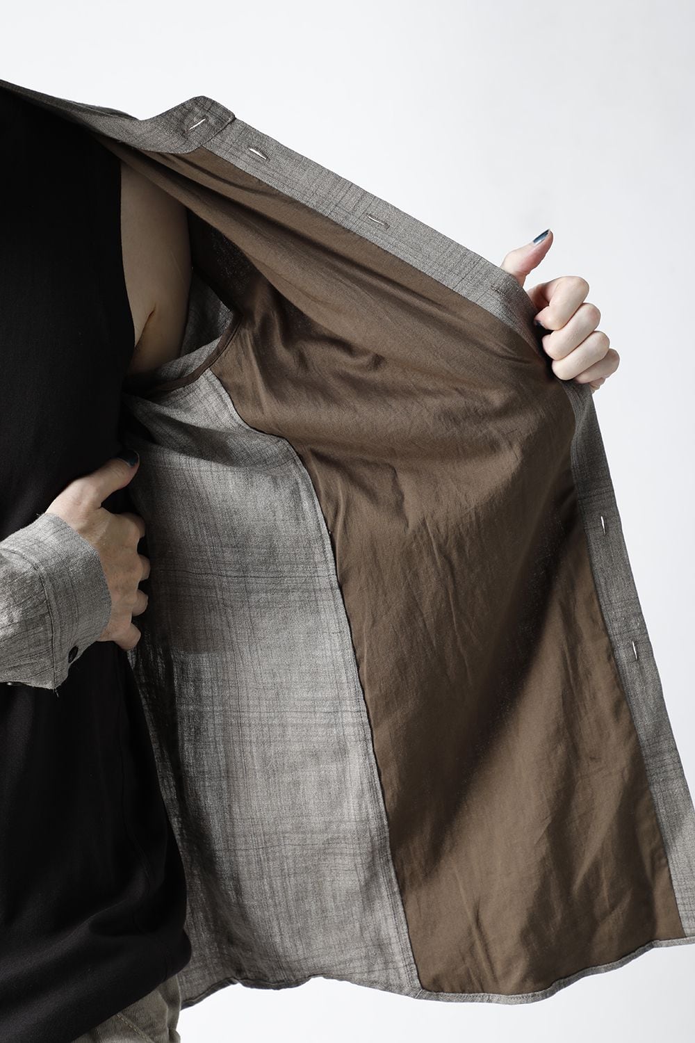 リネン100%の糸でチェック柄を成形。 糸染めした生地に色の奥行をつけるために低温染めでオーバーダイ、そのあとにシリコン加工を施し、リネン本来の反発性を高め、着古した生地の風合いを作っています。シルエットは着丈を長めに設定し、ゆとりのあるリラックスフィットで制作。ボタンは水牛のパラシュートボタン仕様。くすみのあるアースカラーとかすれたような雰囲気のチェック柄も特徴的です。この生地はマオカラーとレギュラータイプの2種類で作成。