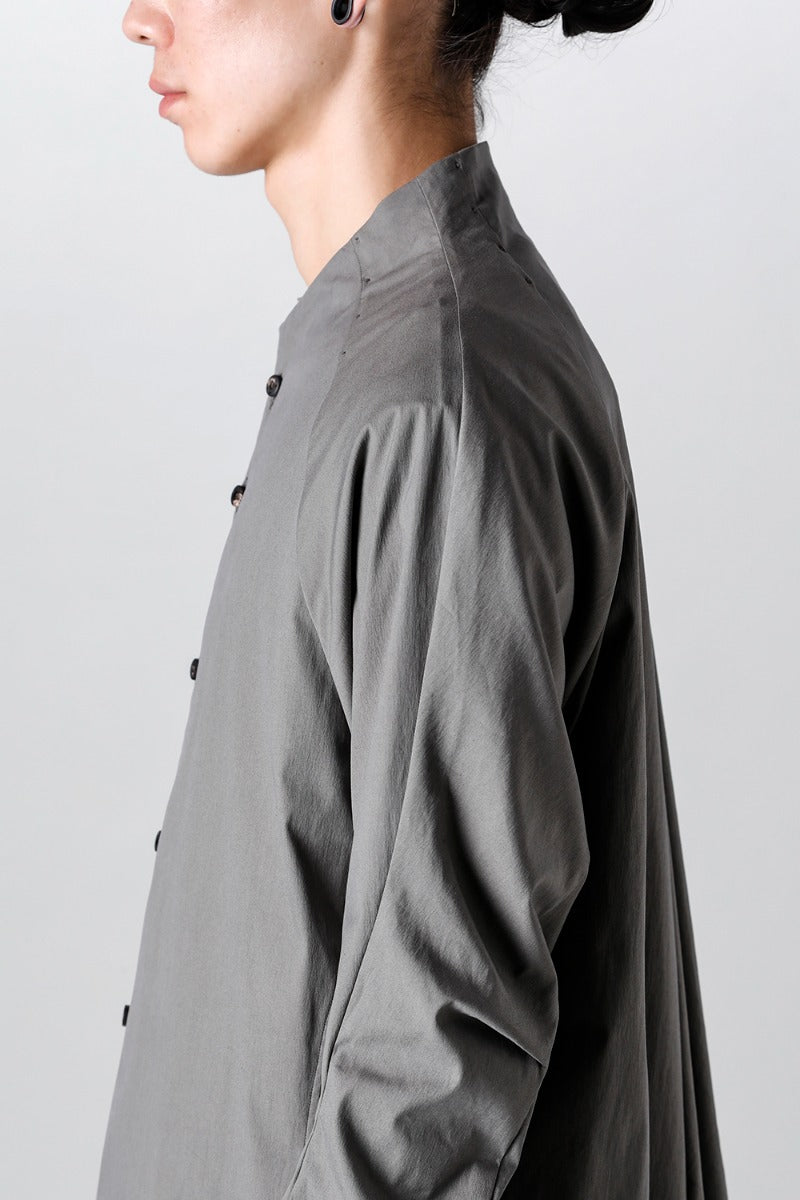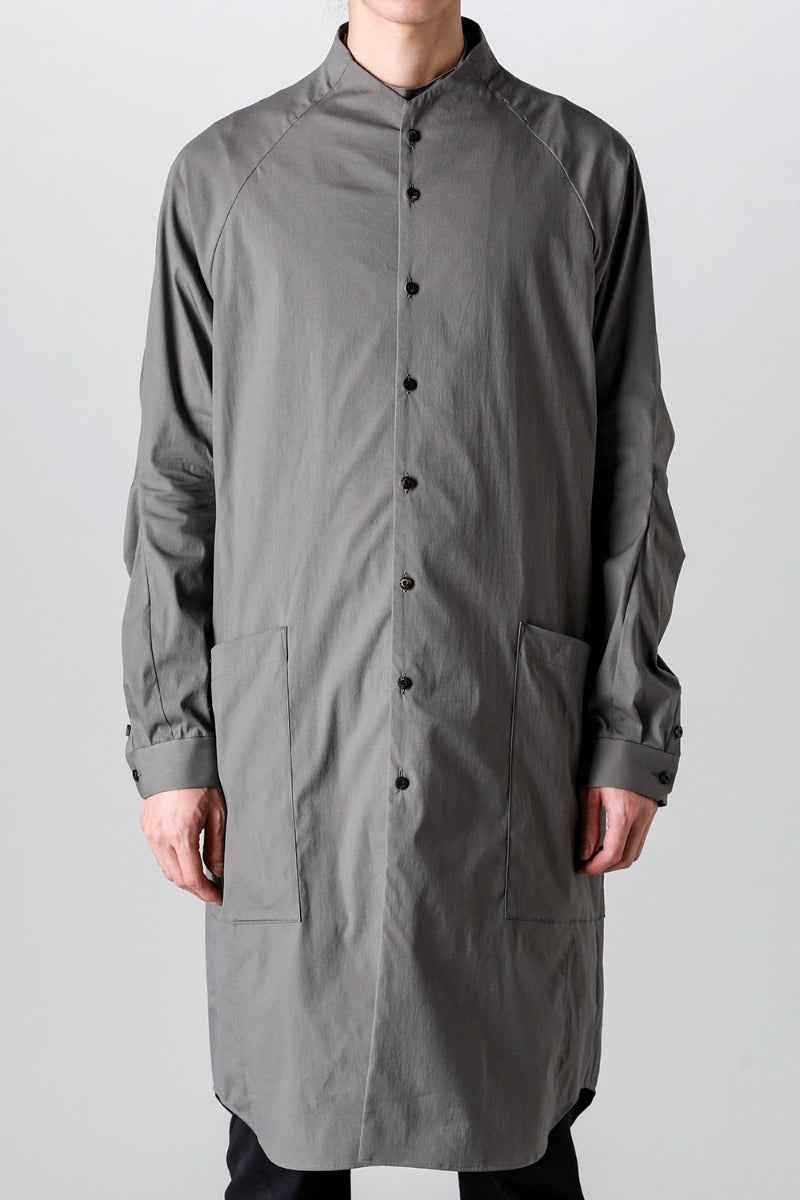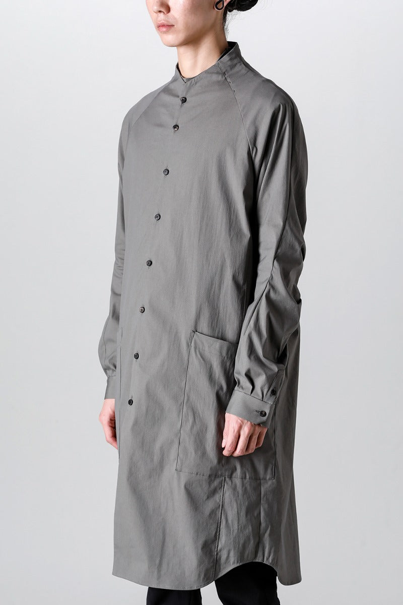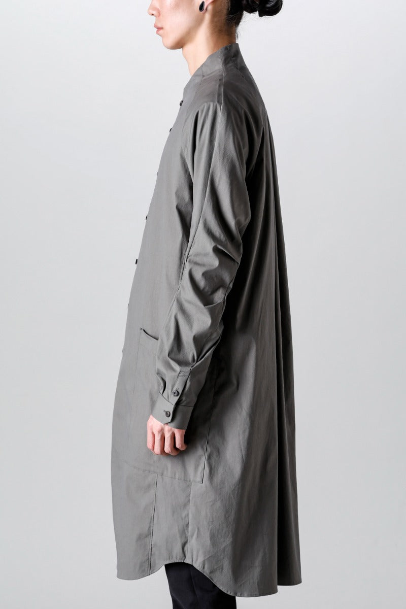 首周りは立体的なパターンで首に沿う形を形成したすっきりとしたノーカラーのラグランスリーブのロングシャツ。