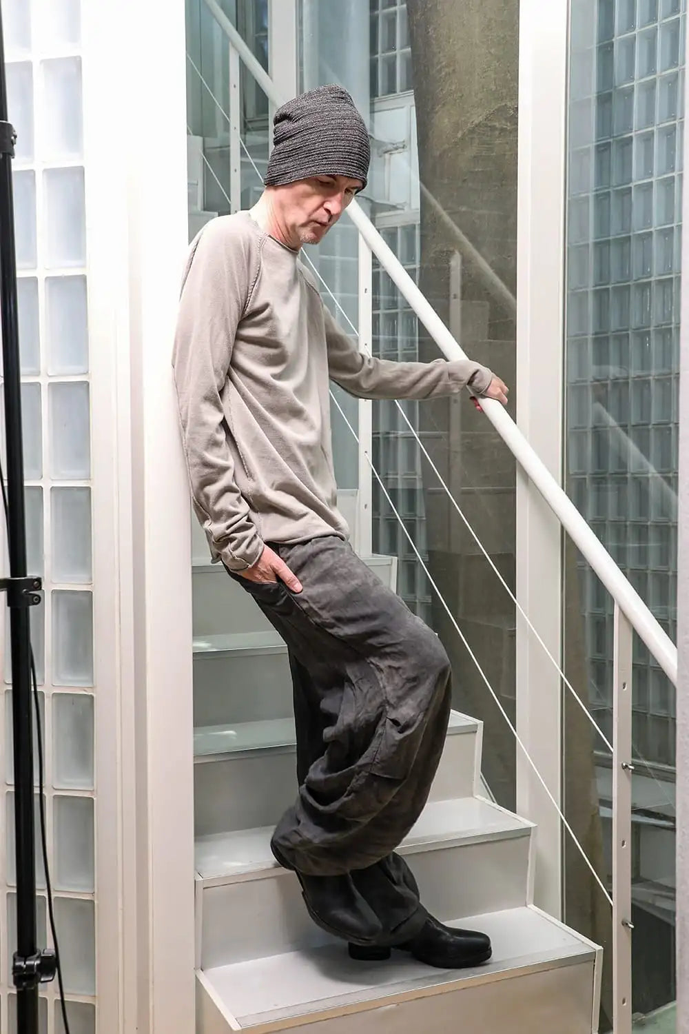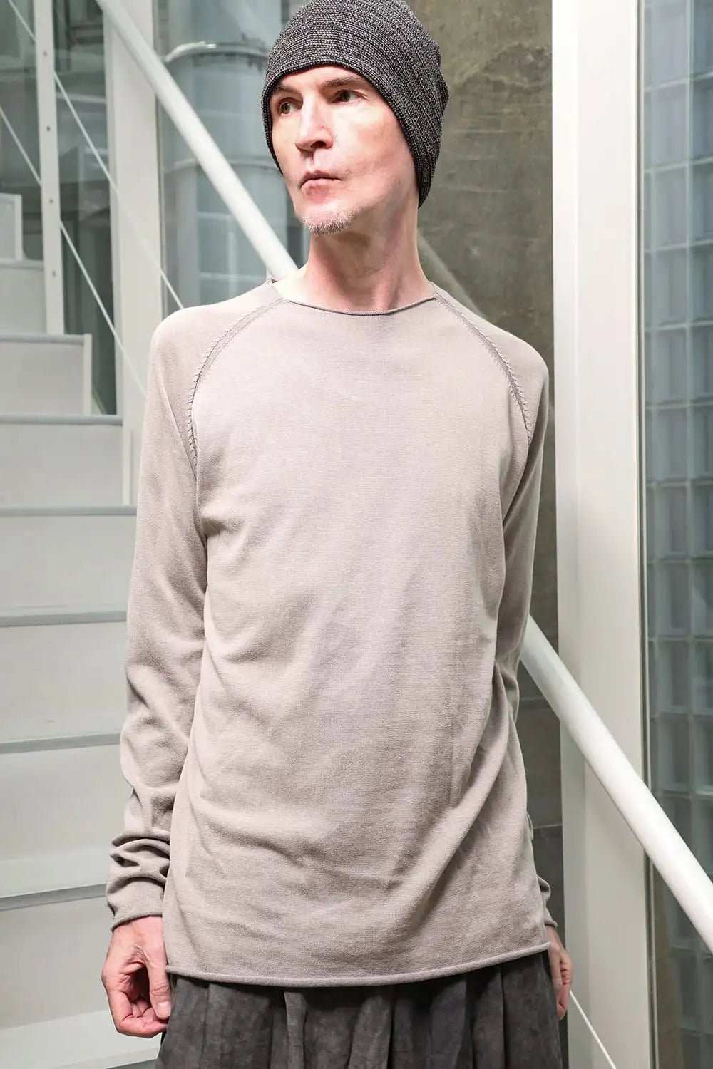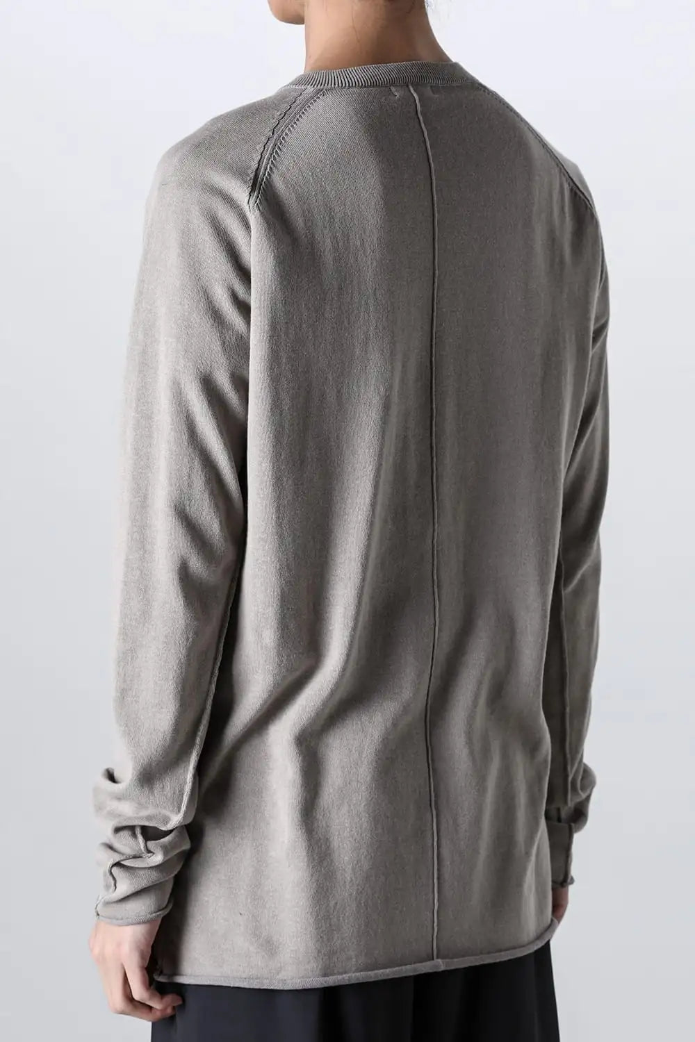 強撚コットン糸を用いたドライタッチな質感で、春夏用に厚みを控えめにして制作しているので、ロングスリーブTシャツ感覚で着用できるニットです。