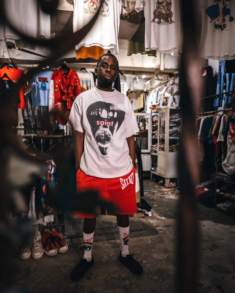フロントとバックにはインパクトのある口元のプリントとキリスト教の言葉で使用されるサクラメント(キリスト教において神の見えない恩寵を具体的に見える形で表す事)をふまえた「THIS IS NO DRUG IT'S A SACRAMENT」のメッセージプリントを施しています。