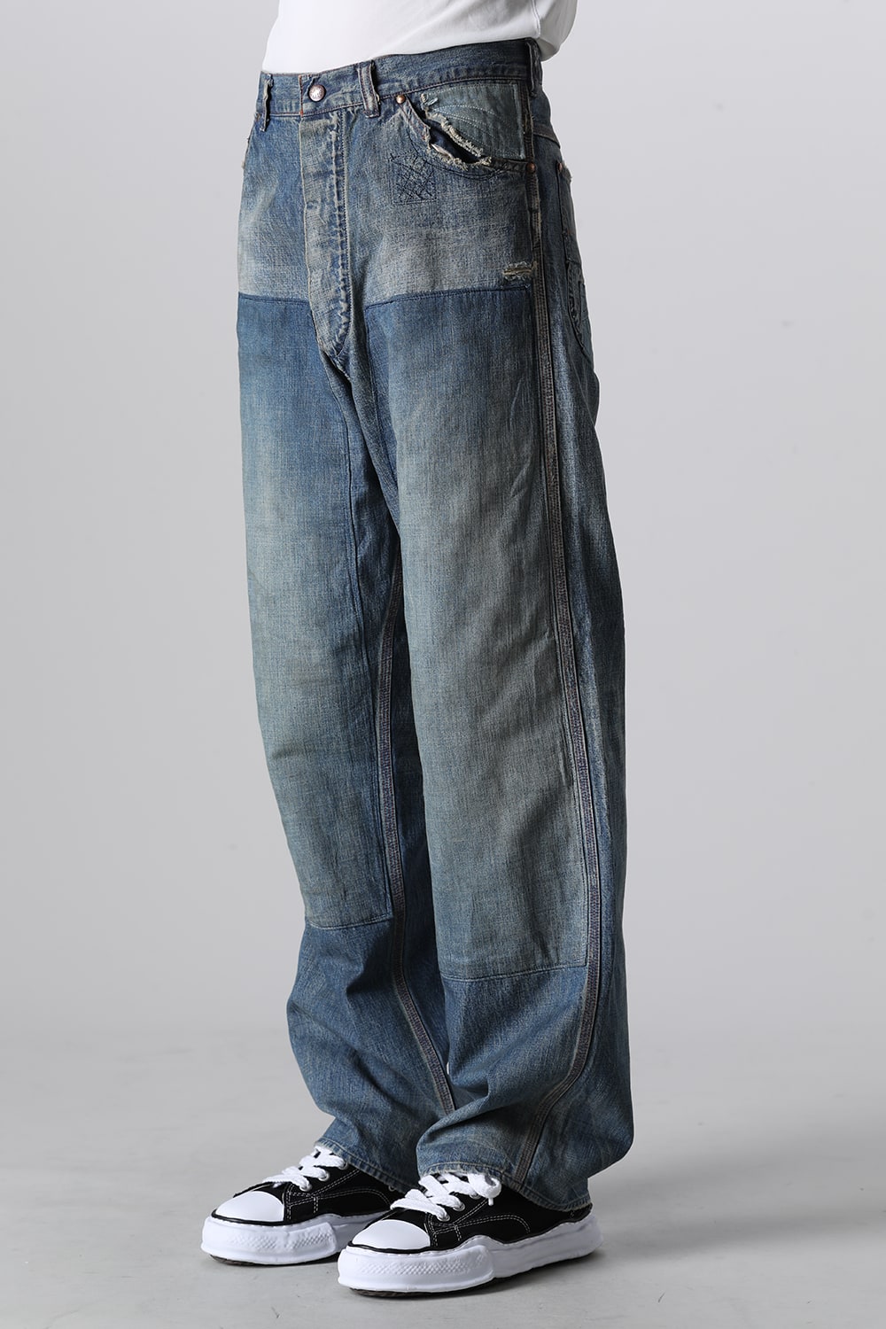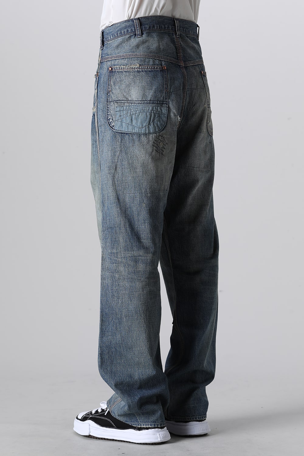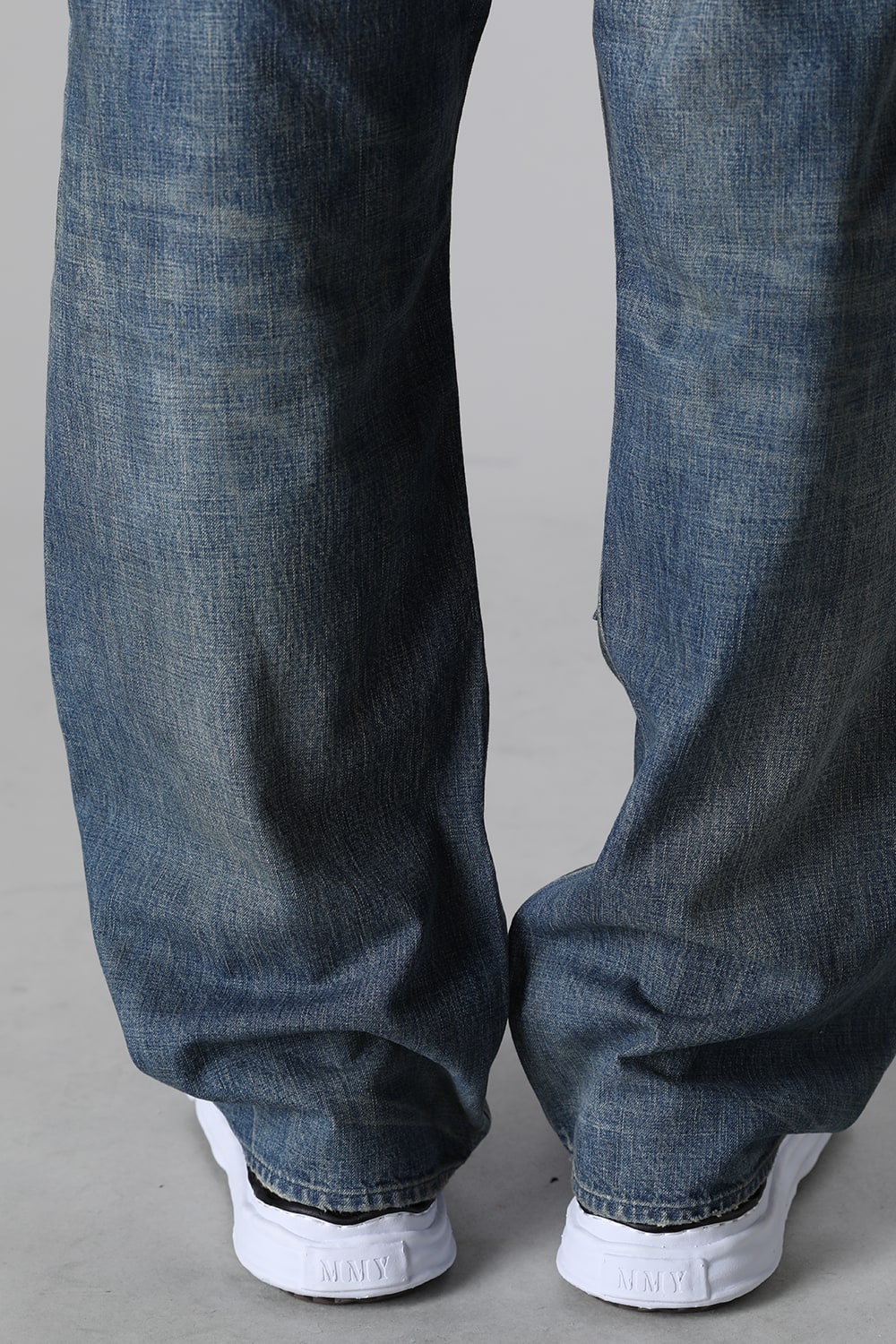ゆとりのあるワイドよりのシルエットを採用し、随所にダメージ加工が施された1本です。