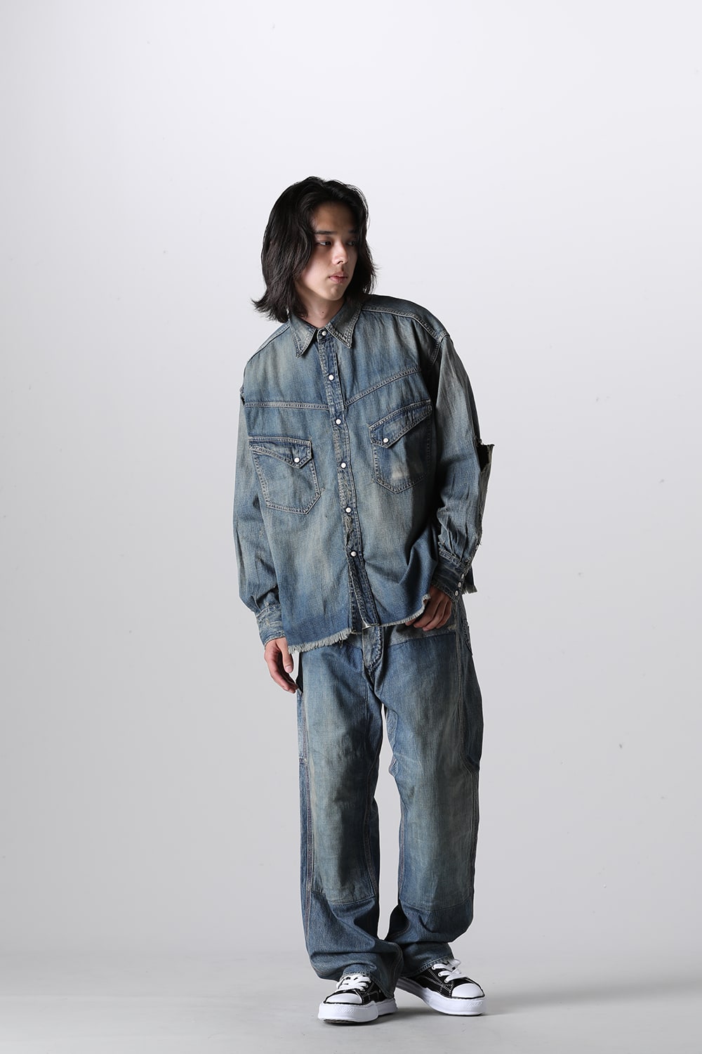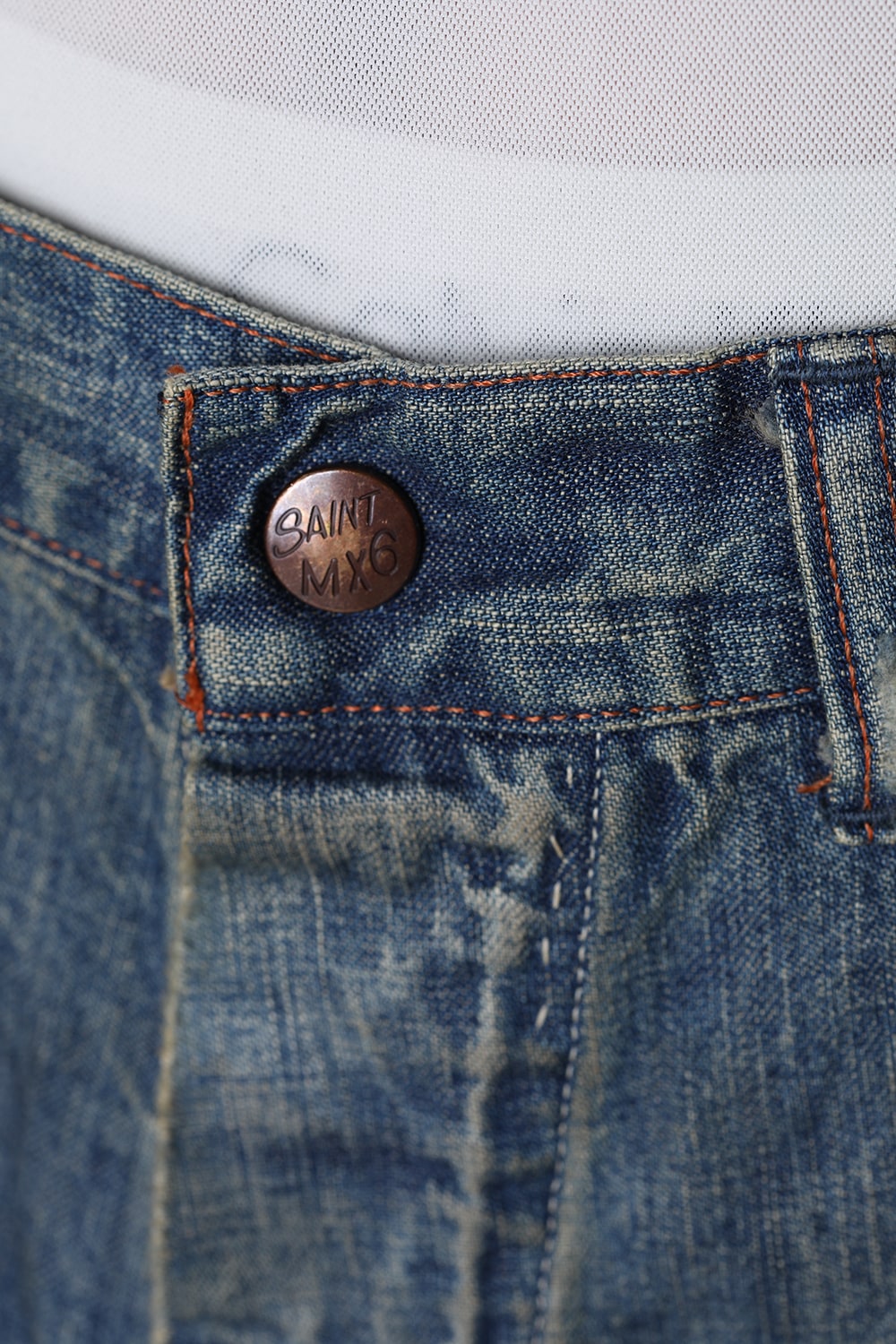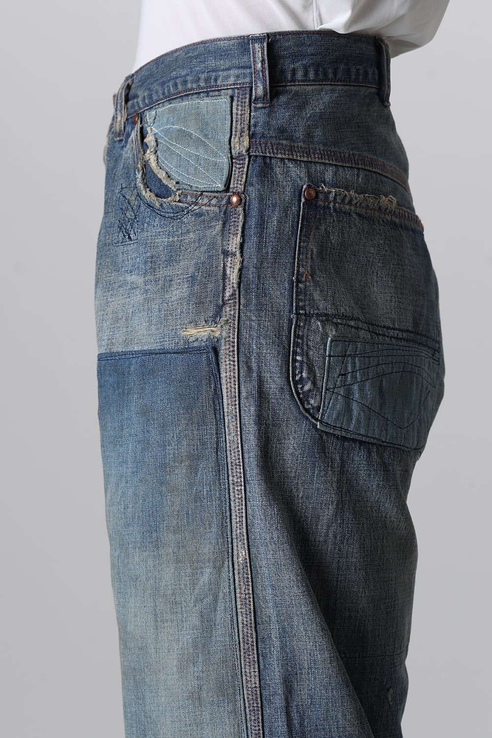 ゆとりのあるワイドよりのシルエットを採用し、随所にダメージ加工が施された1本です。