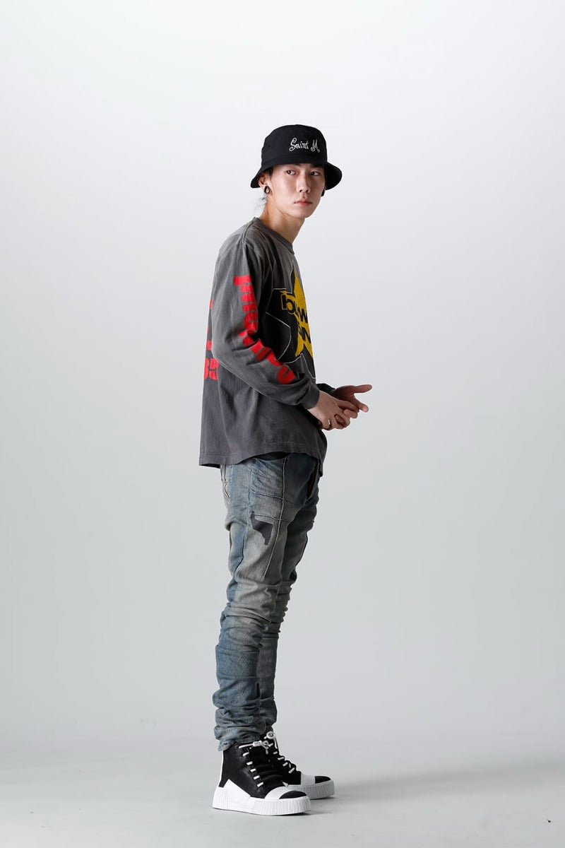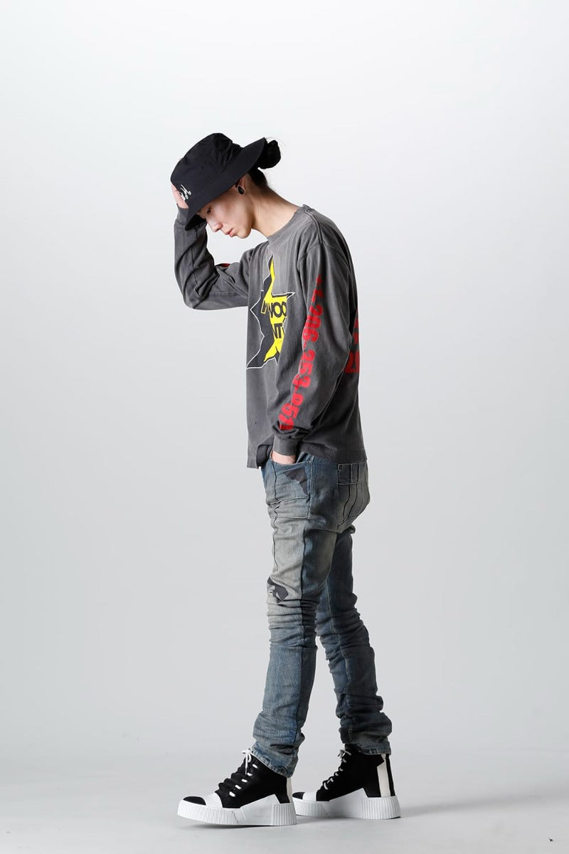 ポップな星のグラフィックにフォントプリントを施したメッセージ性の感じるロングスリーブTシャツ。