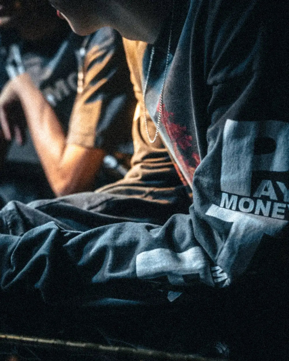 写真をそのままプリントしたようなリアルなファイヤーパターンパターンにペイ・マネー・トゥ・マイ ペインのロゴマークを随所に落とし込んだコラボレーションならではの1着。