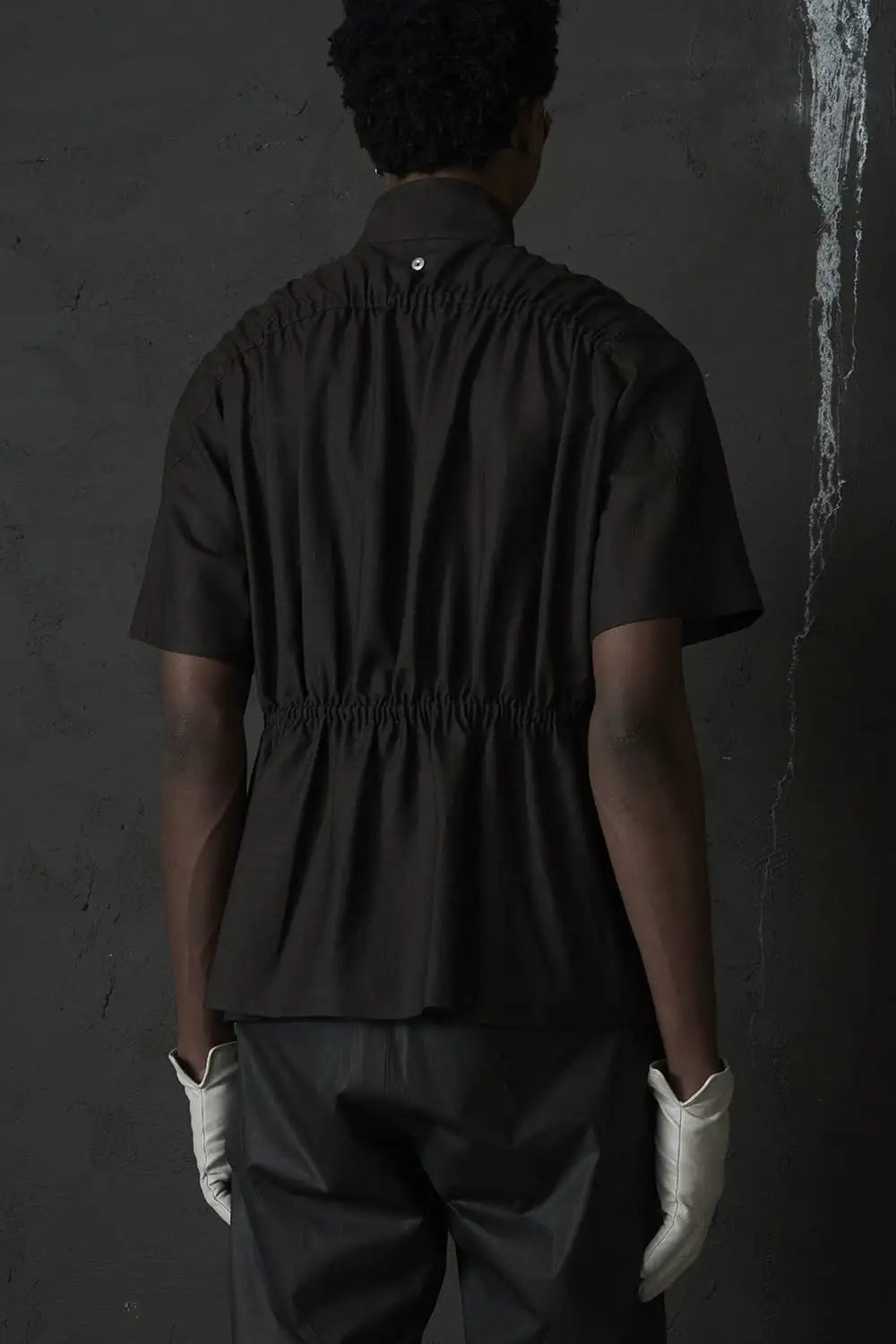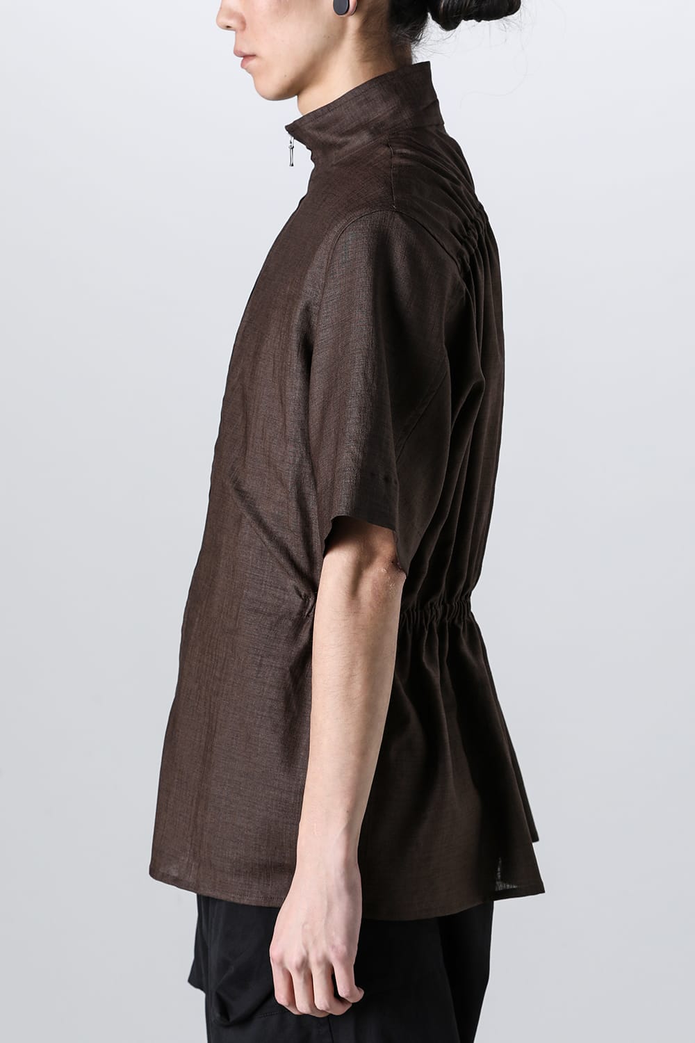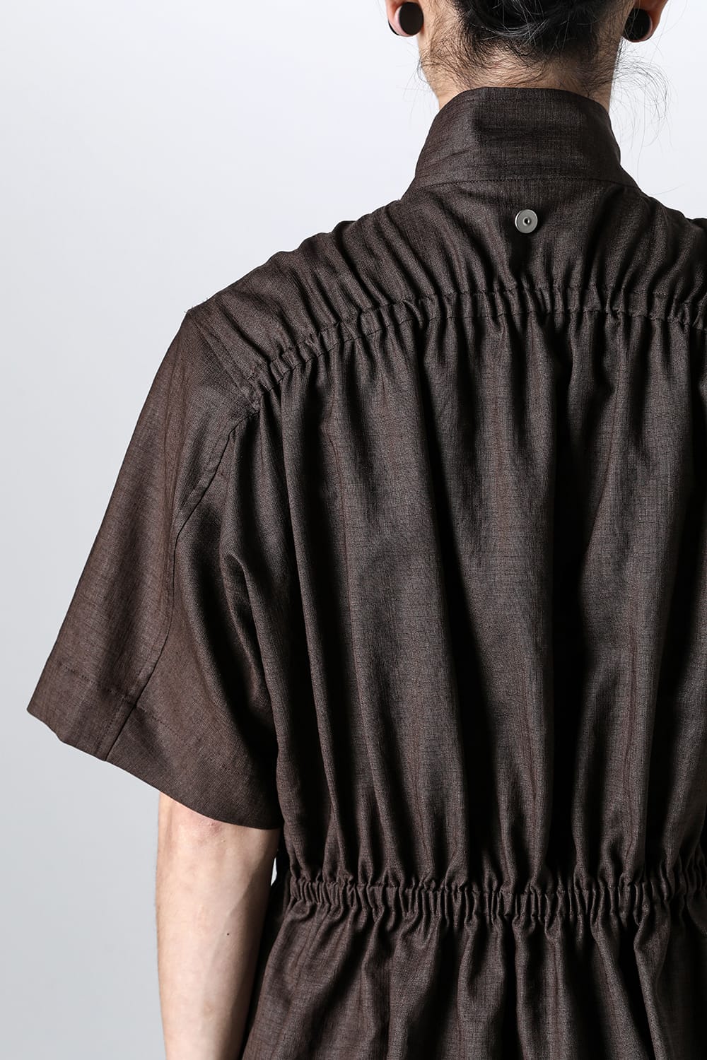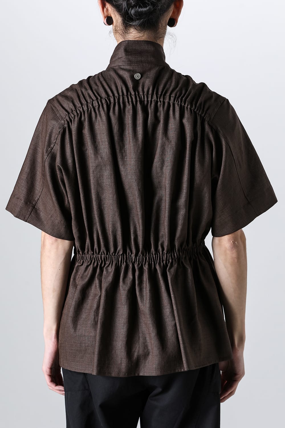・後身頃には生地分量を多く取りながら、ヨーク下とウエスト部分の生地にゴム入りのギャザーデザインを入れ、着用時のストレスを回避しながら前後の身頃デザインにコントラストをつけたデザイン