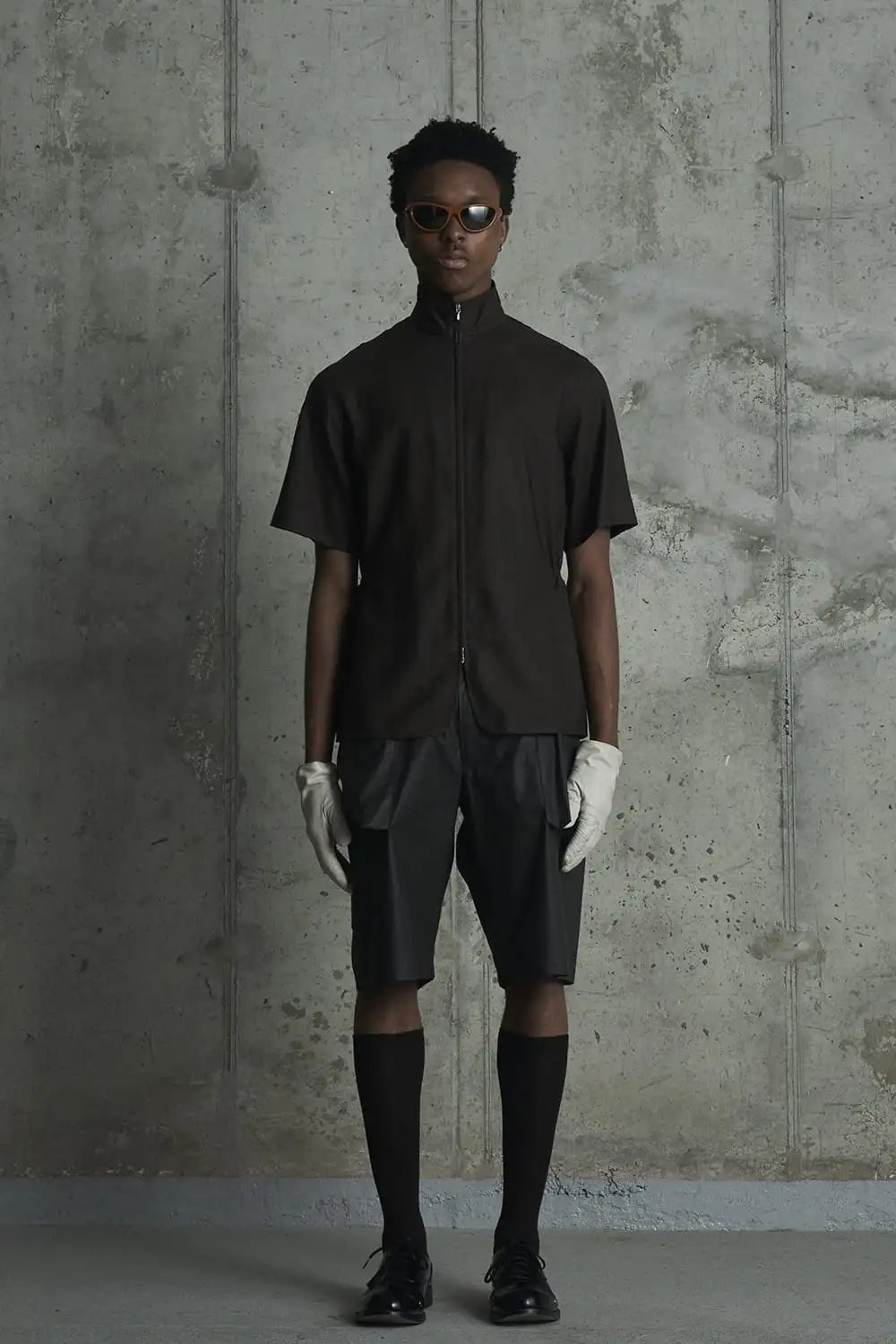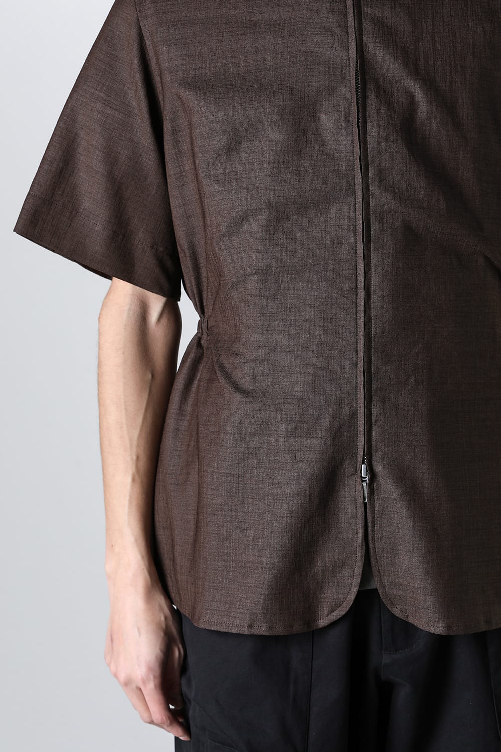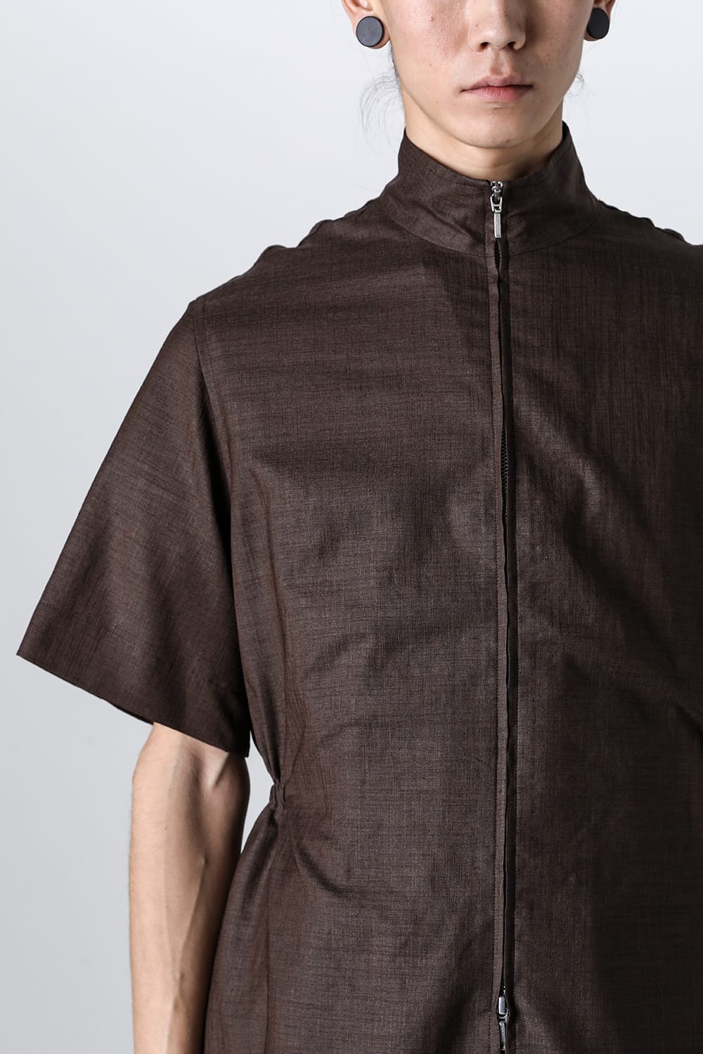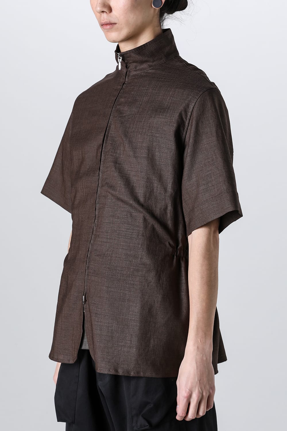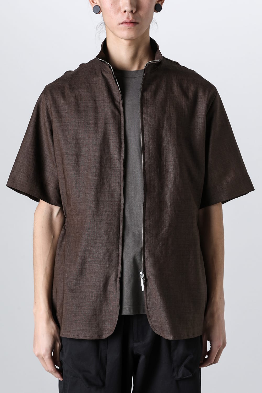 ・フロントダブルZIPデザインのハイネック半袖シャツ