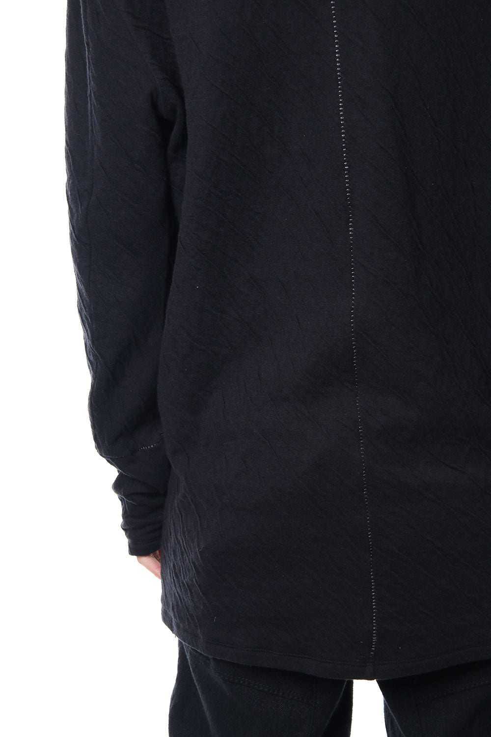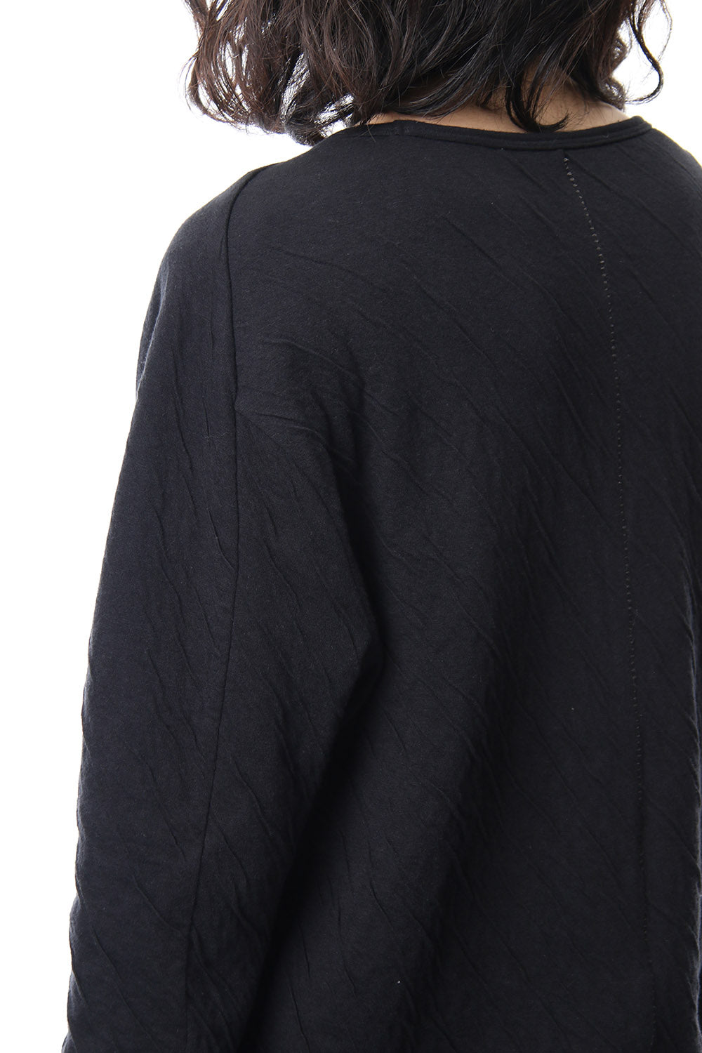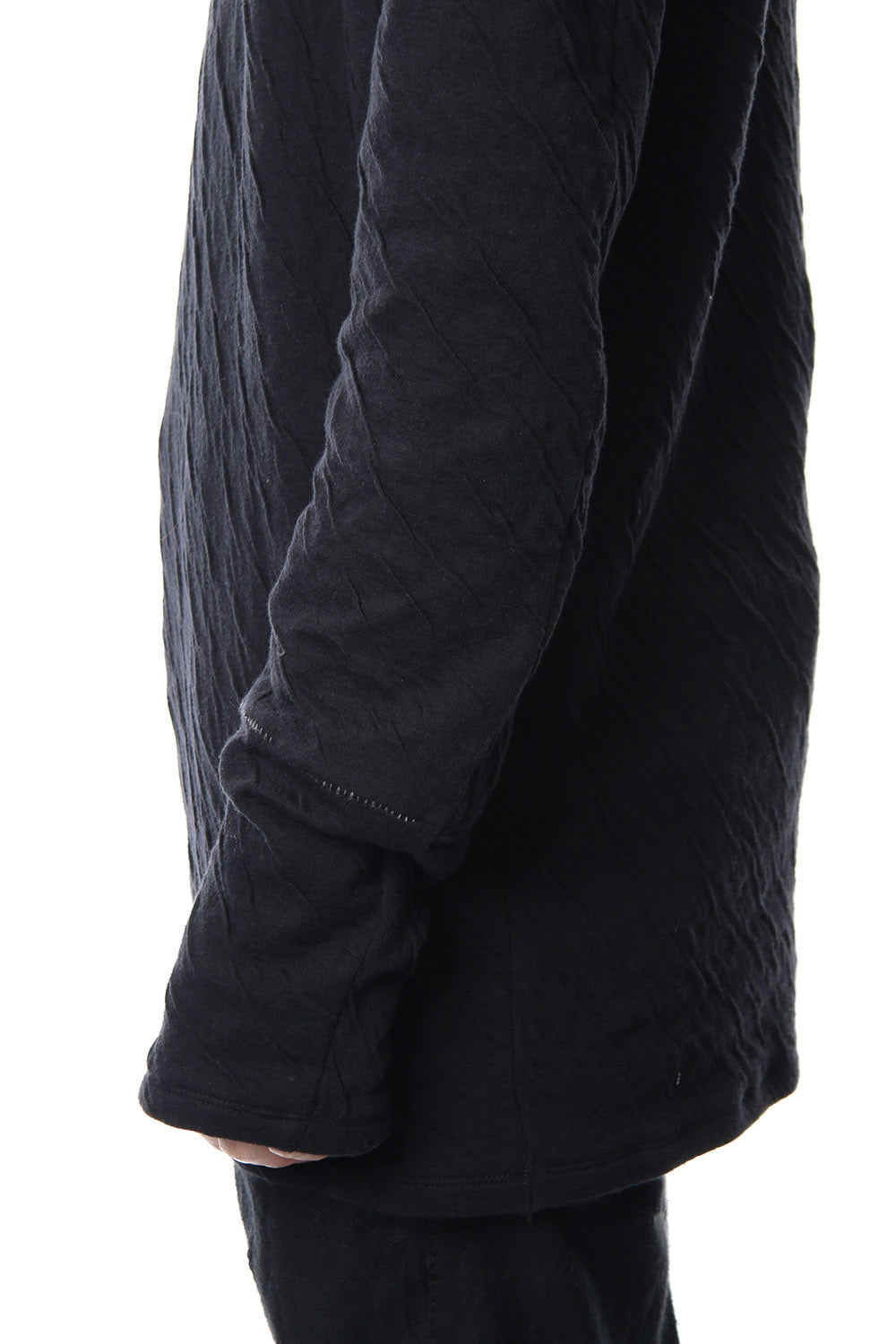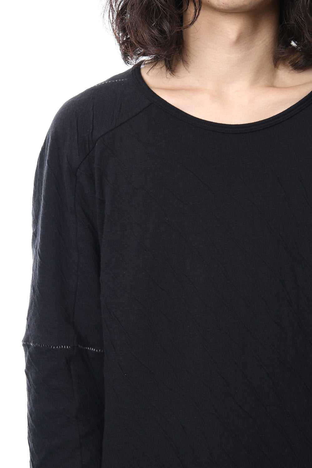 · 2種類の異なる組織で編まれたコットンジャージを接結し、染色することで縮率の違から歪を生み出し、波のようなシワを付けたコットンジャージを使用。