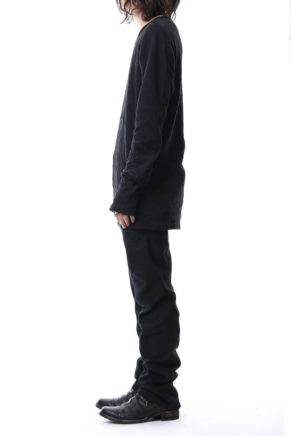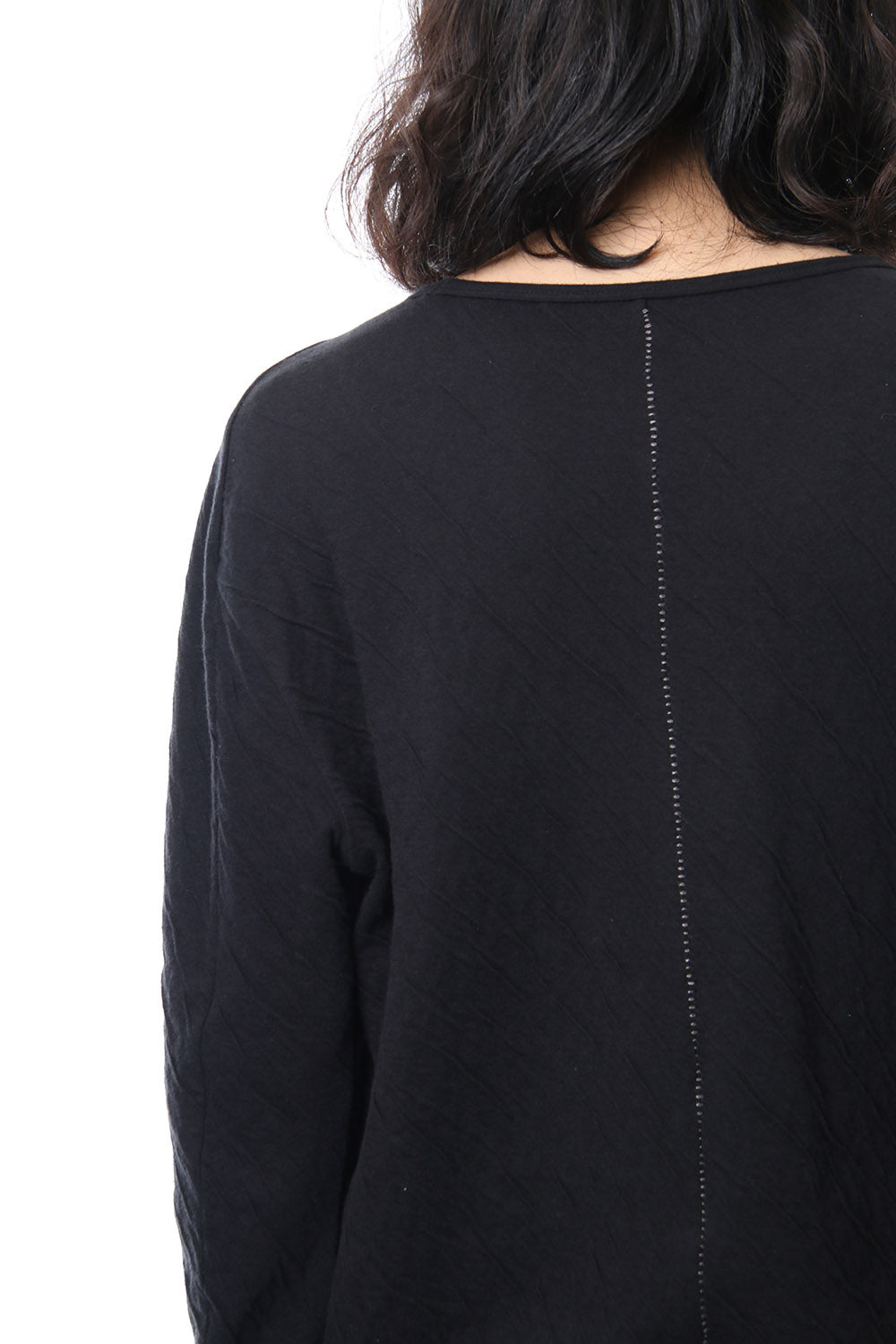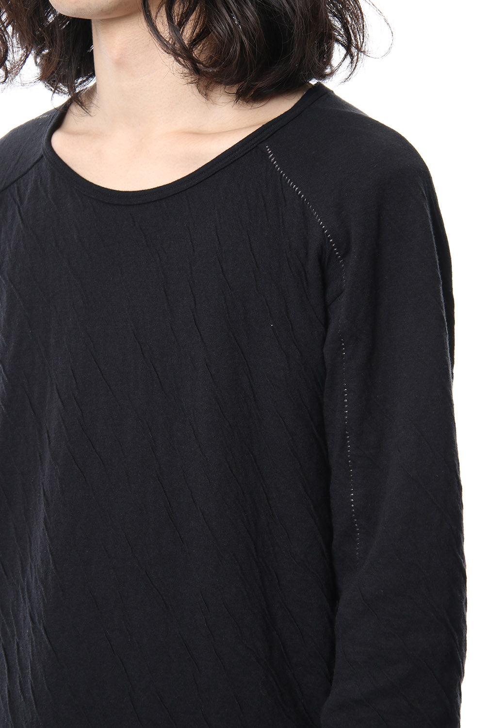 · 2種類の異なる組織で編まれたコットンジャージを接結し、染色することで縮率の違から歪を生み出し、波のようなシワを付けたコットンジャージを使用。