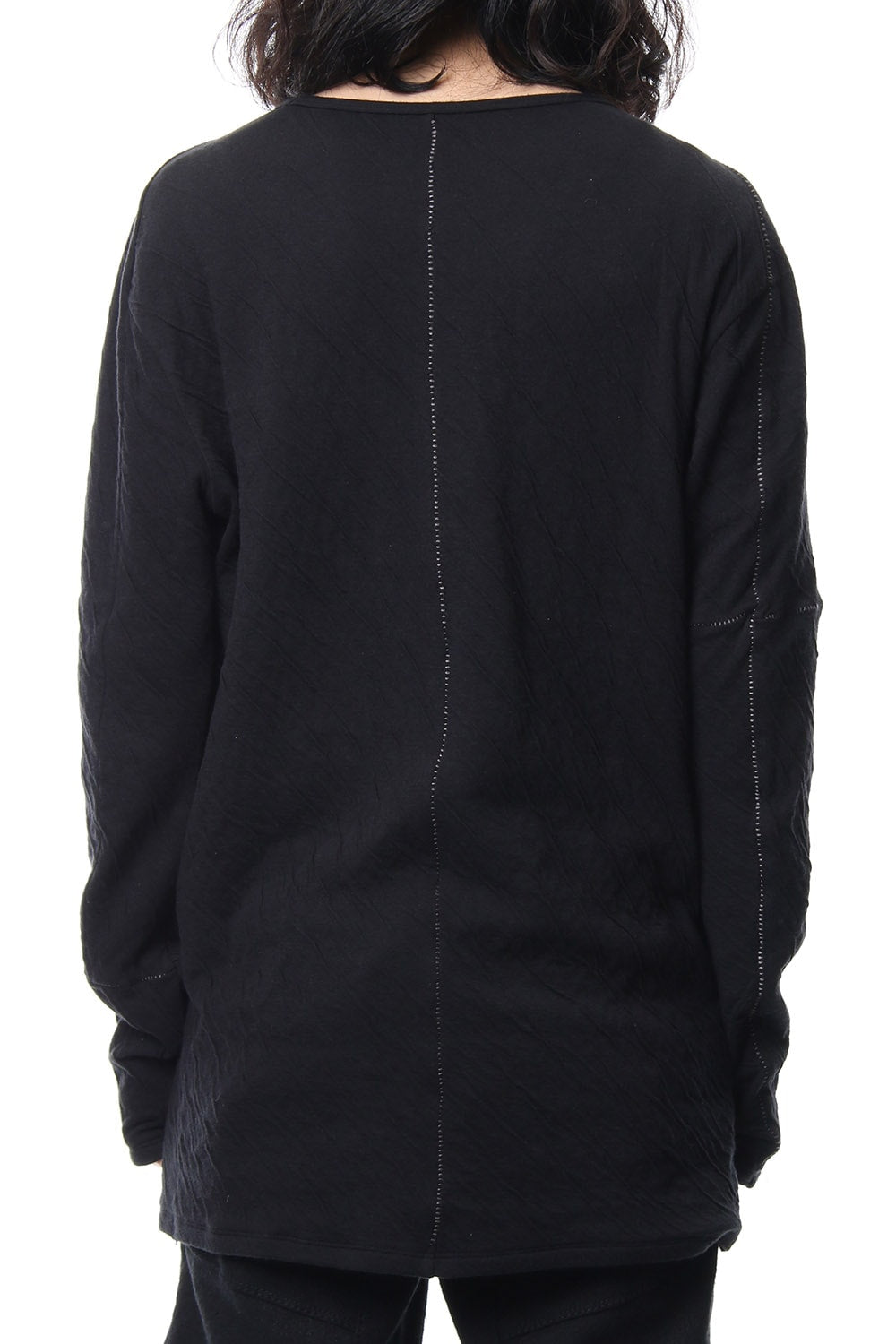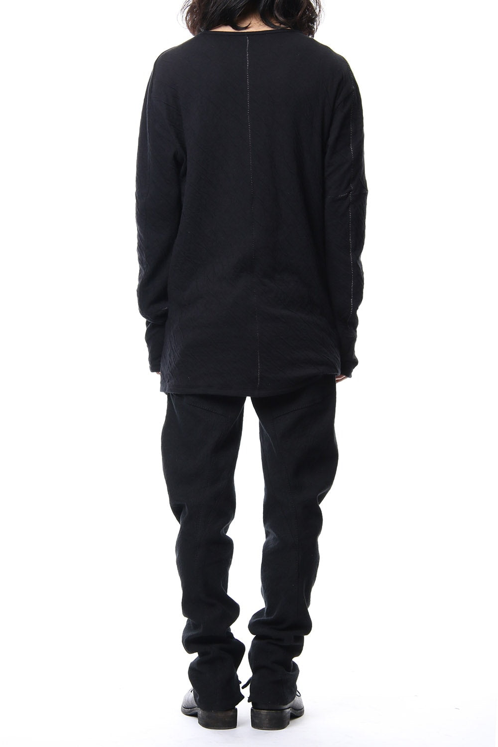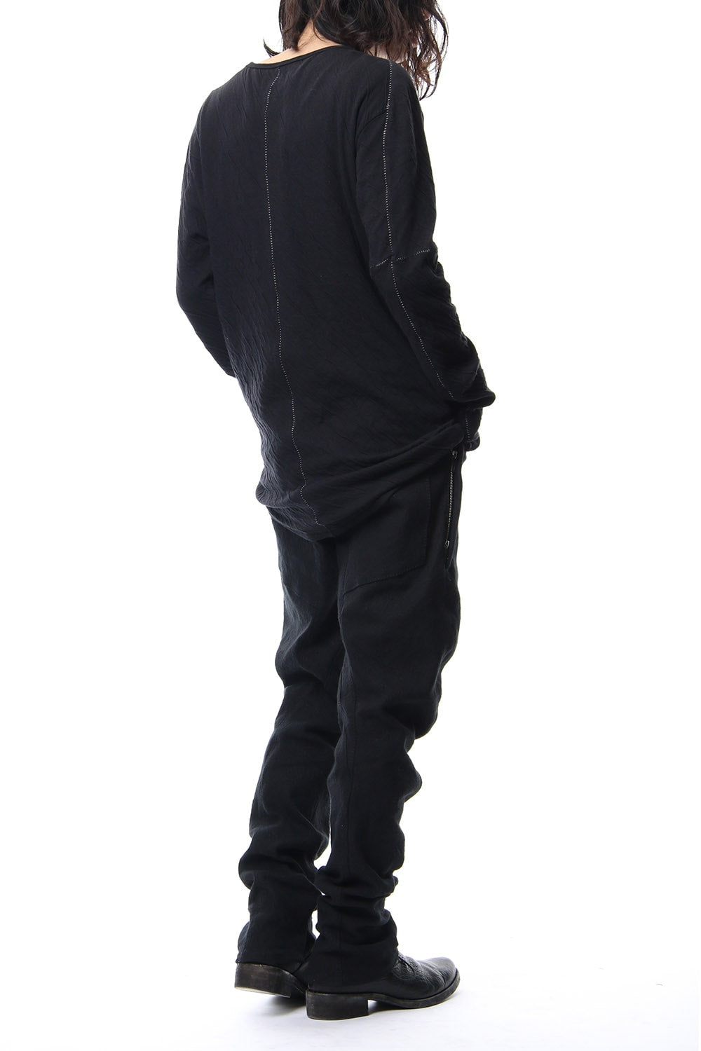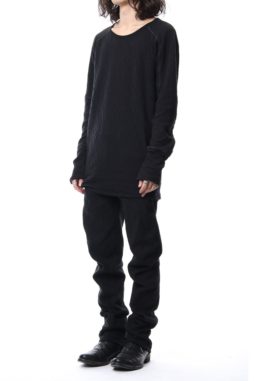 · 2種類の異なる組織で編まれたコットンジャージを接結し、染色することで縮率の違から歪を生み出し、波のようなシワを付けたコットンジャージを使用。