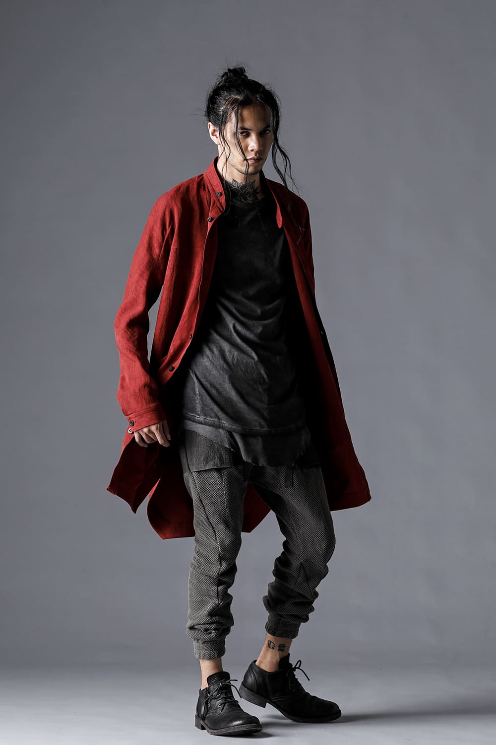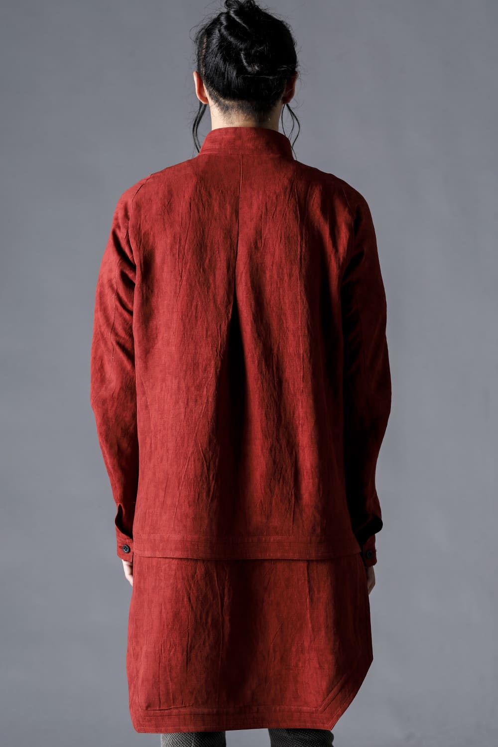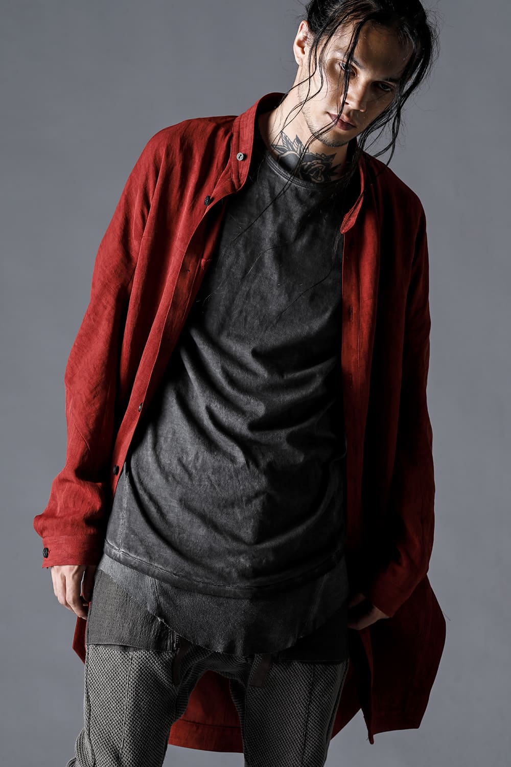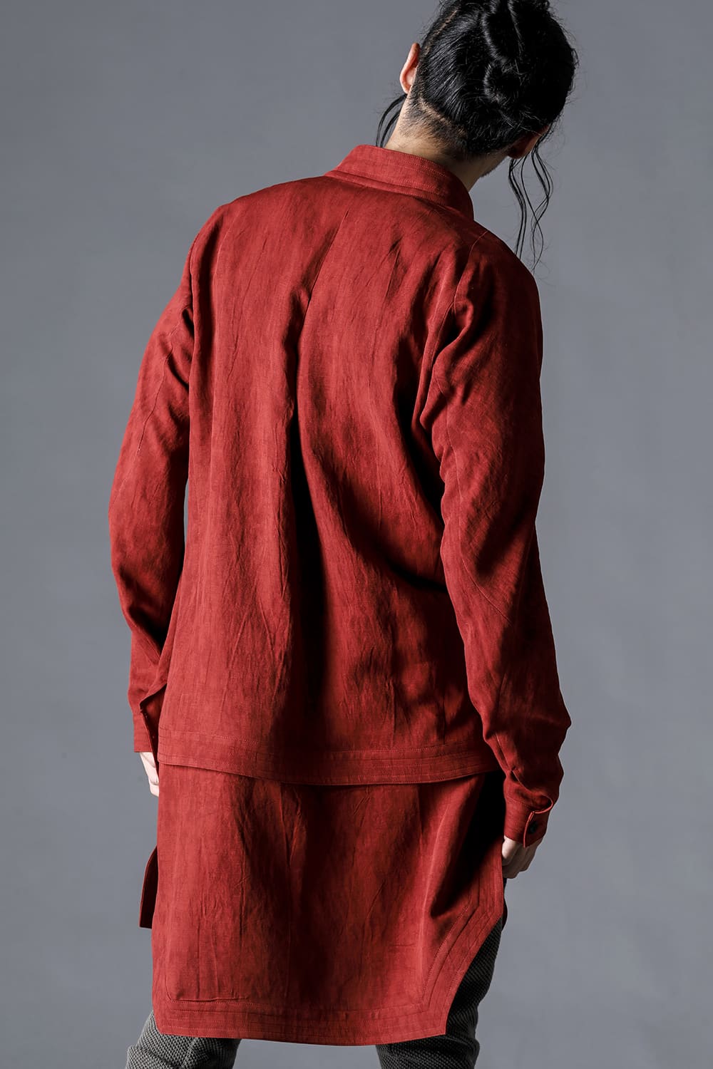 リネン×レーヨン塩縮染ロングワーキングシャツ チャコール