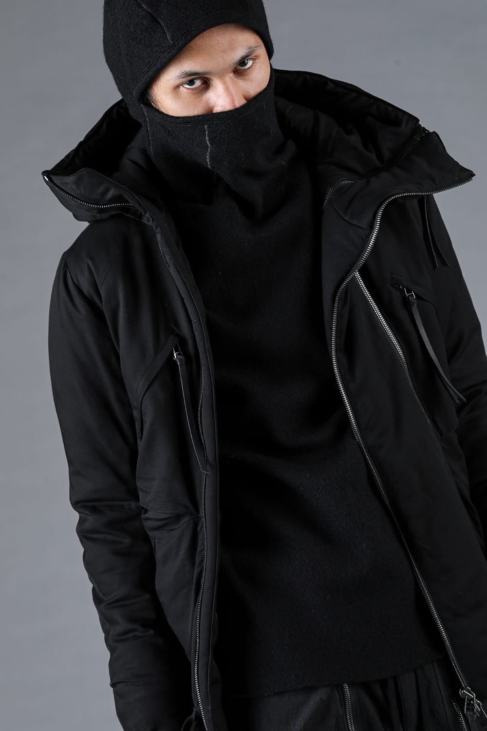 ・顔を半分以上覆う、大きく高いフードには中綿が入っており、ボリューム感とフードを被らない際にも形をキープできるように設定しています。フロントジップはダブルで配置し様々なアレンジができる仕様です