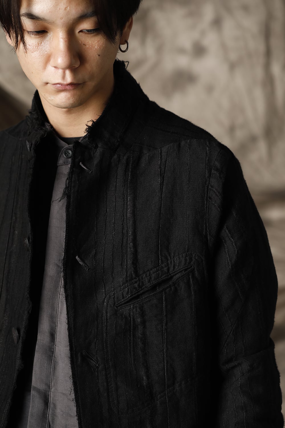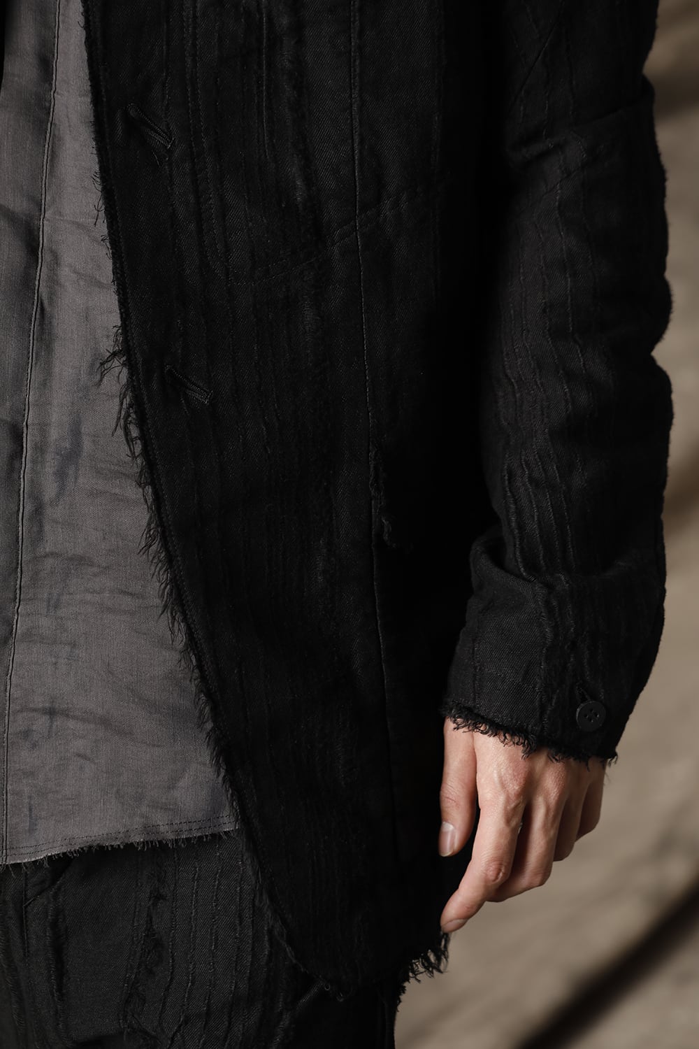・製品染めにてコールドダイ染色を施し、また各所裁ち切りで退廃的な表情に仕上げています。