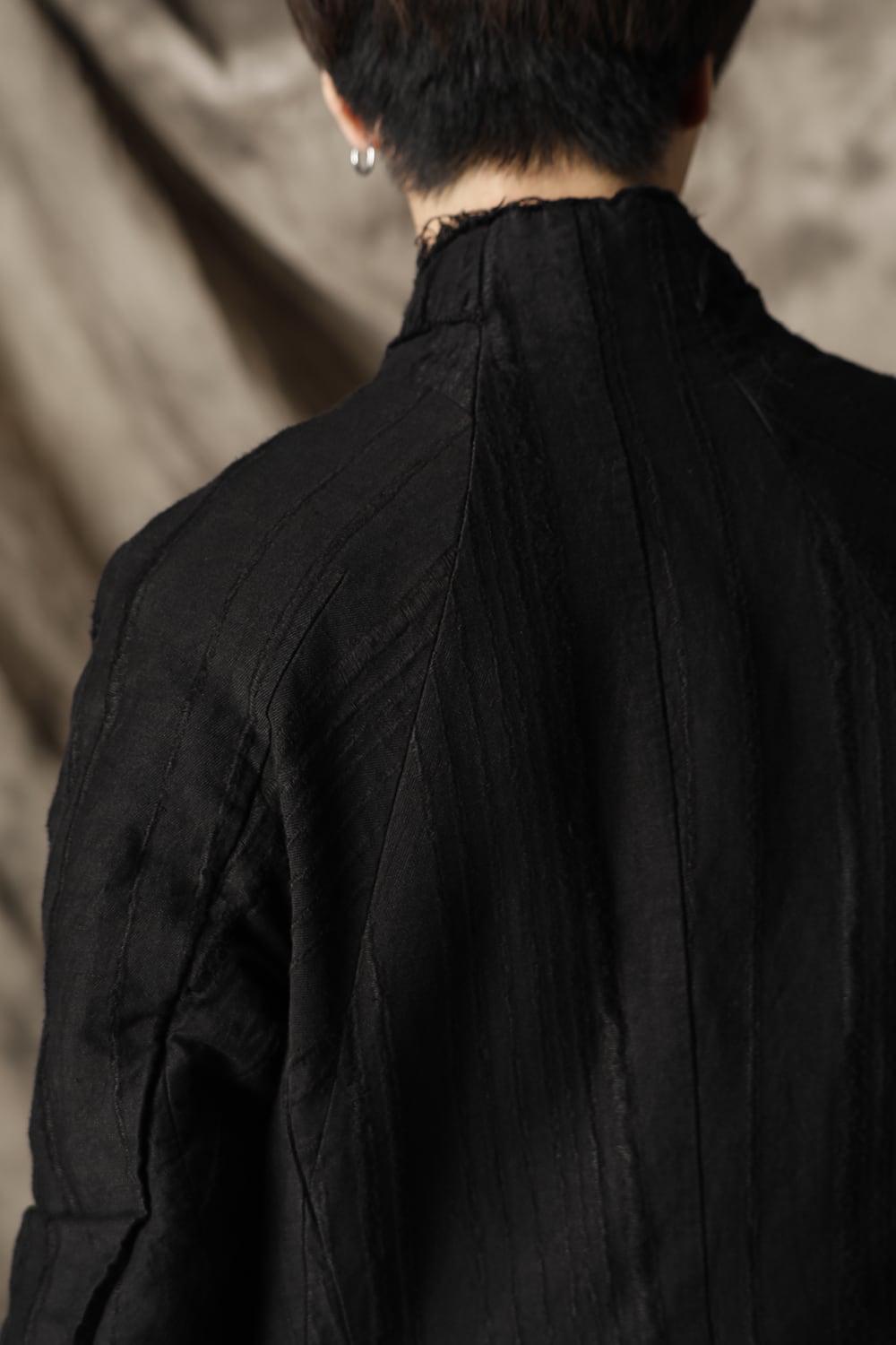 ・リネン×レーヨンの滑らかな糸で織り上げたオリジナル開発のジャガードストライプ生地。ストライプ部分の横糸を飛ばし破れた様な立体感のあるランダムストライプ柄に仕上げています。