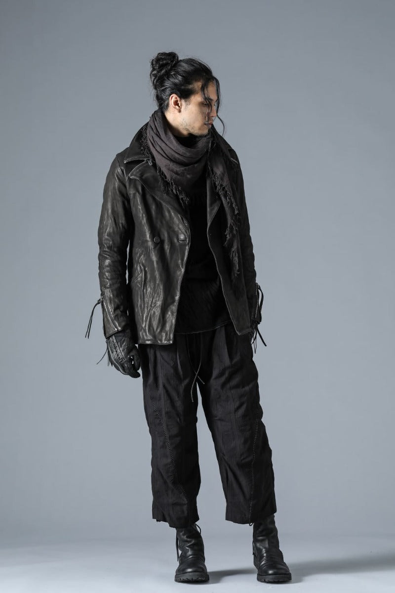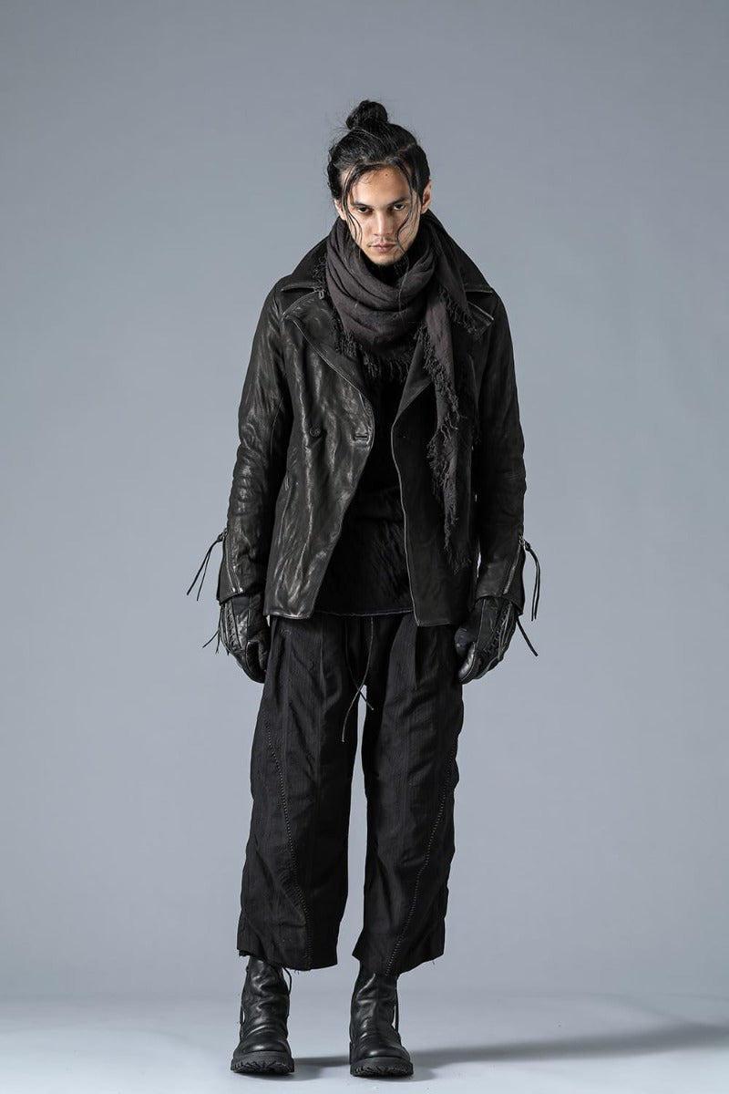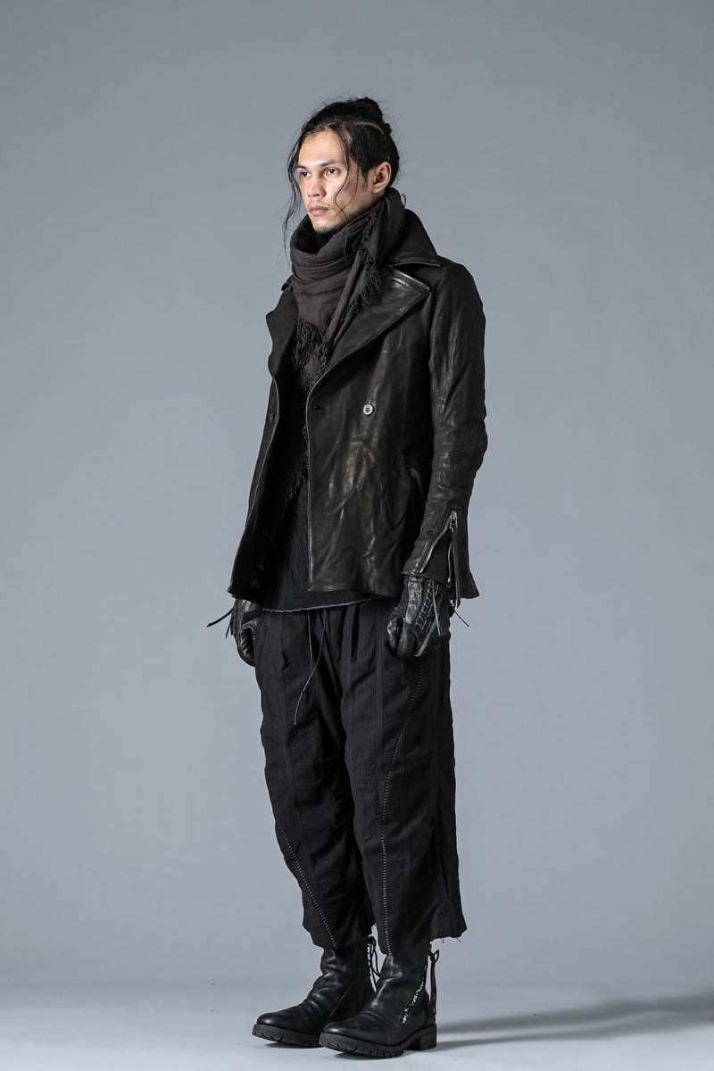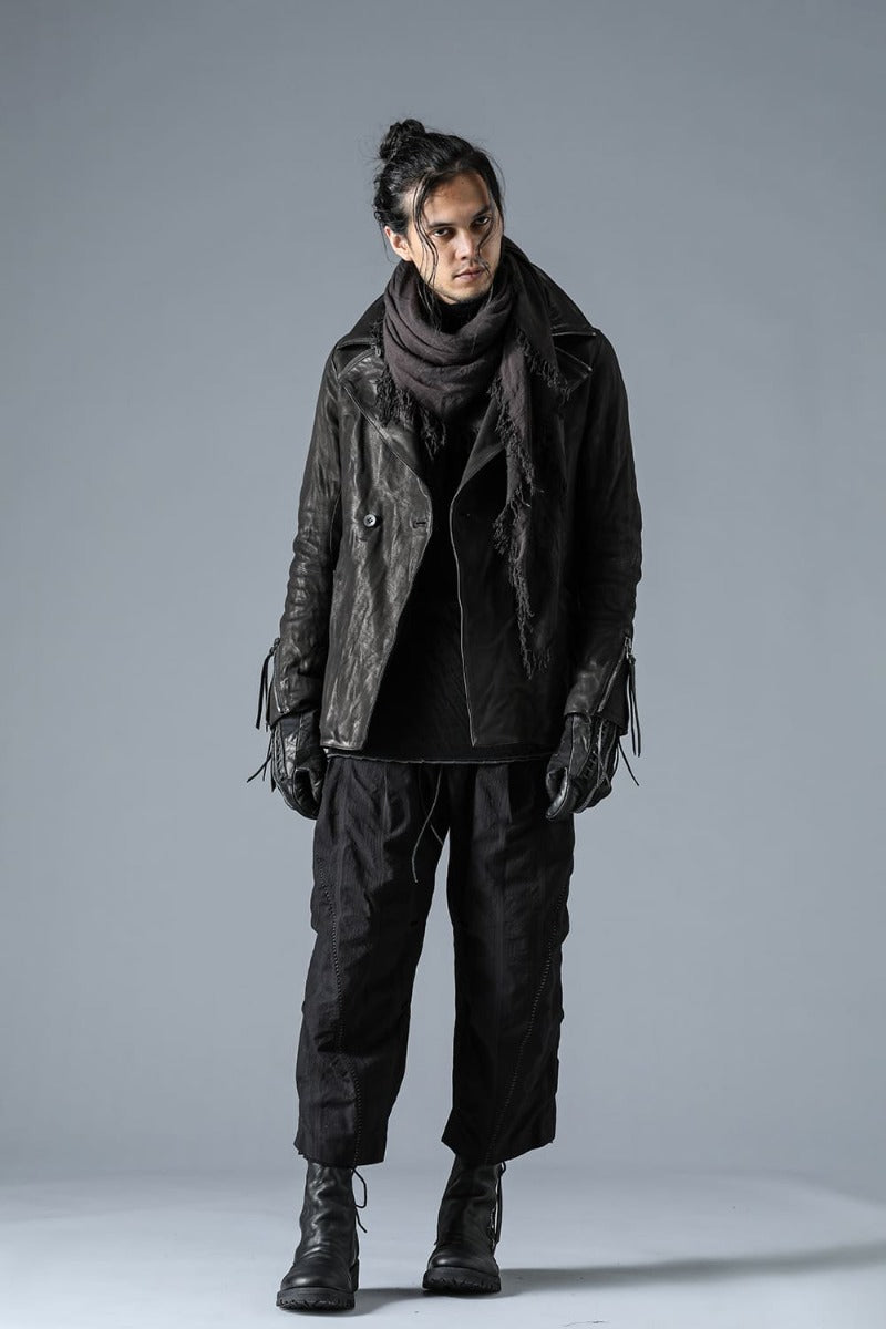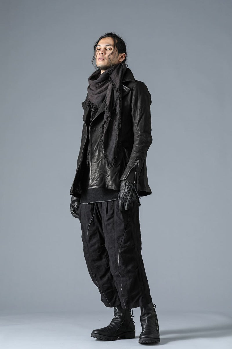 ・希少な内地(国産)原皮を0.9mm厚で非常に柔らかく鞣したカーフレザーを使用しています。元々銀面がとても繊細なカーフですが、内地原皮の特徴は飼育環境が海外と比べ格段に高いことでより繊細な原皮となります。きめ細やかでシルクの様に滑らかなタッチですが、裏腹に荒々しいシボやトラ目を生み出した迫力ある銀面を生み出しました。オイルを丁寧に浸透させることでマットで柔らかく仕上げています。立体的で複雑なパターンで構成しており、比較的リラックスフィットですが構築的なシルエットで構成しています。