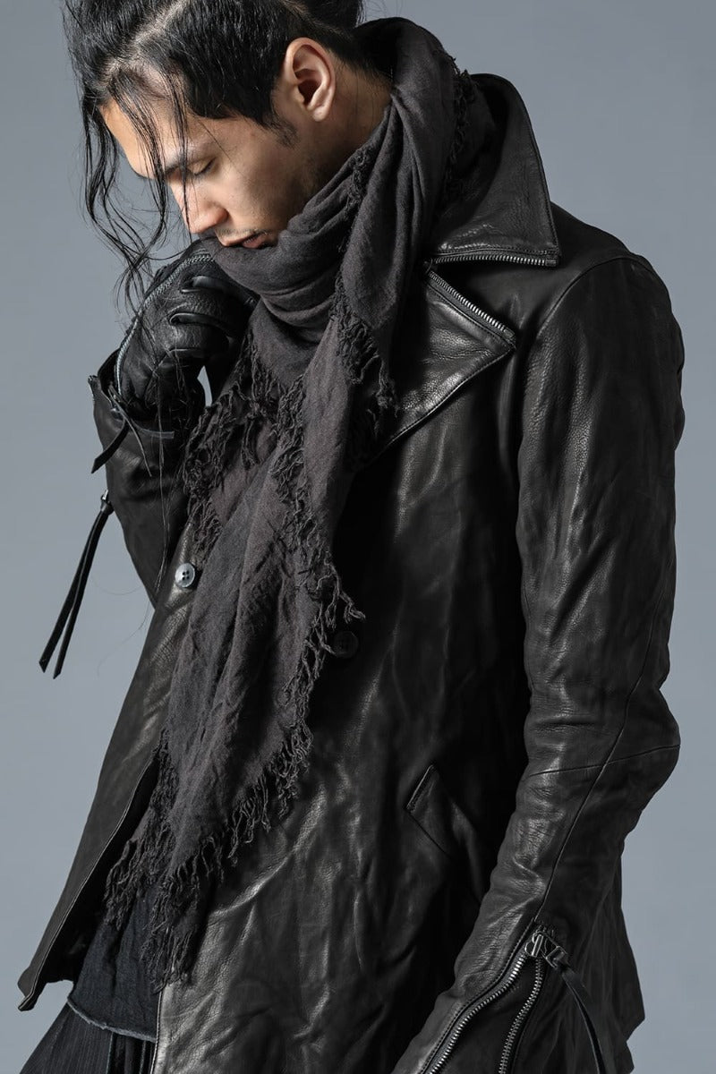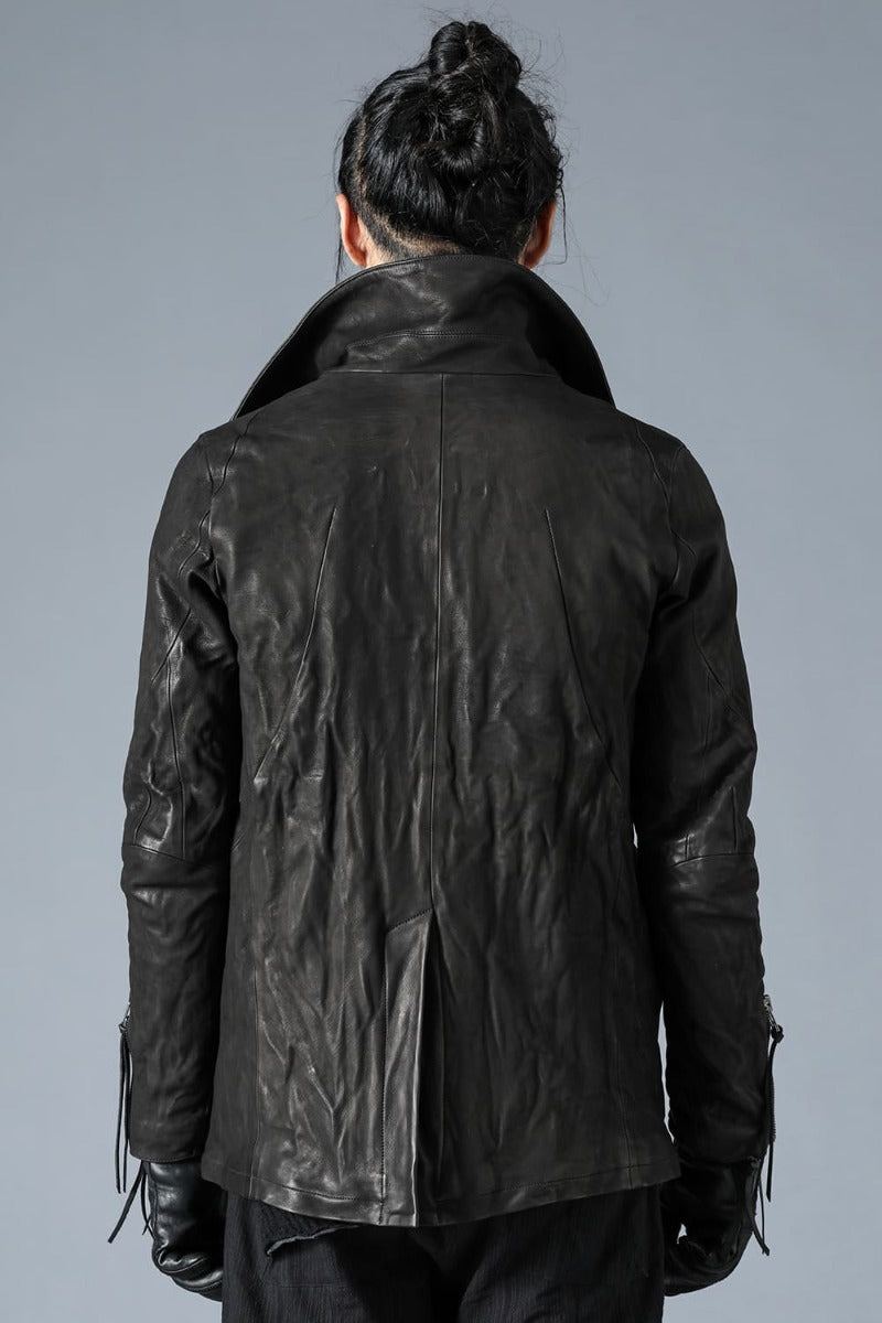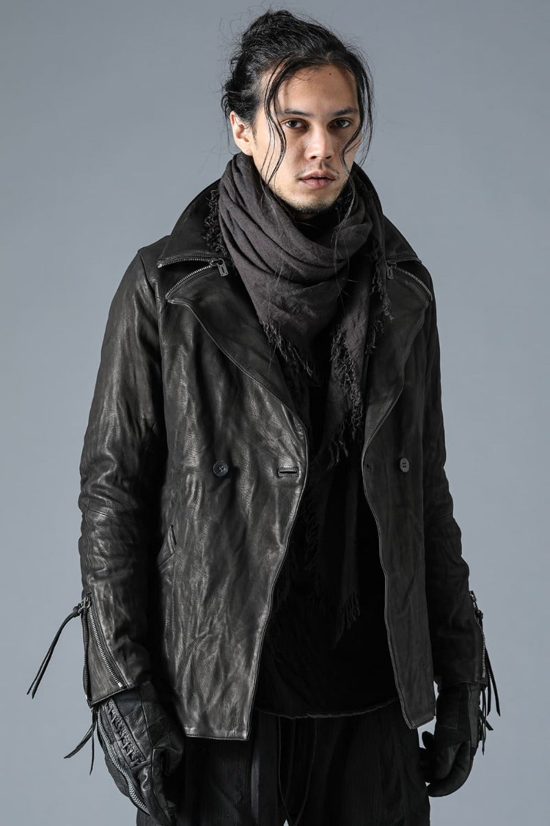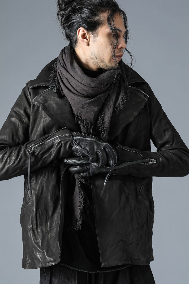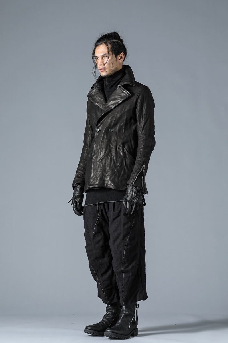 ・希少な内地(国産)原皮を0.9mm厚で非常に柔らかく鞣したカーフレザーを使用しています。元々銀面がとても繊細なカーフですが、内地原皮の特徴は飼育環境が海外と比べ格段に高いことでより繊細な原皮となります。きめ細やかでシルクの様に滑らかなタッチですが、裏腹に荒々しいシボやトラ目を生み出した迫力ある銀面を生み出しました。オイルを丁寧に浸透させることでマットで柔らかく仕上げています。立体的で複雑なパターンで構成しており、比較的リラックスフィットですが構築的なシルエットで構成しています。