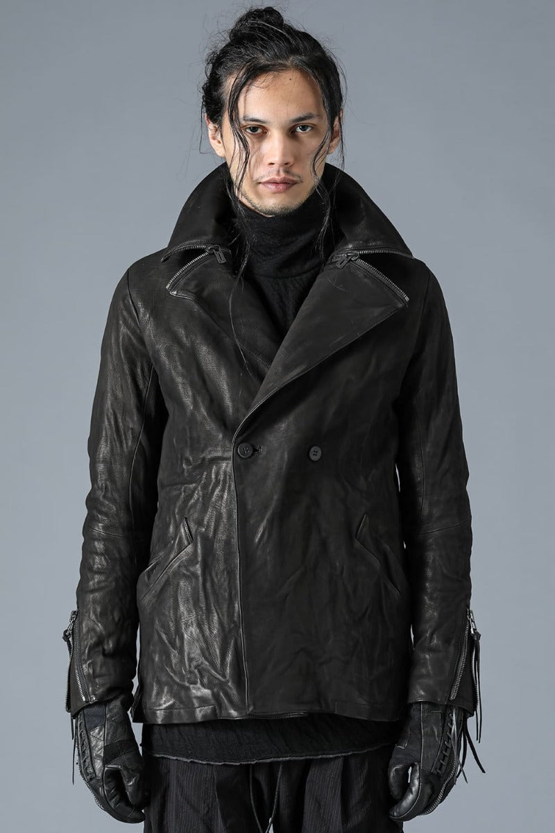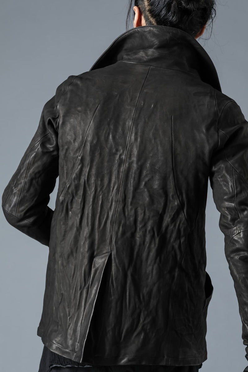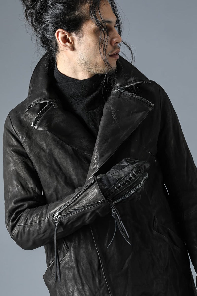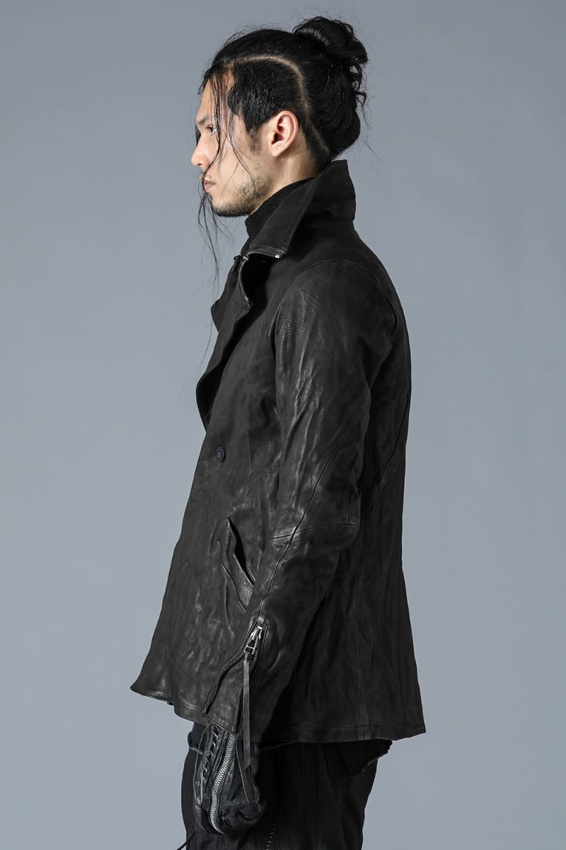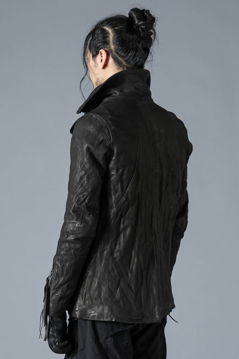 ・希少な内地(国産)原皮を0.9mm厚で非常に柔らかく鞣したカーフレザーを使用しています。元々銀面がとても繊細なカーフですが、内地原皮の特徴は飼育環境が海外と比べ格段に高いことでより繊細な原皮となります。きめ細やかでシルクの様に滑らかなタッチですが、裏腹に荒々しいシボやトラ目を生み出した迫力ある銀面を生み出しました。オイルを丁寧に浸透させることでマットで柔らかく仕上げています。立体的で複雑なパターンで構成しており、比較的リラックスフィットですが構築的なシルエットで構成しています。