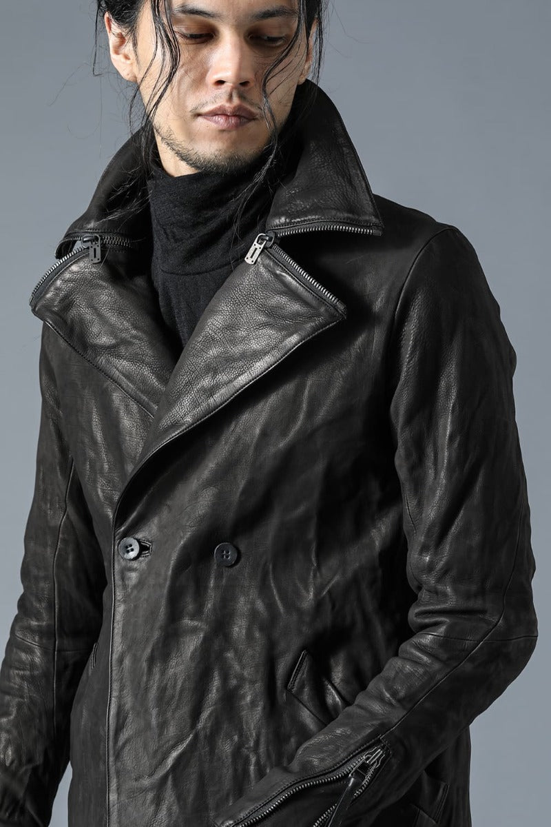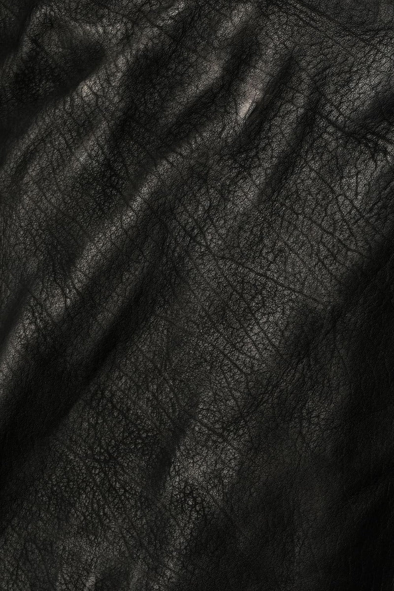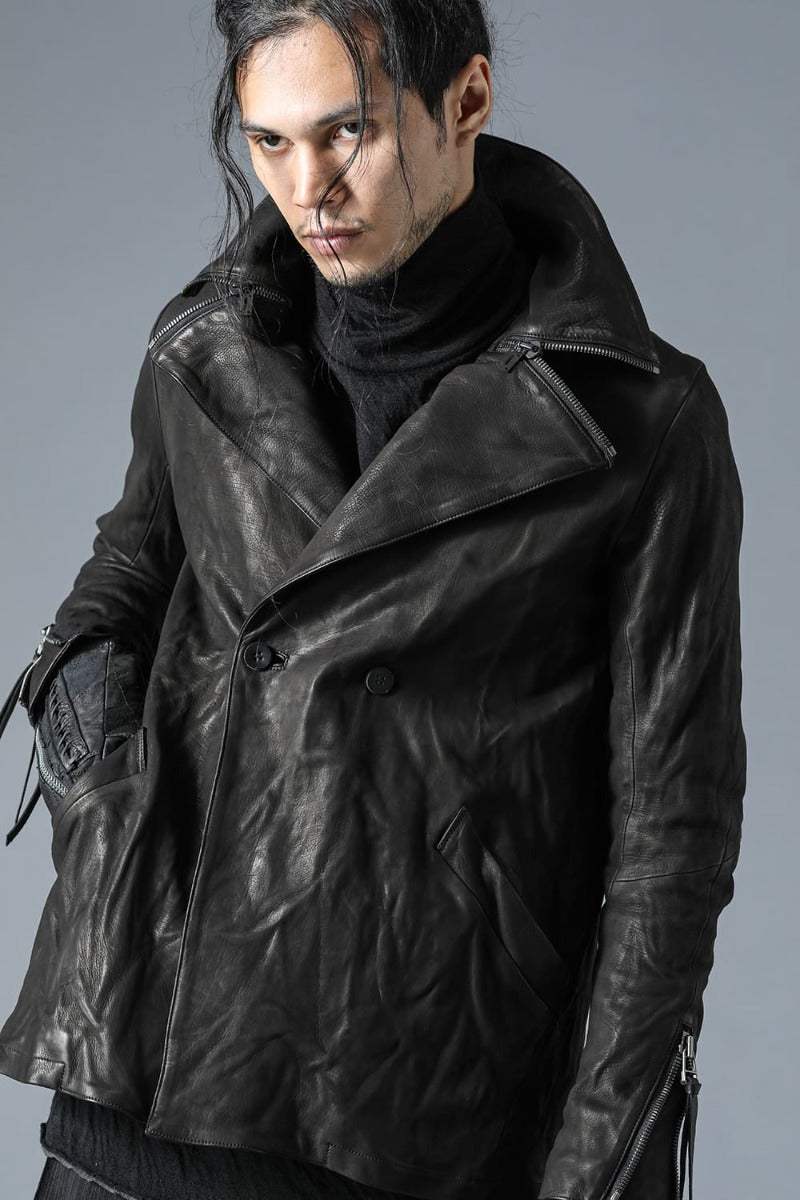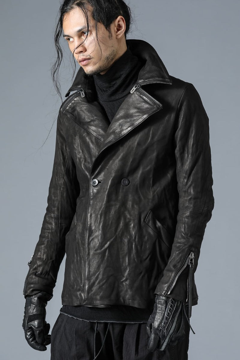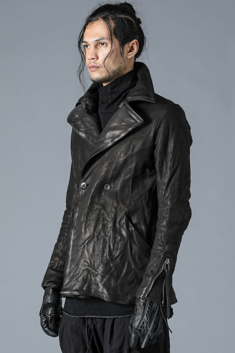・希少な内地(国産)原皮を0.9mm厚で非常に柔らかく鞣したカーフレザーを使用しています。元々銀面がとても繊細なカーフですが、内地原皮の特徴は飼育環境が海外と比べ格段に高いことでより繊細な原皮となります。きめ細やかでシルクの様に滑らかなタッチですが、裏腹に荒々しいシボやトラ目を生み出した迫力ある銀面を生み出しました。オイルを丁寧に浸透させることでマットで柔らかく仕上げています。立体的で複雑なパターンで構成しており、比較的リラックスフィットですが構築的なシルエットで構成しています。