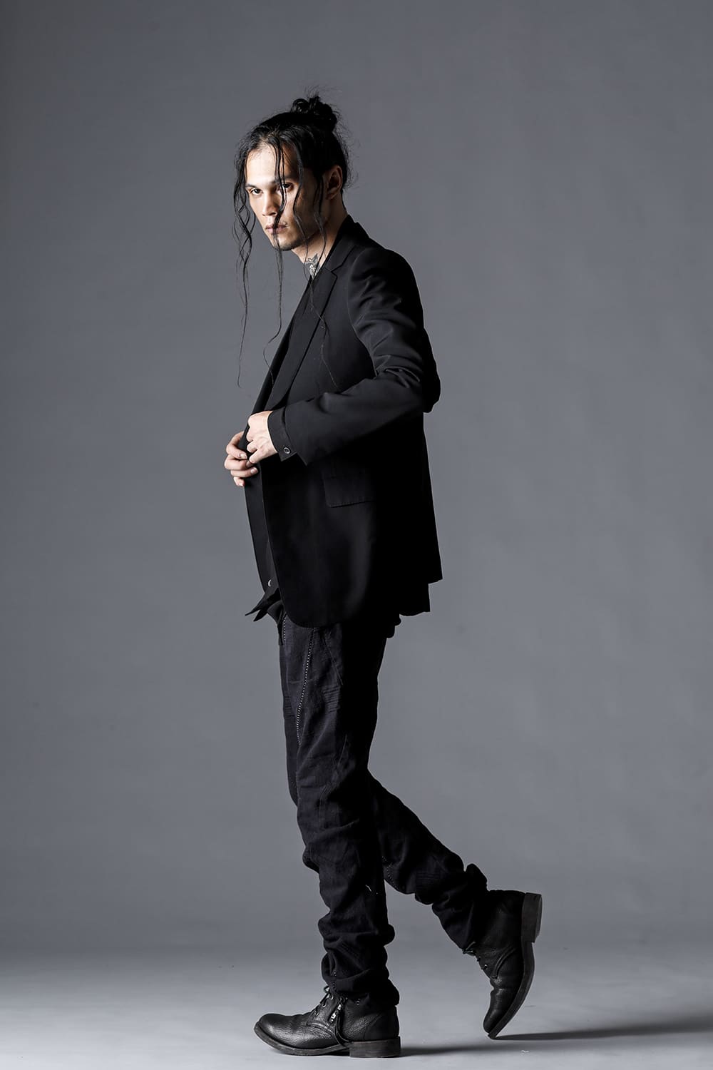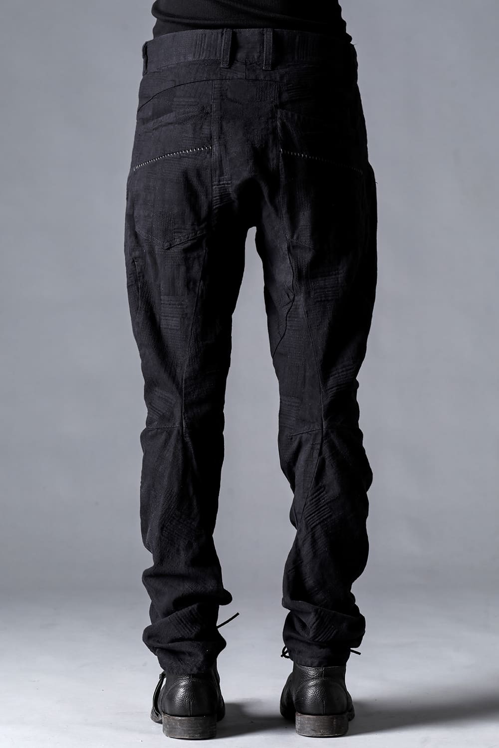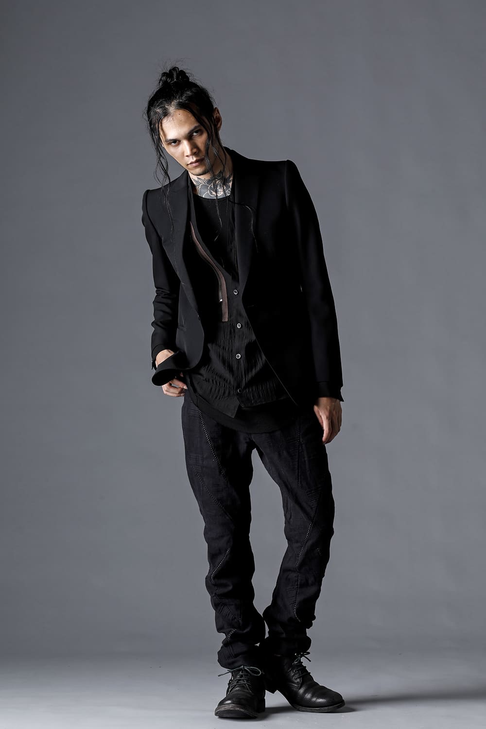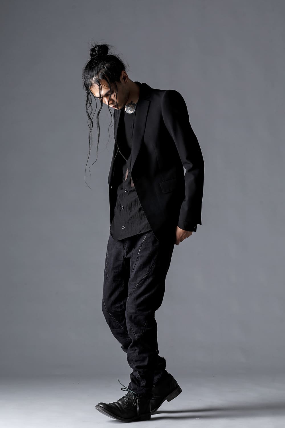 ・シームとダーツで立体感を待たせ、膝下からは後方向に加えて、横方向にもツイストさせたパターンで構成され、着用時により立体的なシワを生み出しています。