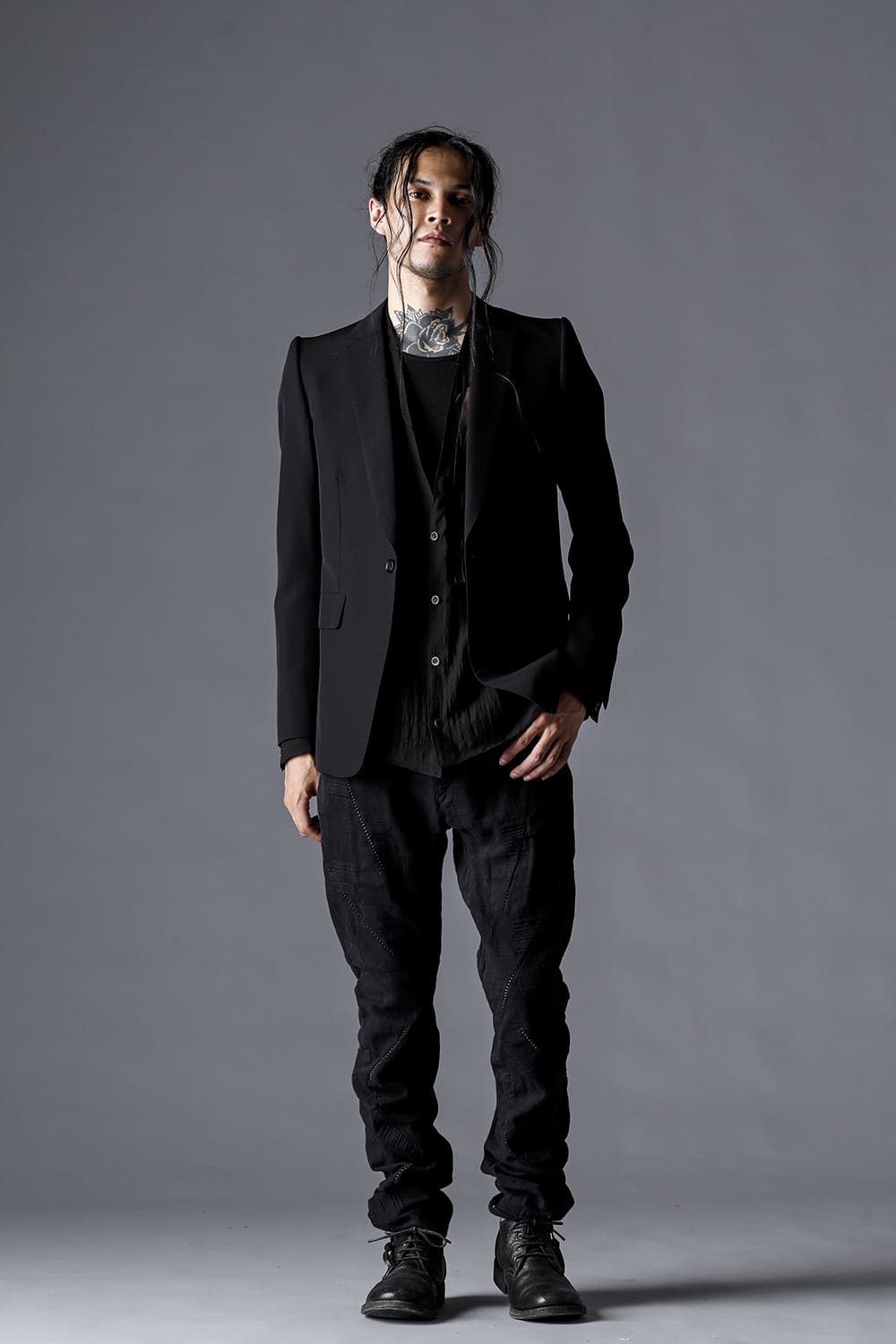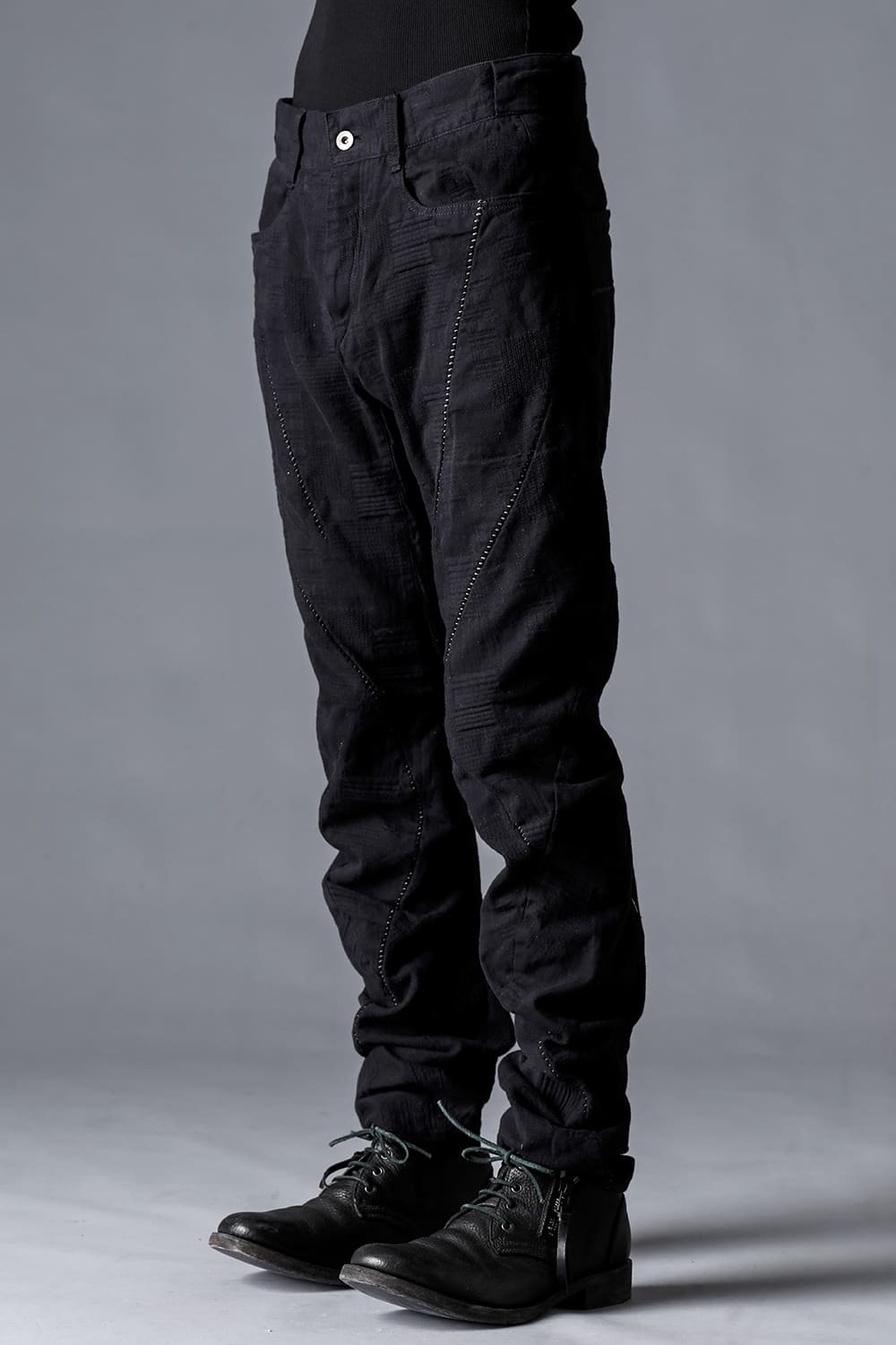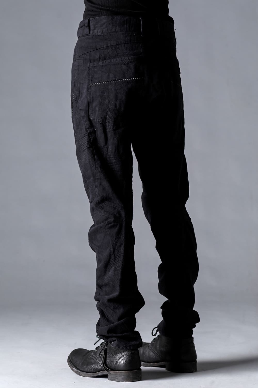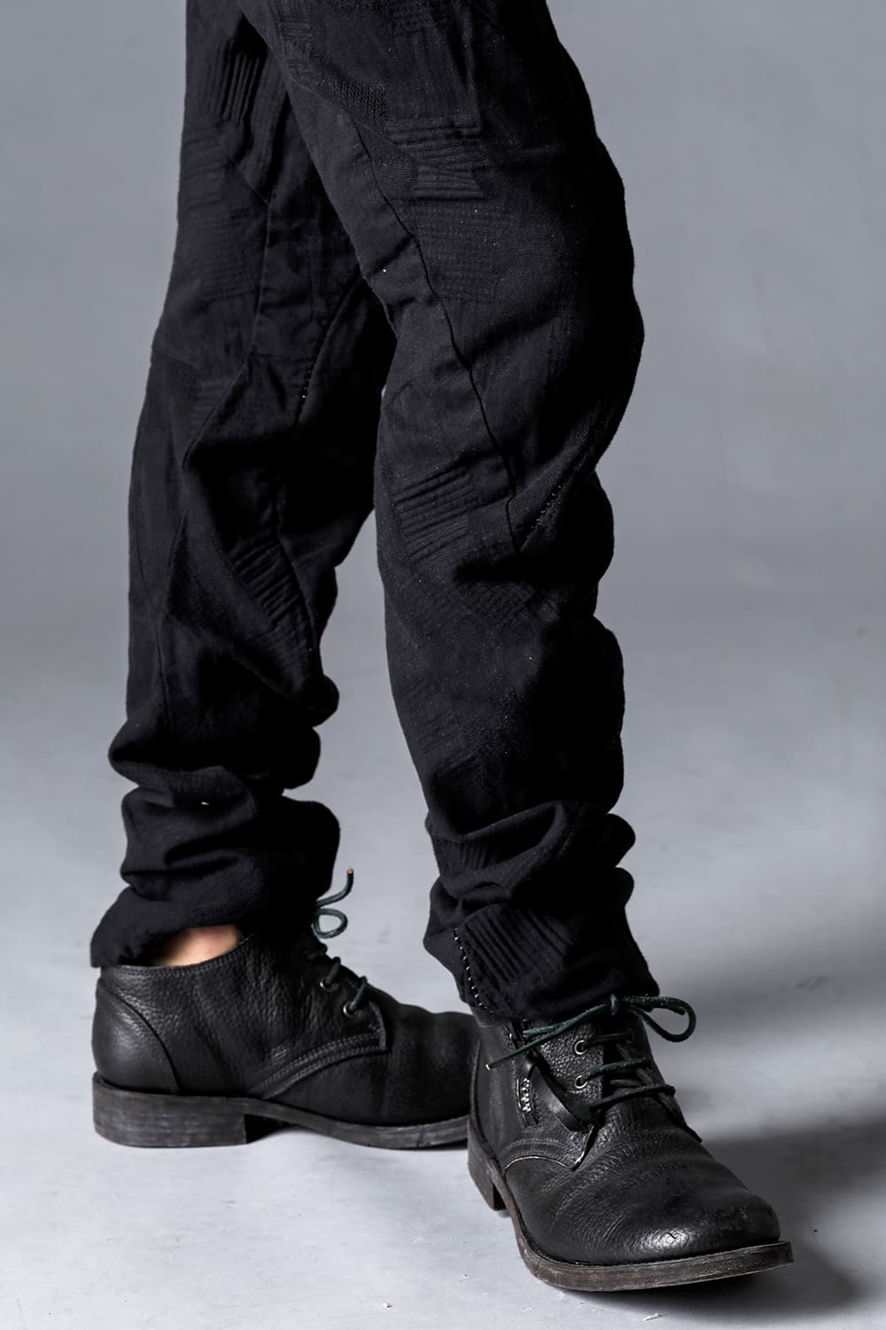 ・シームとダーツで立体感を待たせ、膝下からは後方向に加えて、横方向にもツイストさせたパターンで構成され、着用時により立体的なシワを生み出しています。