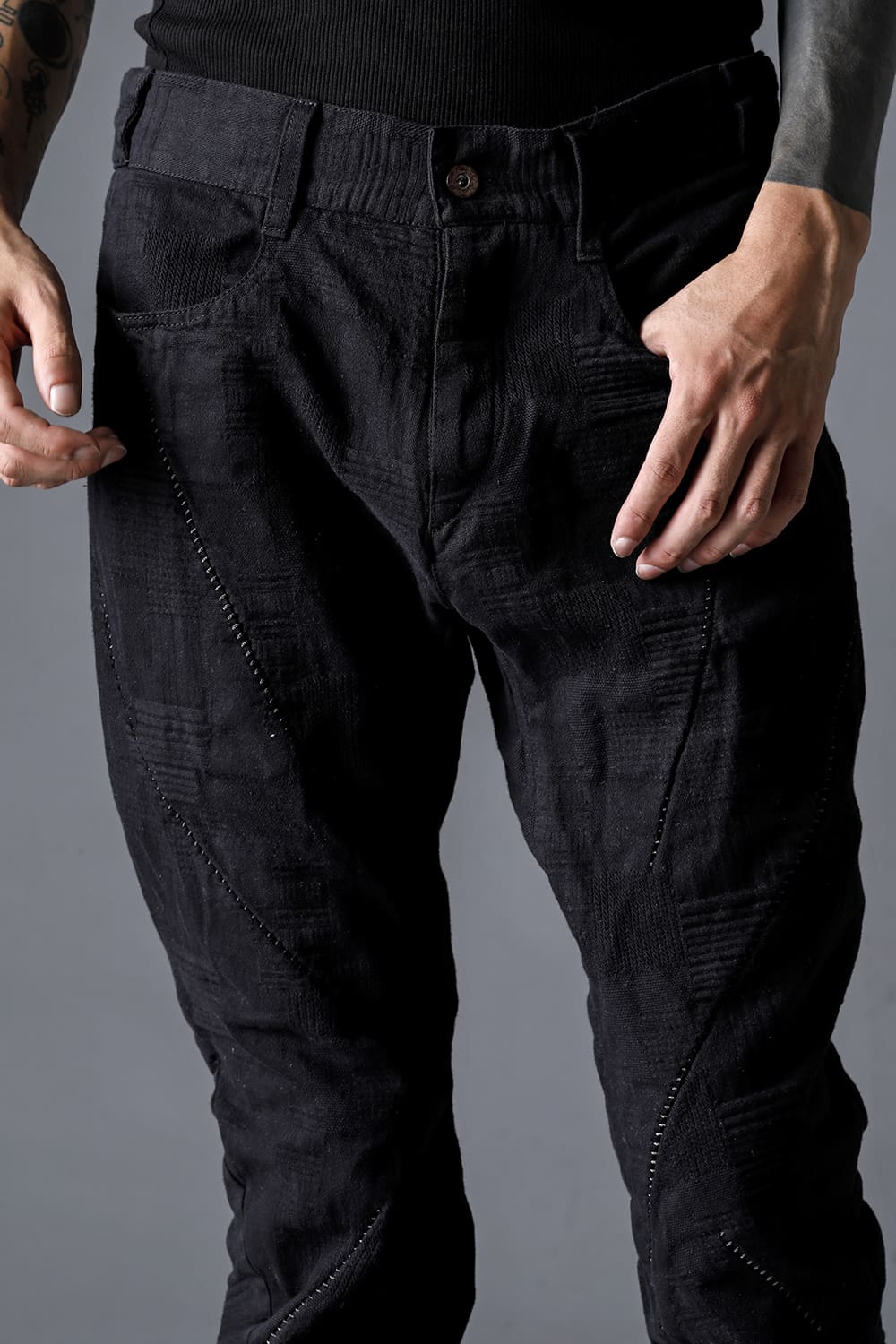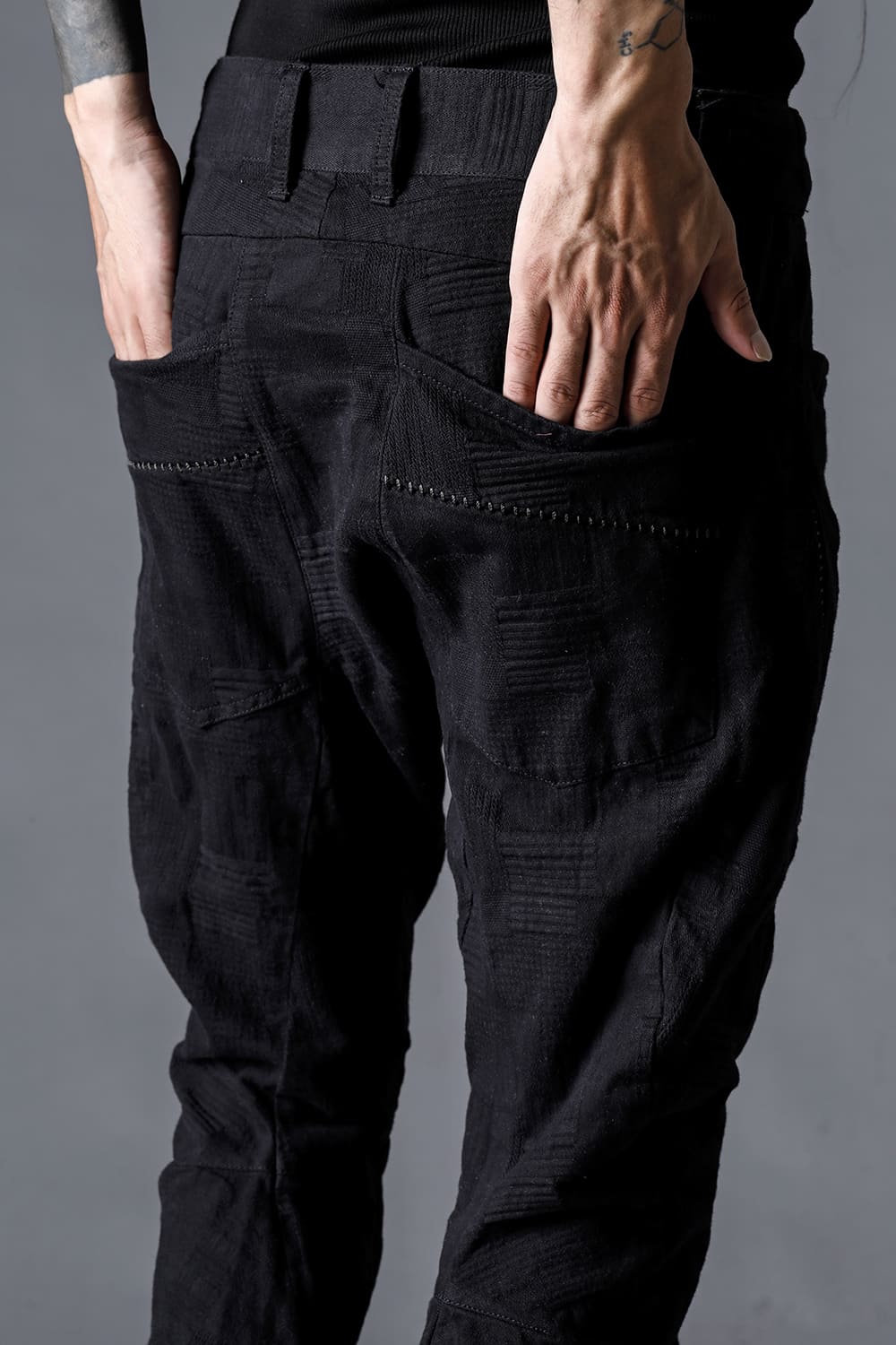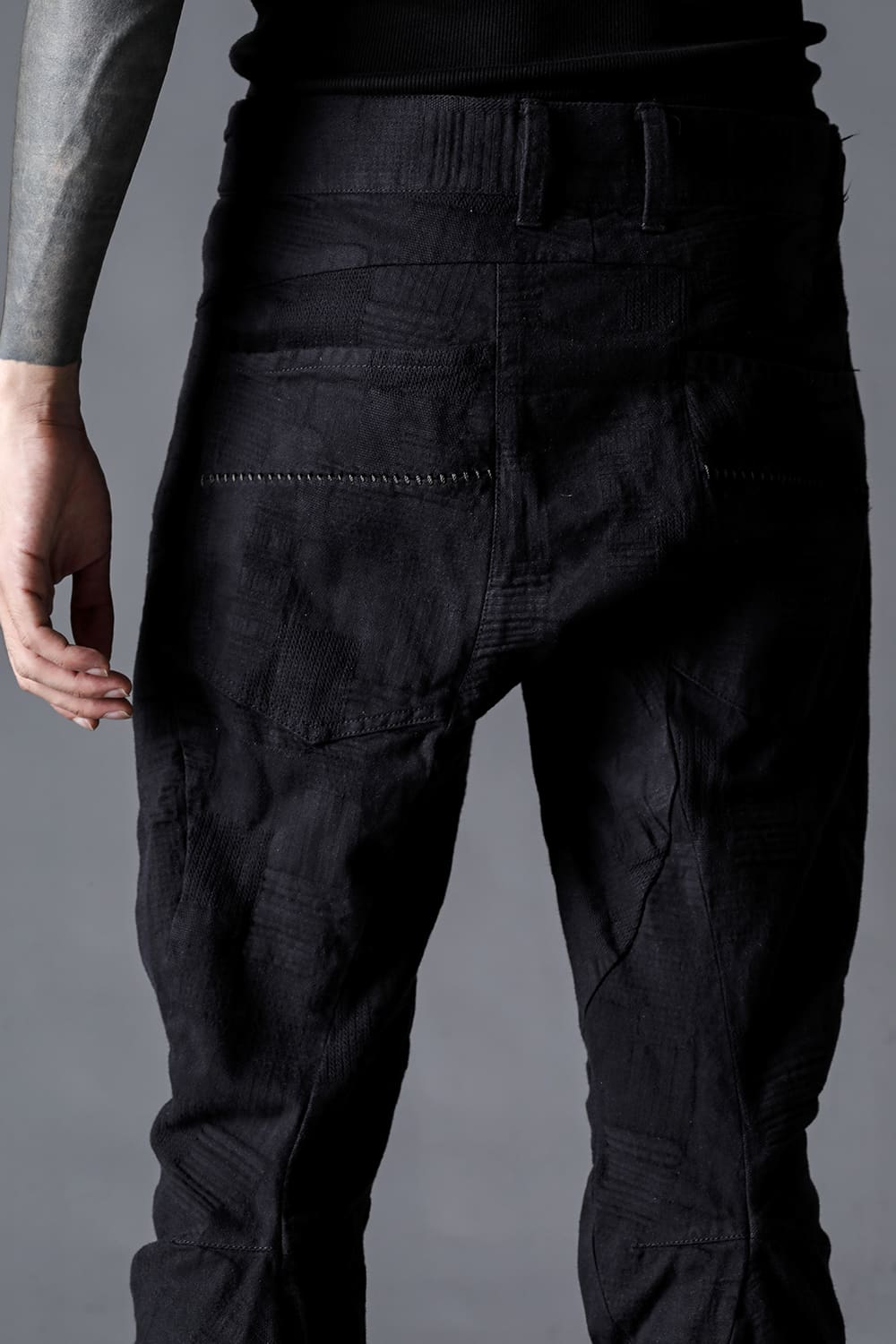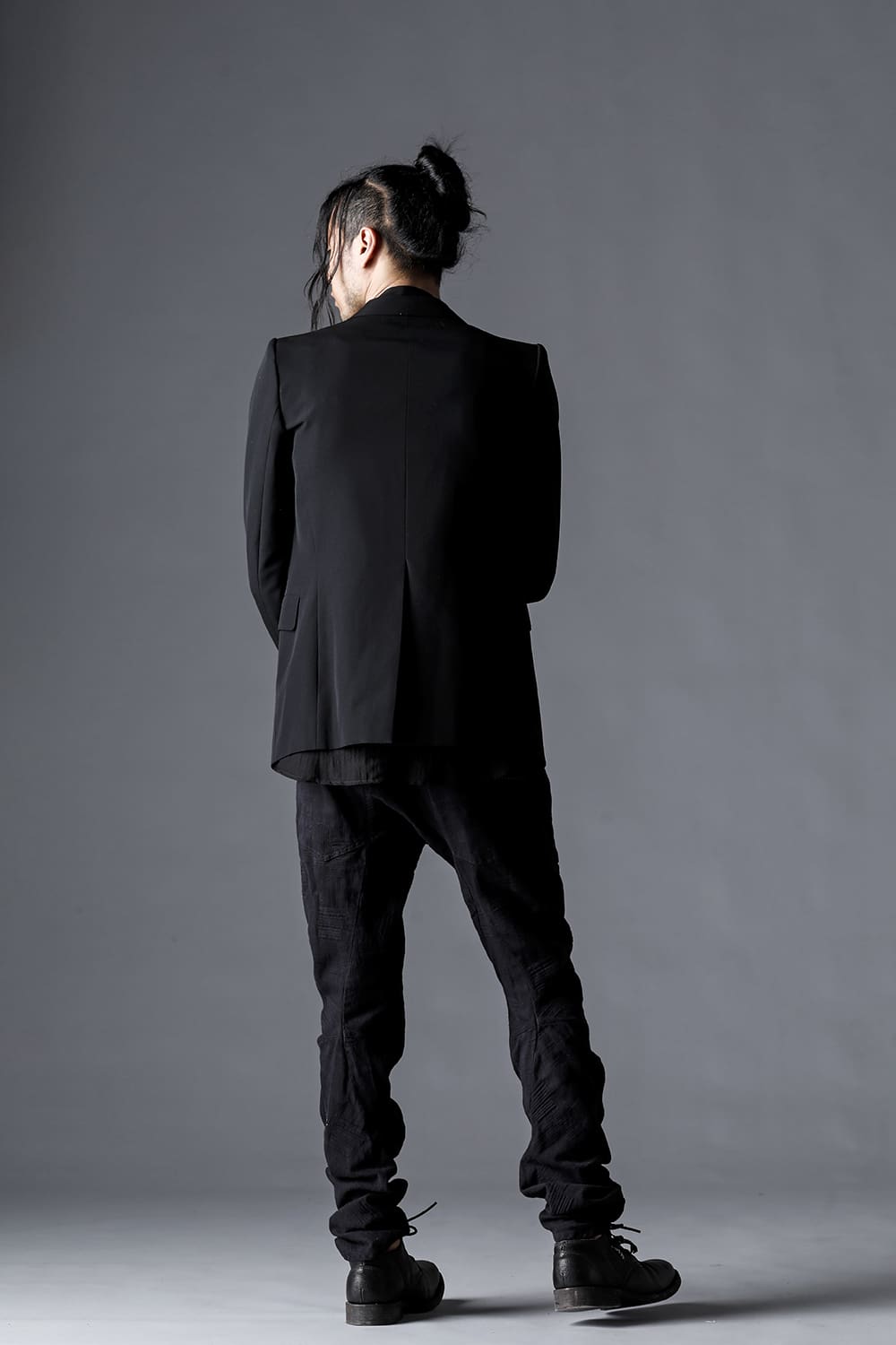 ・シームとダーツで立体感を待たせ、膝下からは後方向に加えて、横方向にもツイストさせたパターンで構成され、着用時により立体的なシワを生み出しています。