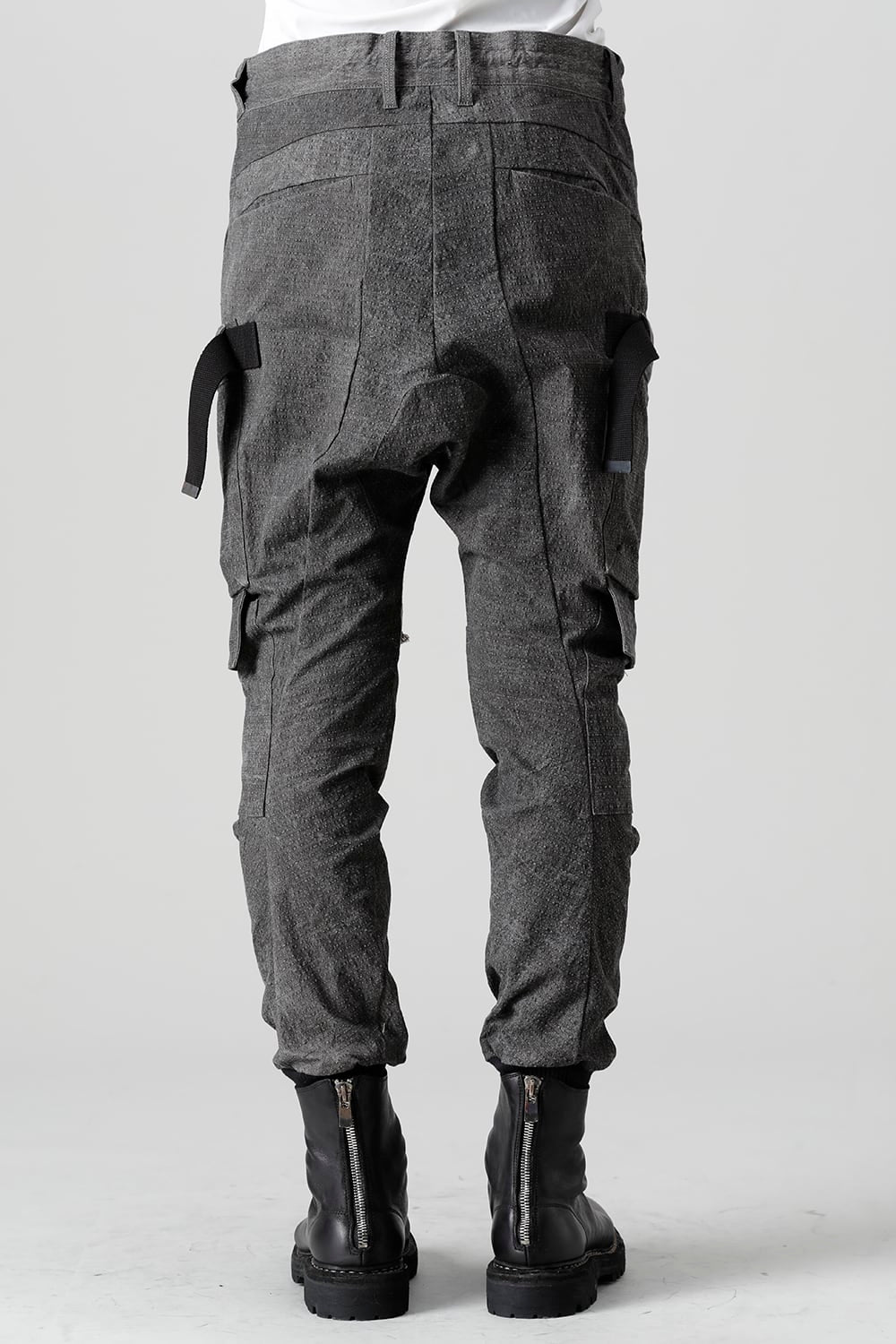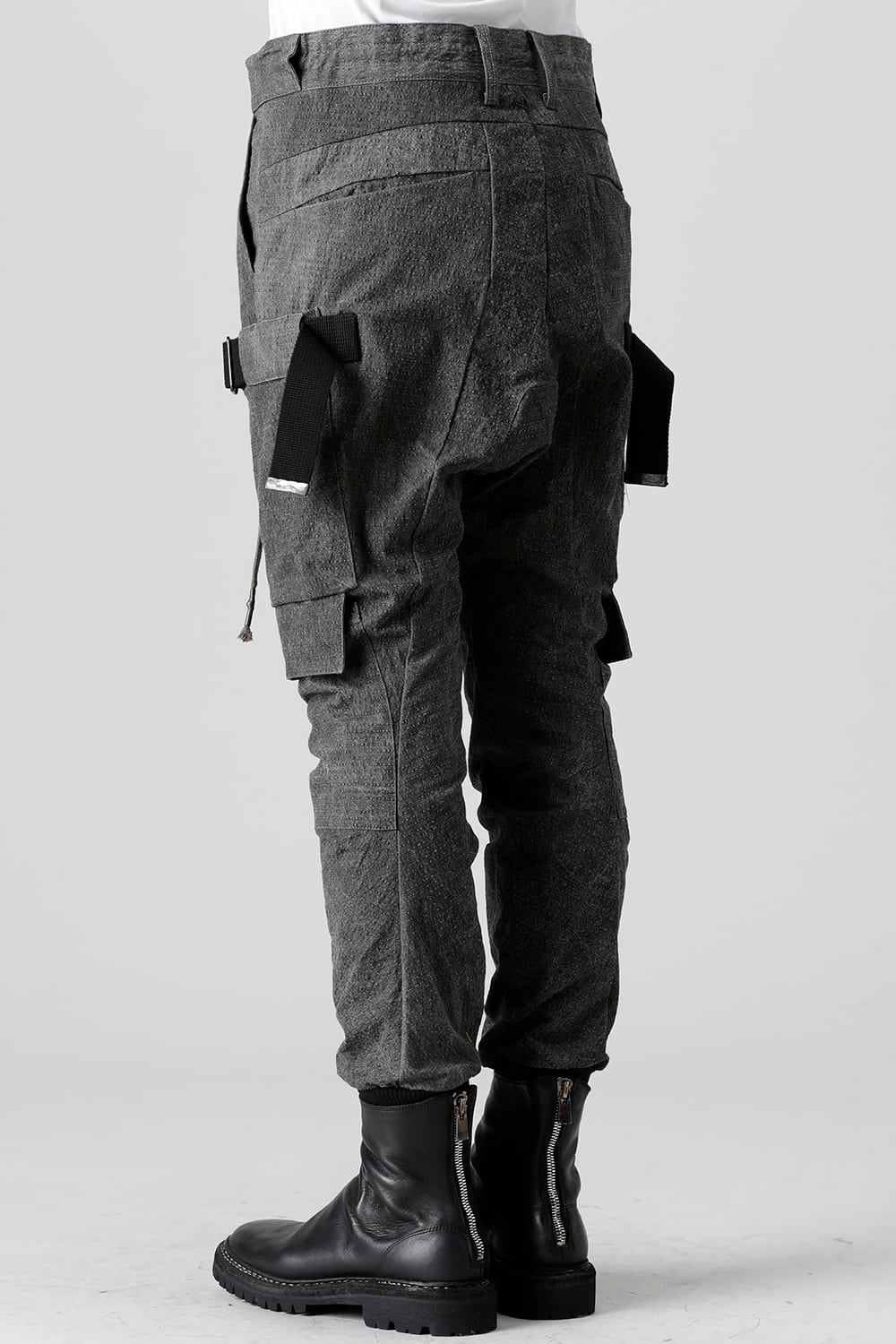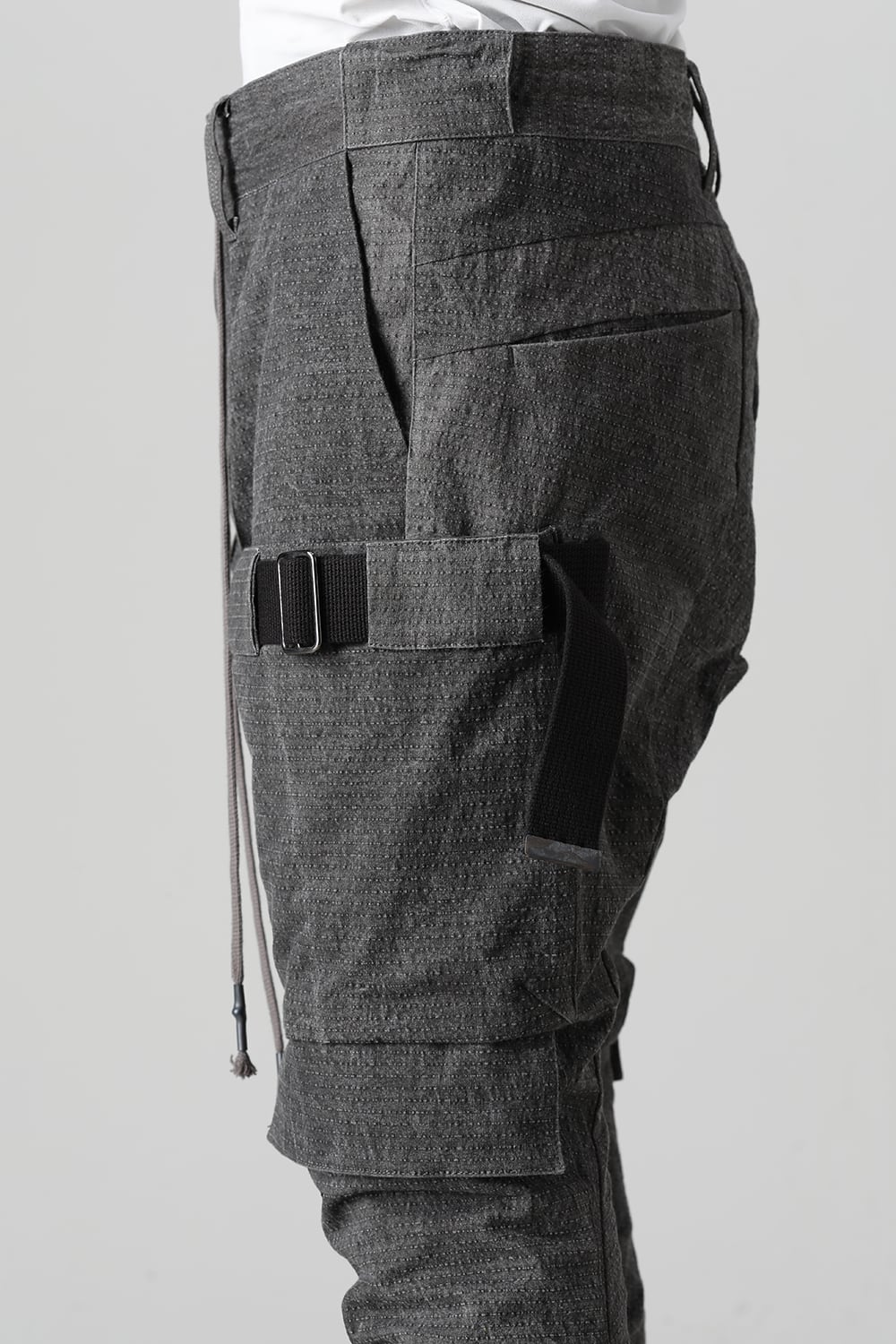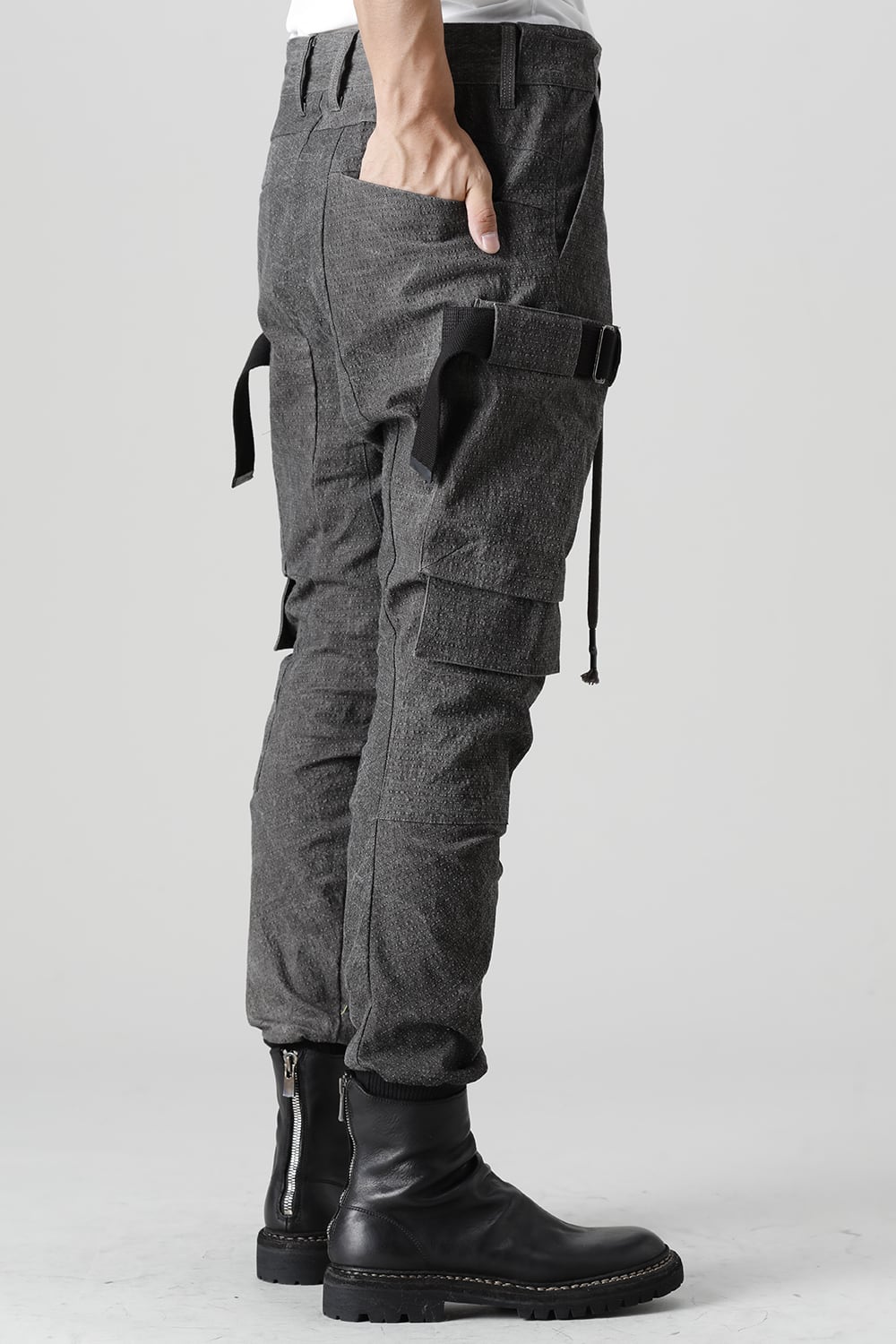 "・ワッシャー染色を施し天日乾燥させることで表面にボコボコのシワを生み出したストレッチ性のあるコットンリップストップ生地。C/#DUSTは墨染、C/#ブラックは反応染めにて染色しています。・ブッシュポケットに加え膝位置にカーゴポケットも配置することでインパクトのある表情に仕上げています。・股上を深く設定したドロップクロッチスリムシルエット。"