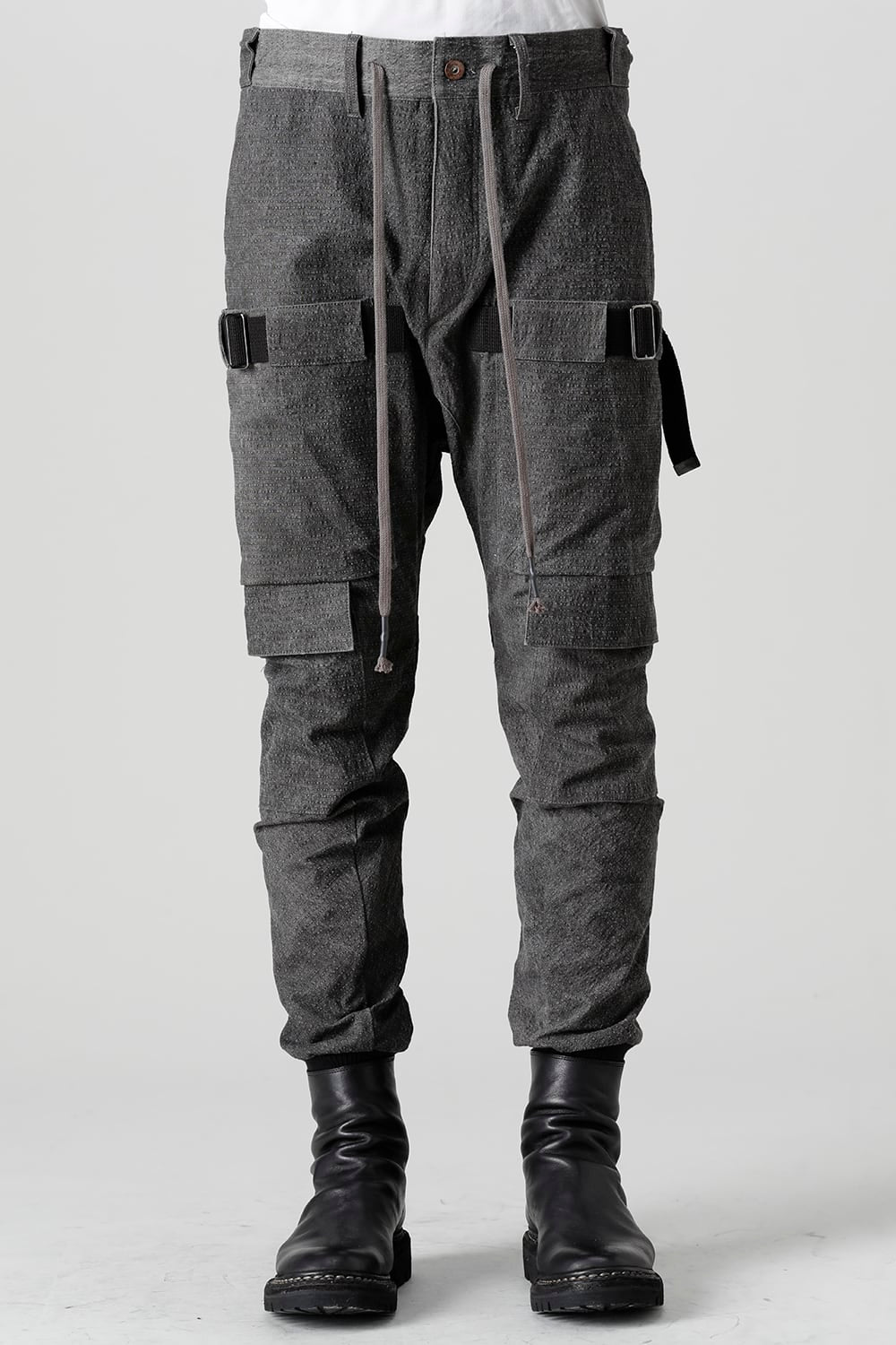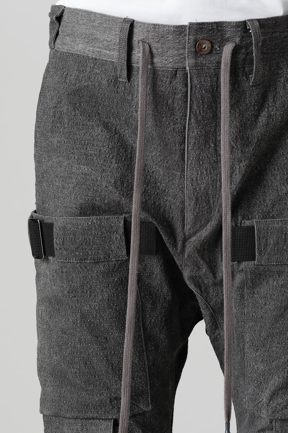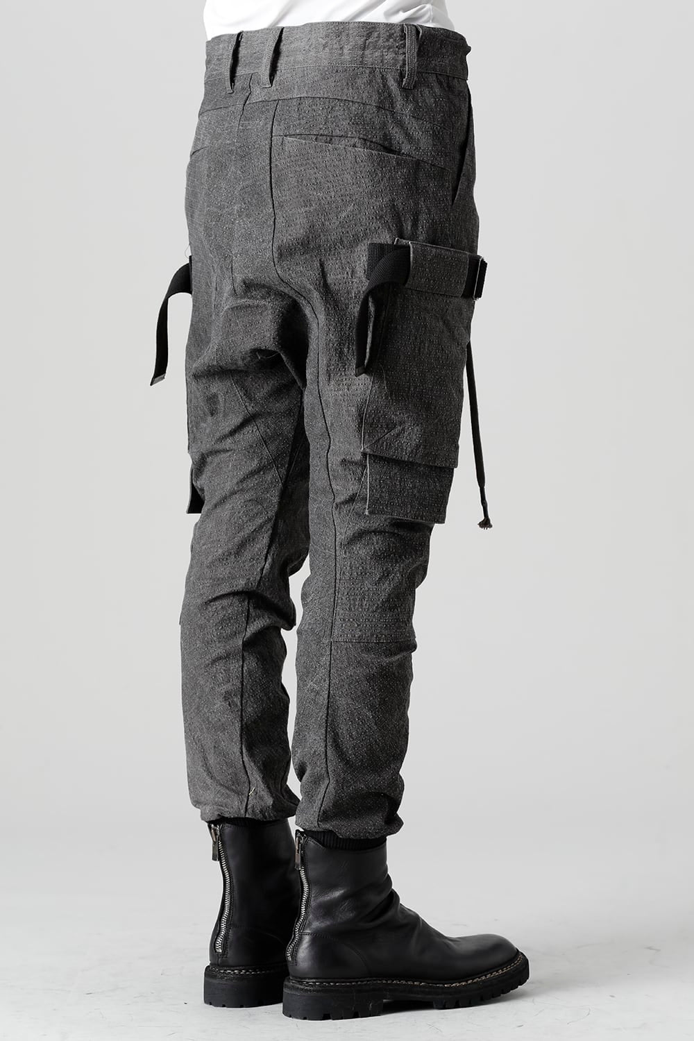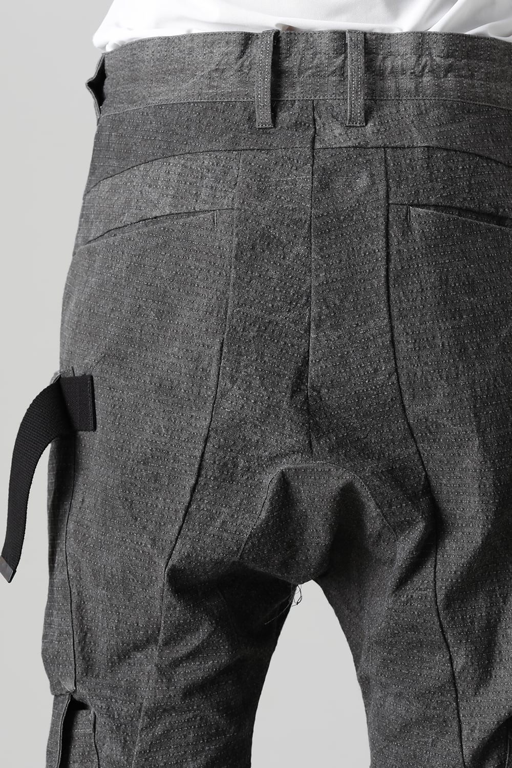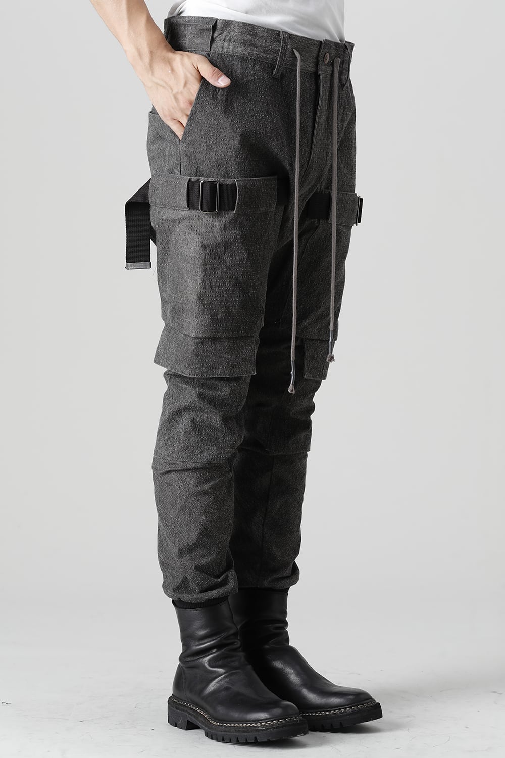 "・ワッシャー染色を施し天日乾燥させることで表面にボコボコのシワを生み出したストレッチ性のあるコットンリップストップ生地。C/#DUSTは墨染、C/#ブラックは反応染めにて染色しています。・ブッシュポケットに加え膝位置にカーゴポケットも配置することでインパクトのある表情に仕上げています。・股上を深く設定したドロップクロッチスリムシルエット。"