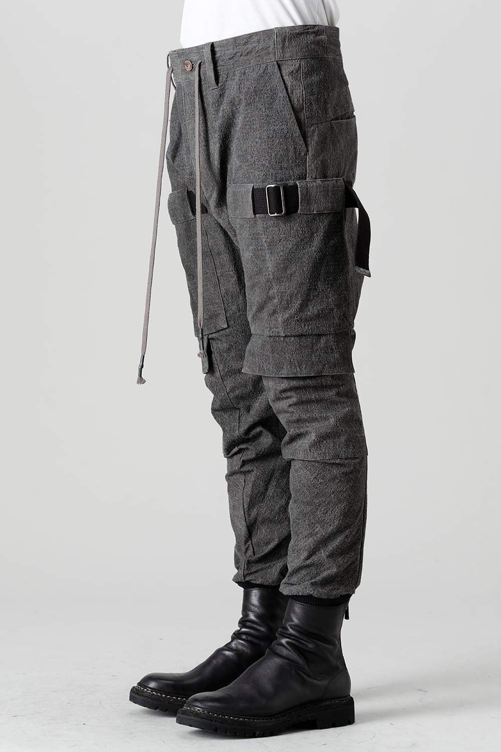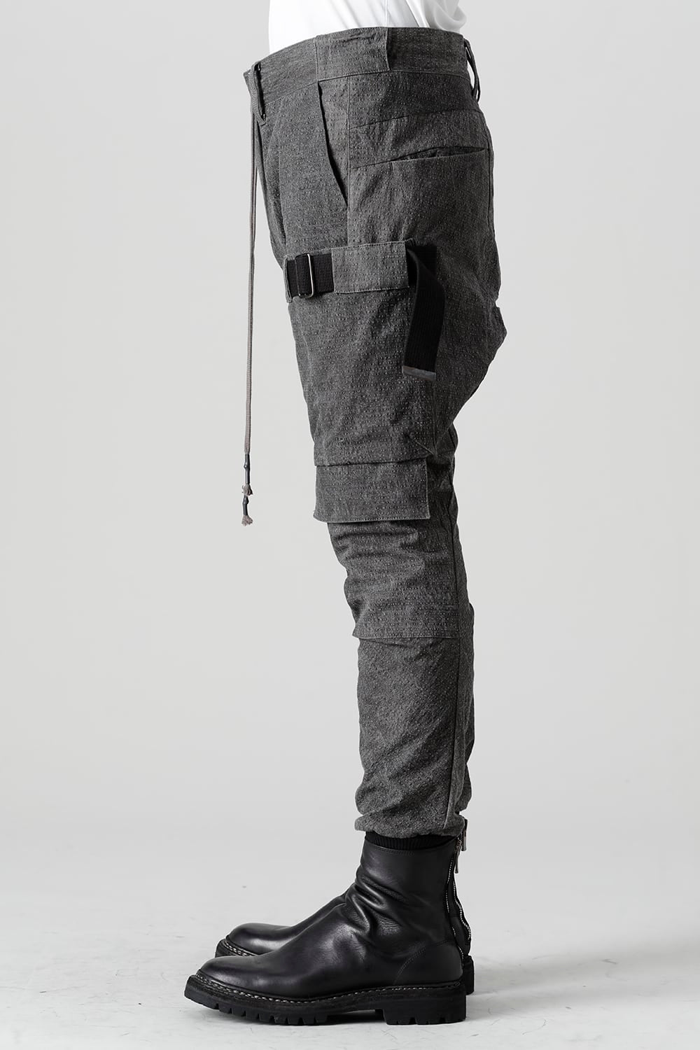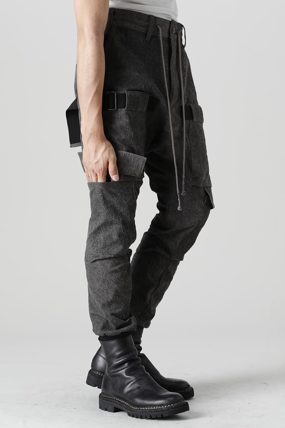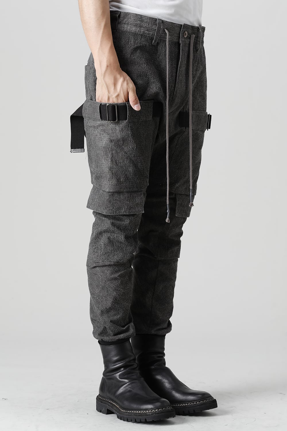 "・ワッシャー染色を施し天日乾燥させることで表面にボコボコのシワを生み出したストレッチ性のあるコットンリップストップ生地。C/#DUSTは墨染、C/#ブラックは反応染めにて染色しています。・ブッシュポケットに加え膝位置にカーゴポケットも配置することでインパクトのある表情に仕上げています。・股上を深く設定したドロップクロッチスリムシルエット。"