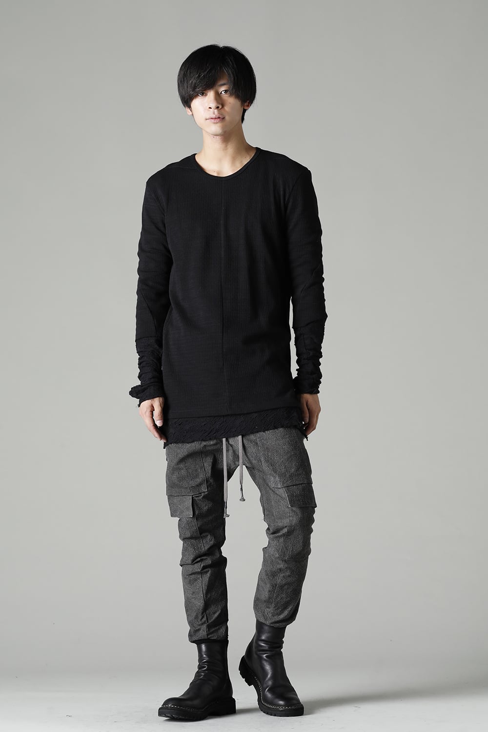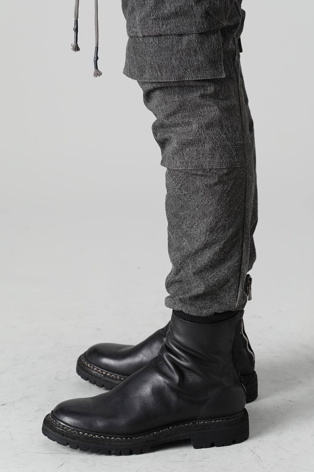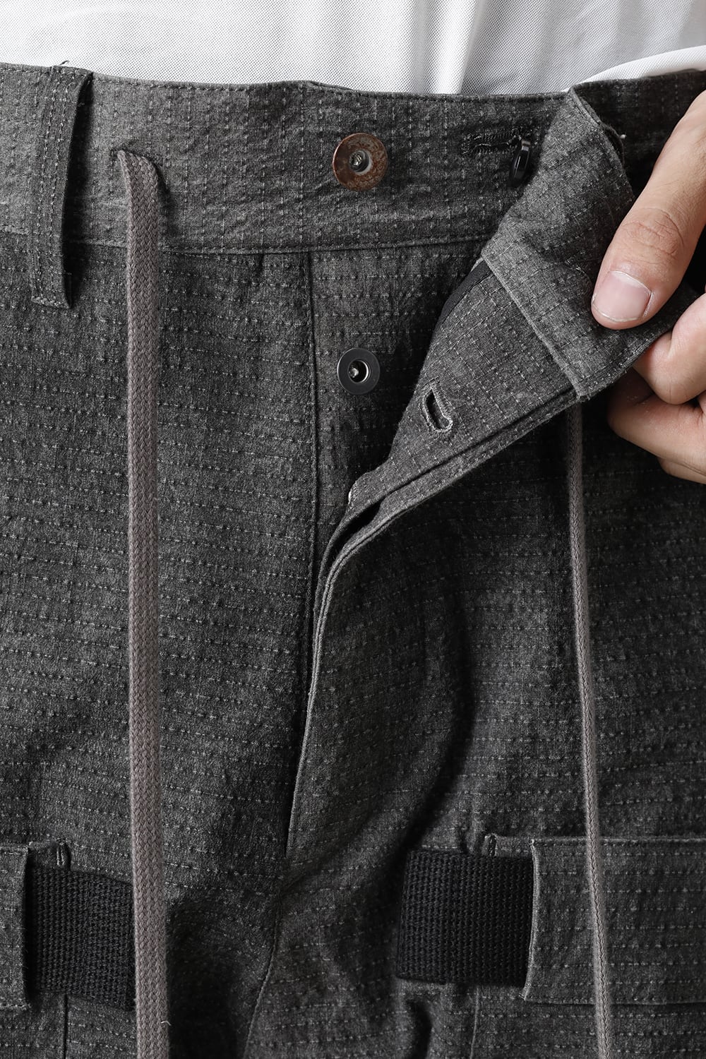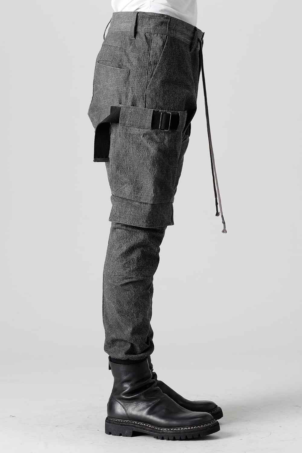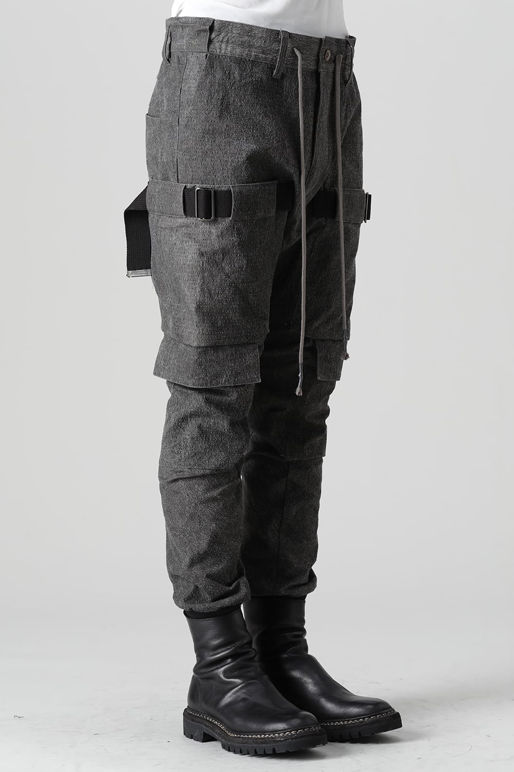 "・ワッシャー染色を施し天日乾燥させることで表面にボコボコのシワを生み出したストレッチ性のあるコットンリップストップ生地。C/#DUSTは墨染、C/#ブラックは反応染めにて染色しています。・ブッシュポケットに加え膝位置にカーゴポケットも配置することでインパクトのある表情に仕上げています。・股上を深く設定したドロップクロッチスリムシルエット。"