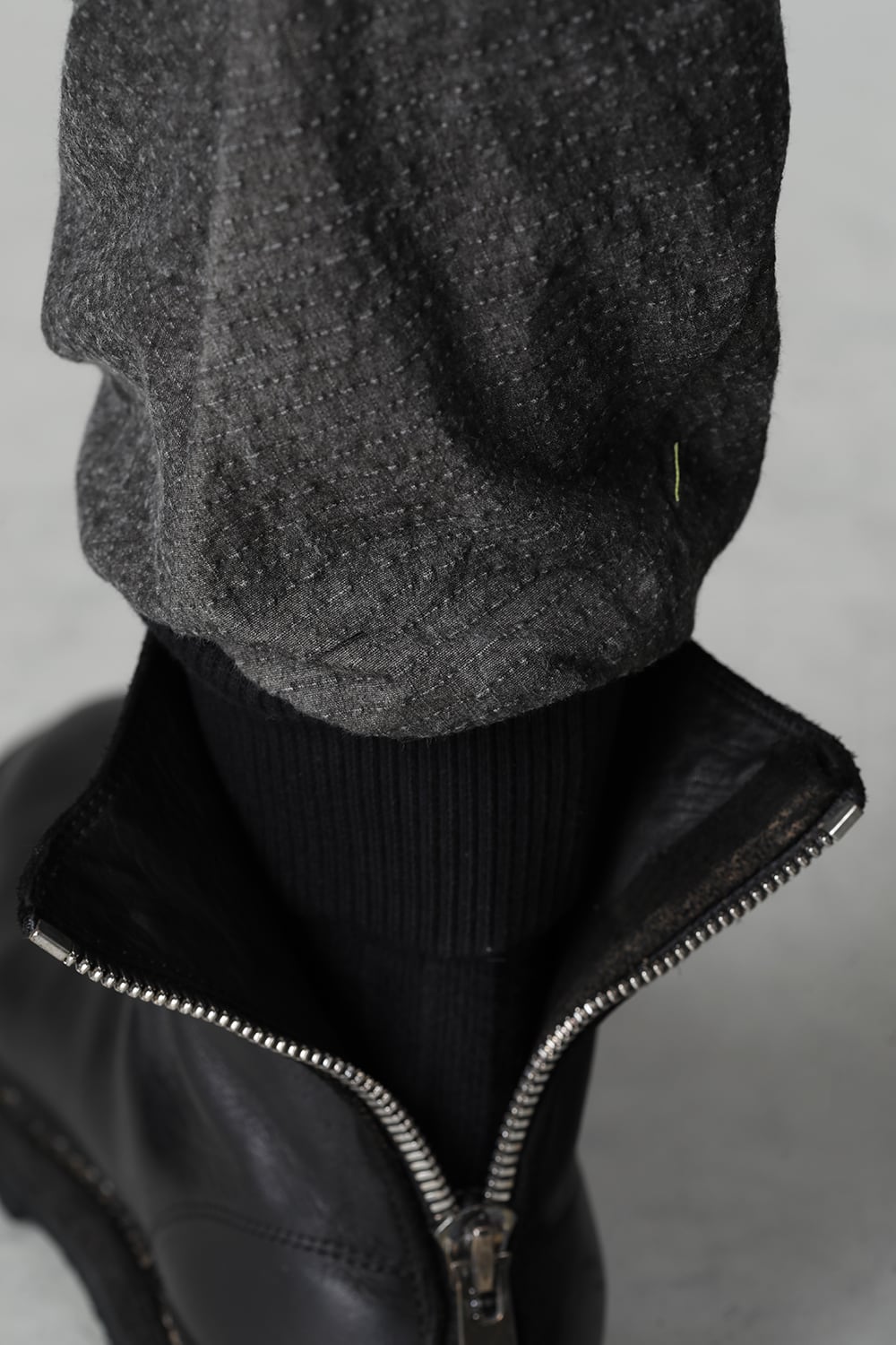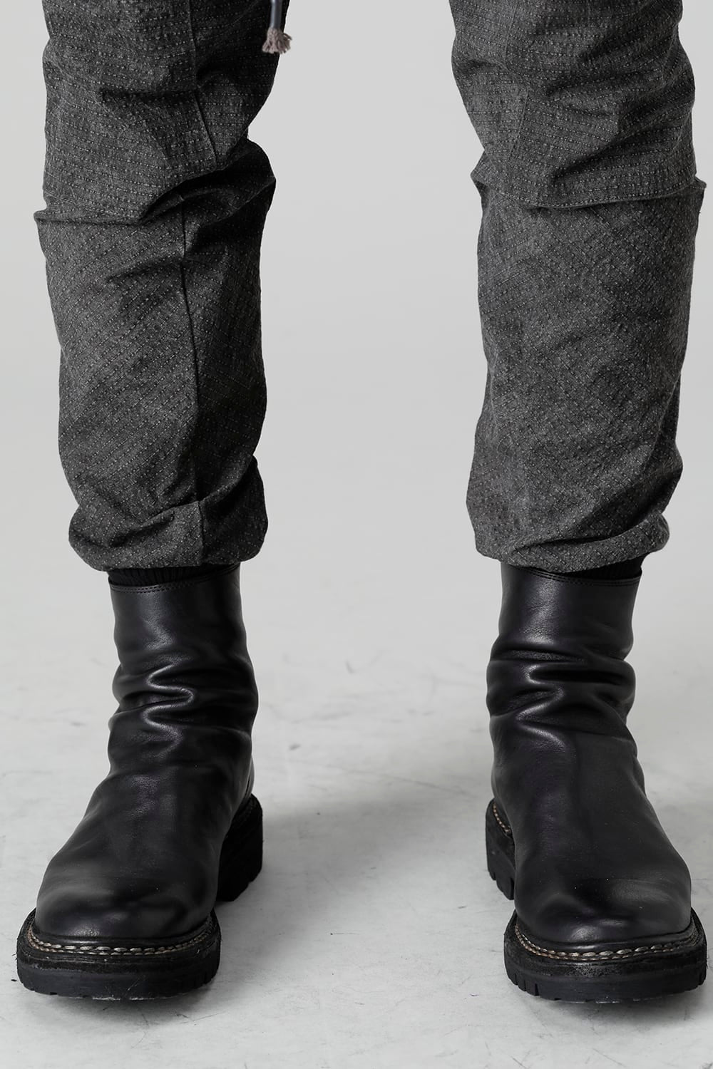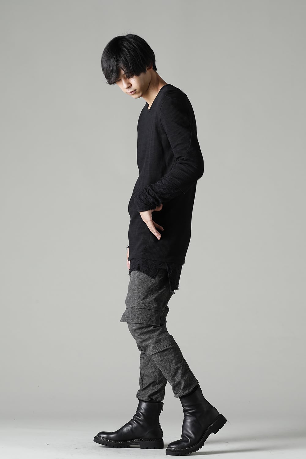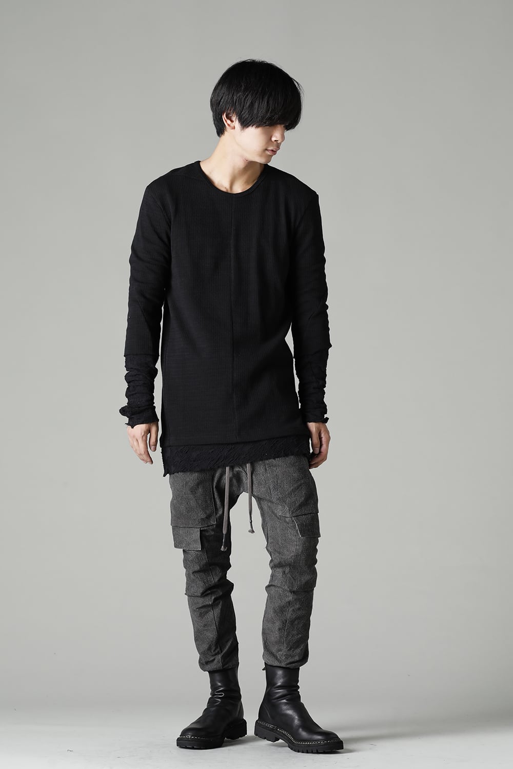 "・ワッシャー染色を施し天日乾燥させることで表面にボコボコのシワを生み出したストレッチ性のあるコットンリップストップ生地。C/#DUSTは墨染、C/#ブラックは反応染めにて染色しています。・ブッシュポケットに加え膝位置にカーゴポケットも配置することでインパクトのある表情に仕上げています。・股上を深く設定したドロップクロッチスリムシルエット。"