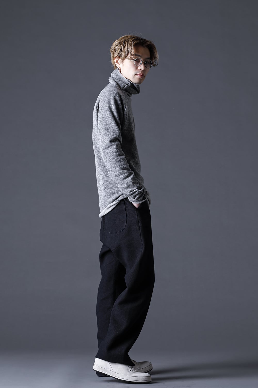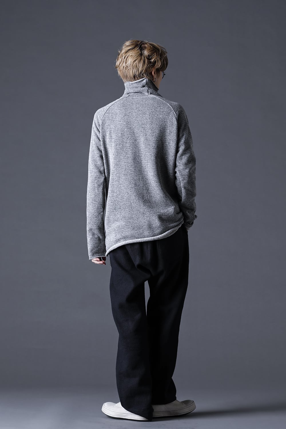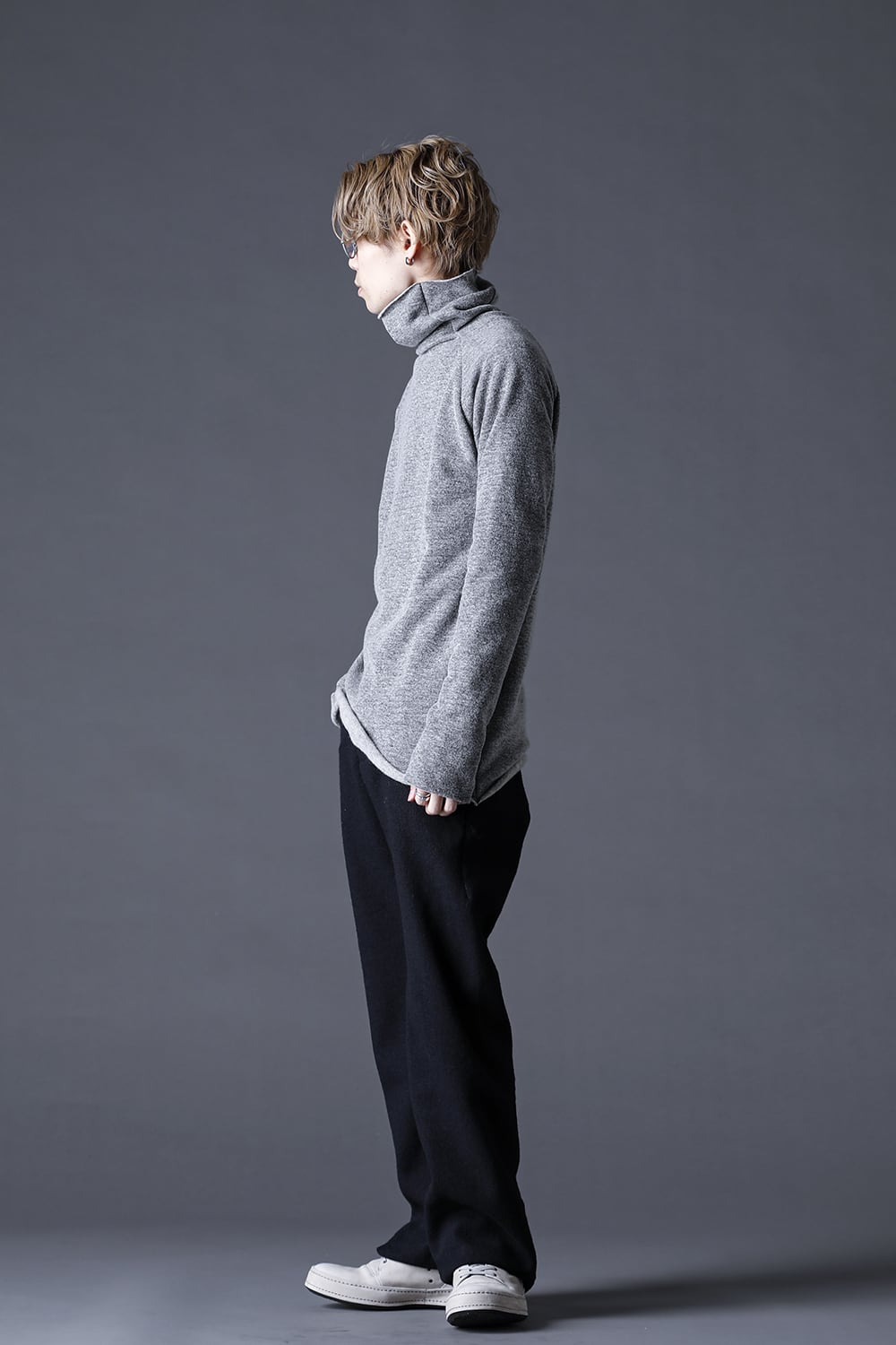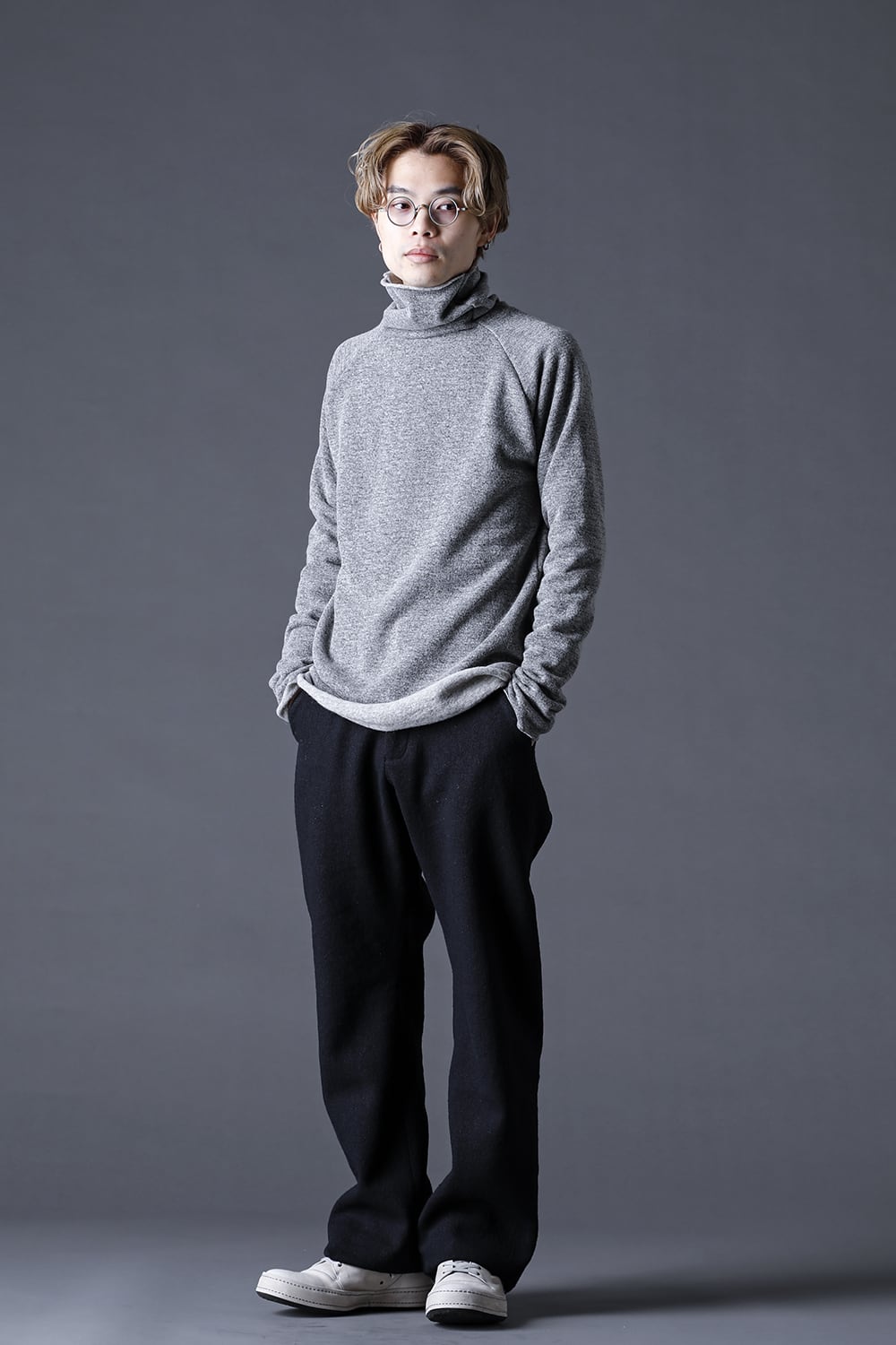 wareの定番のボトルネックニット。 少し長めの着丈でジャケットやコート等、合わせるアウターを選ばず丁度良いバランスに纏まり、冬場のインナーとして活躍するwareの万能アイテム。ディテールはラグランスリーブでネック、袖先、裾全て断ち切り仕様になっております。素材はイタリア マペル社のもので、1980年創立の老舗生地メーカーです。ニット素材を得意とする生地メーカーで、ウール素材を主体とし、ポリエステル等の化学繊維とを組み合わせることにより、柔らかく暖かいニット素材を作ることを得意としています。繊維と繊維と隙間に暖かい空気をため込みますので暖かく、ふんわりとした軽い着心地が特徴です。どちらも内側の色が淡くツートーン調になっており、グレーとグレーベージュの2色展開です。