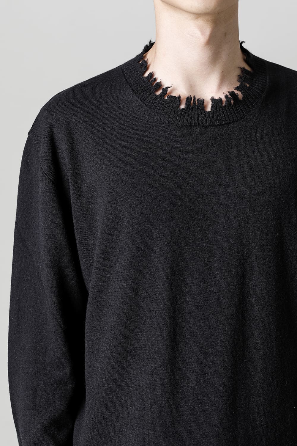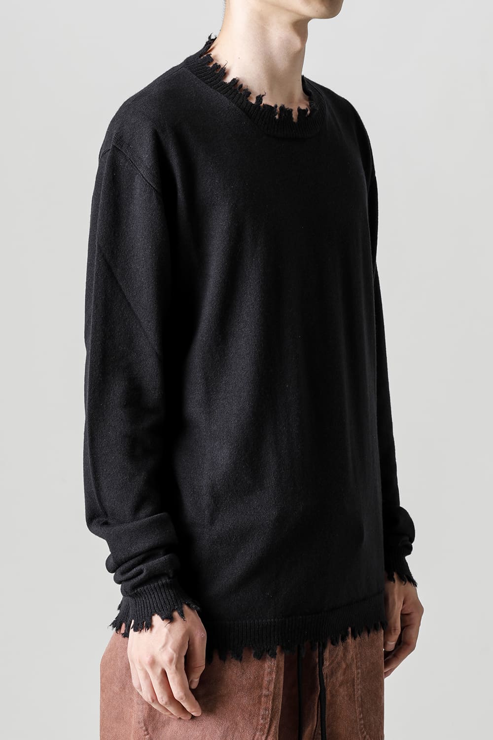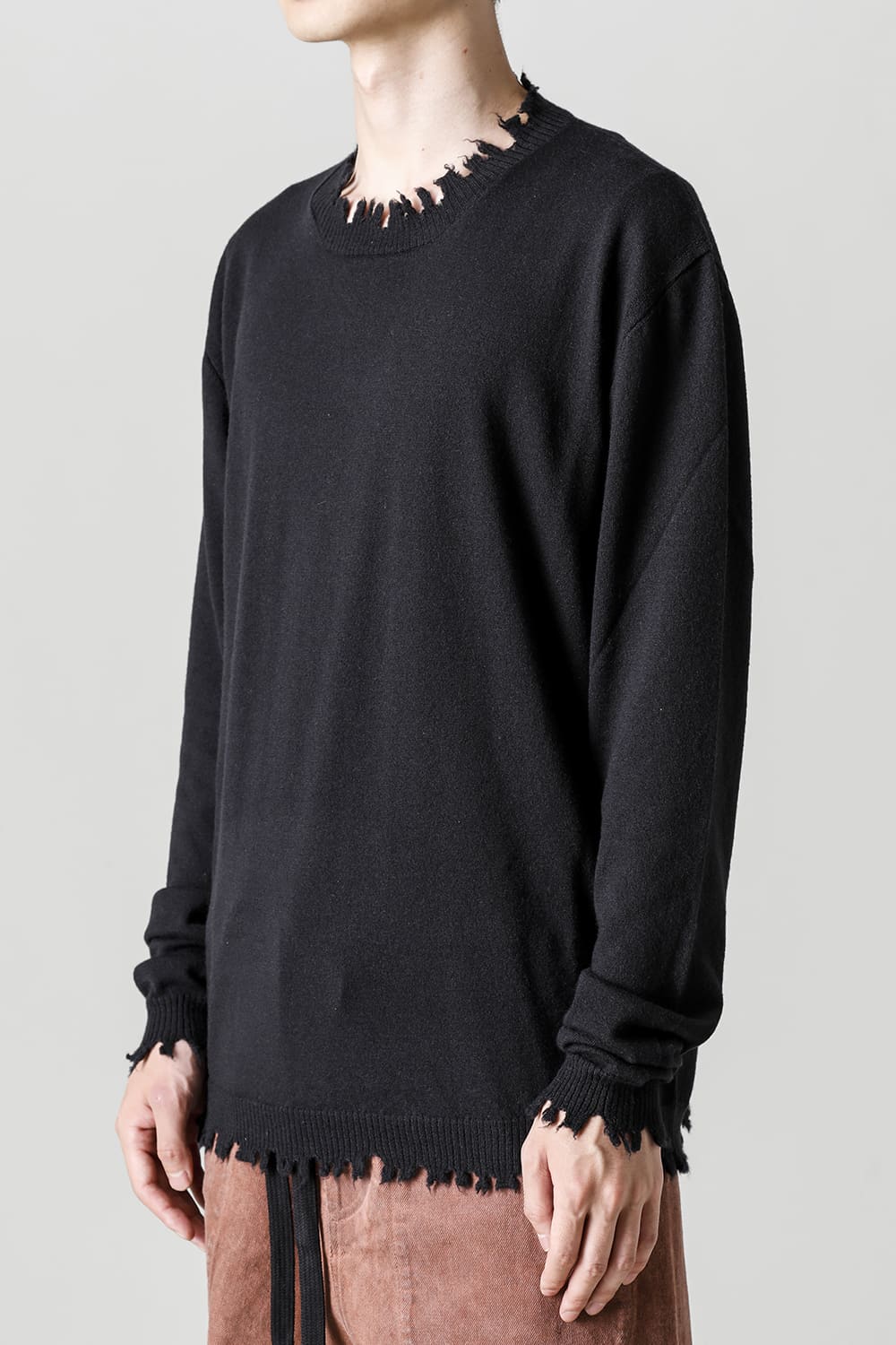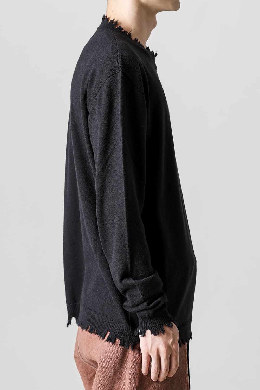 シンプルなデザインをベースに裾、首元、袖口にブロークン加工を施してアクセントにしたクルーネックニット。丈感はコンパクトに、身幅などはスタンダードなニットと同程度のサイズ感です。カラーはブラックとオフホワイト。しっとりとした柔らかい肌触りのカシミアを使った非常に贅沢なニットは着用時のストレスを感じさせない癖になる肌触りを是非お試しください。