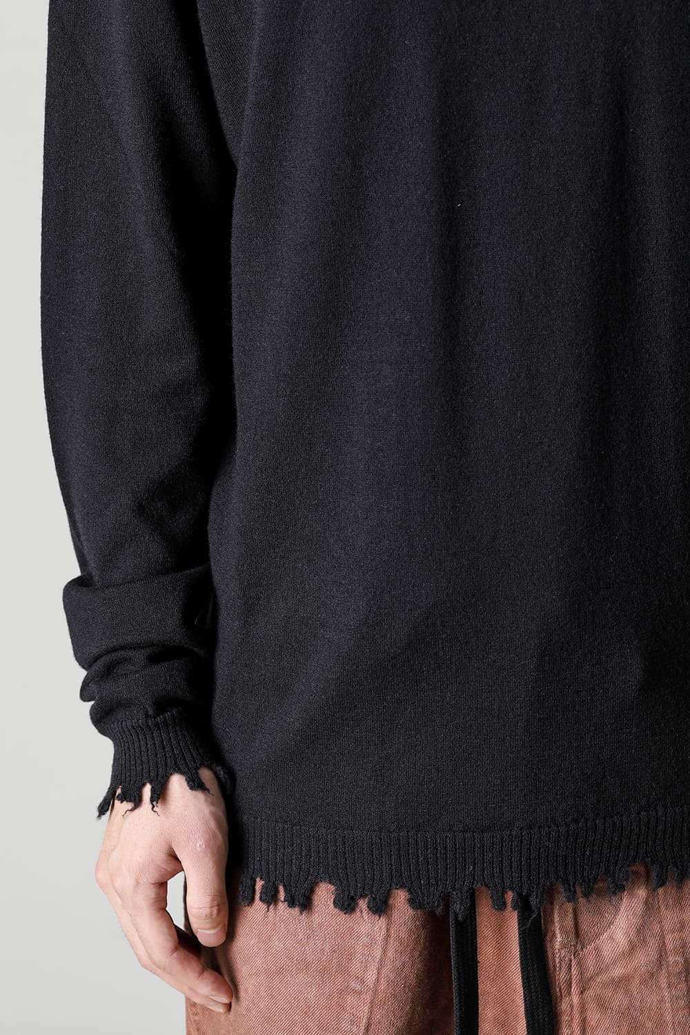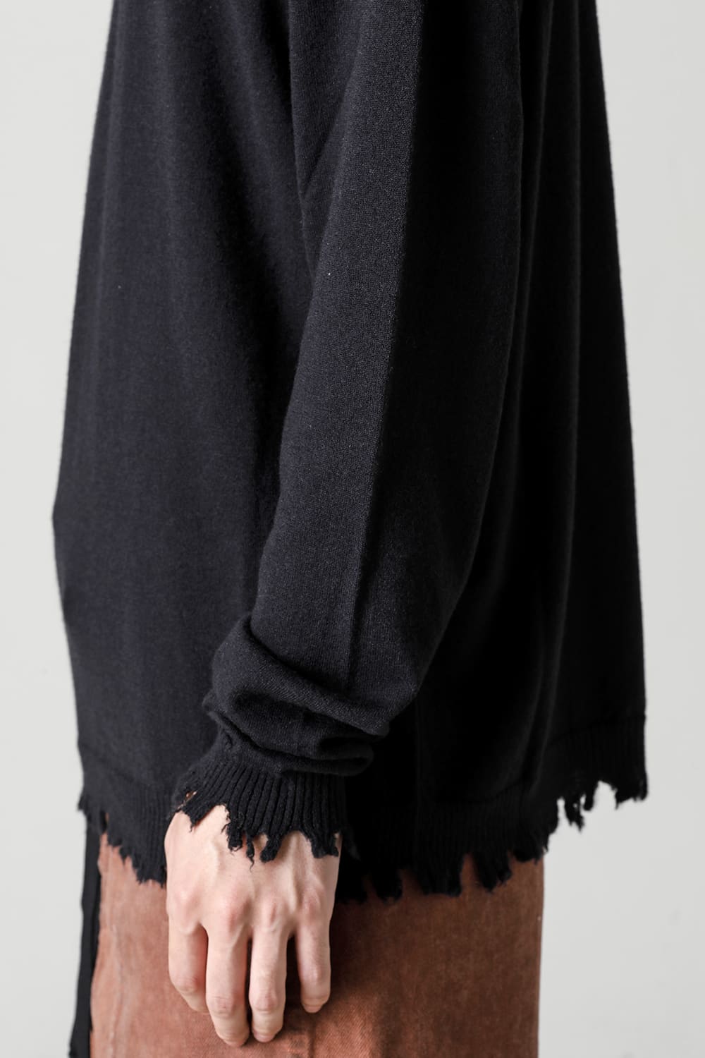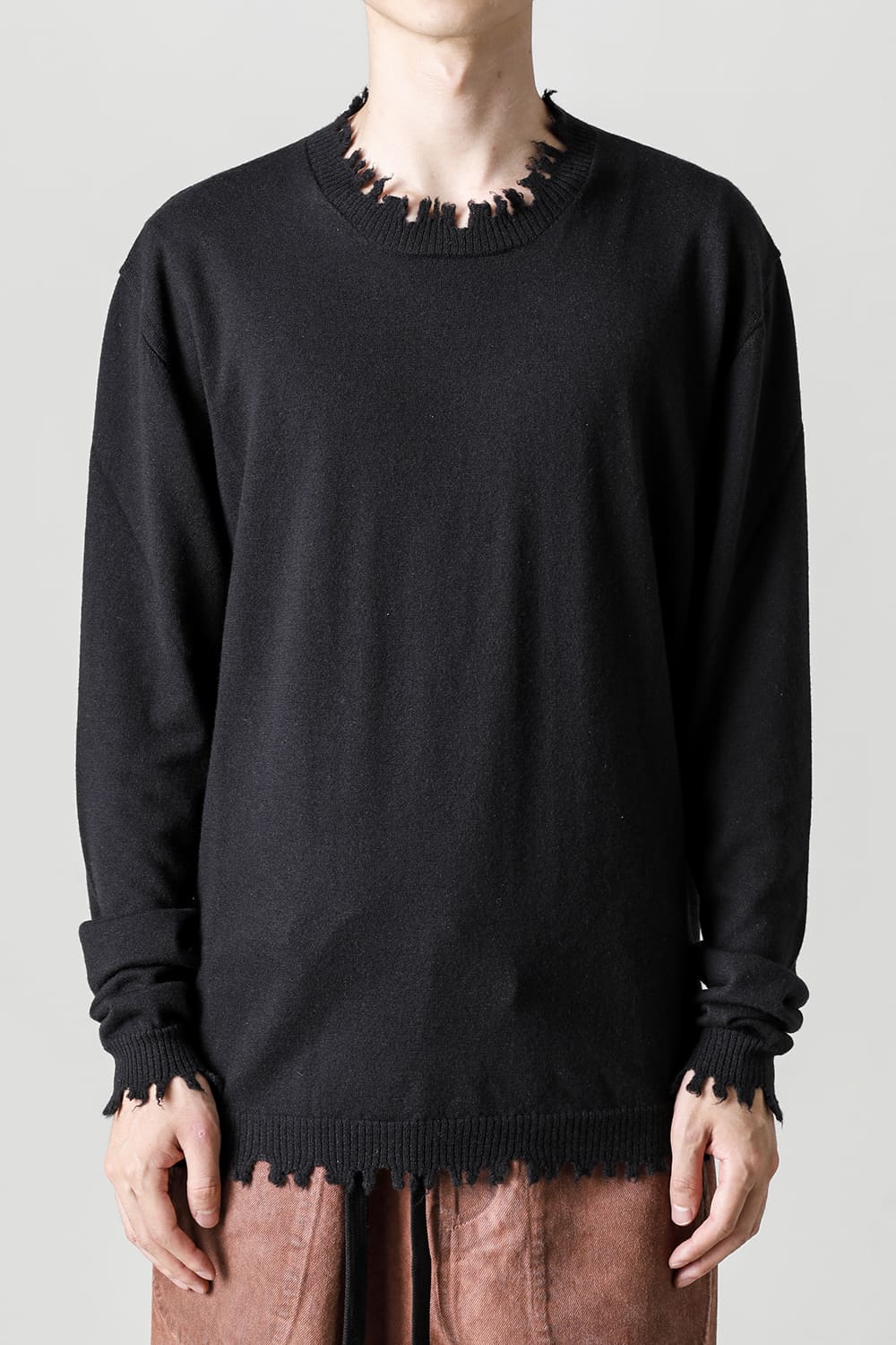 シンプルなデザインをベースに裾、首元、袖口にブロークン加工を施してアクセントにしたクルーネックニット。丈感はコンパクトに、身幅などはスタンダードなニットと同程度のサイズ感です。カラーはブラックとオフホワイト。しっとりとした柔らかい肌触りのカシミアを使った非常に贅沢なニットは着用時のストレスを感じさせない癖になる肌触りを是非お試しください。