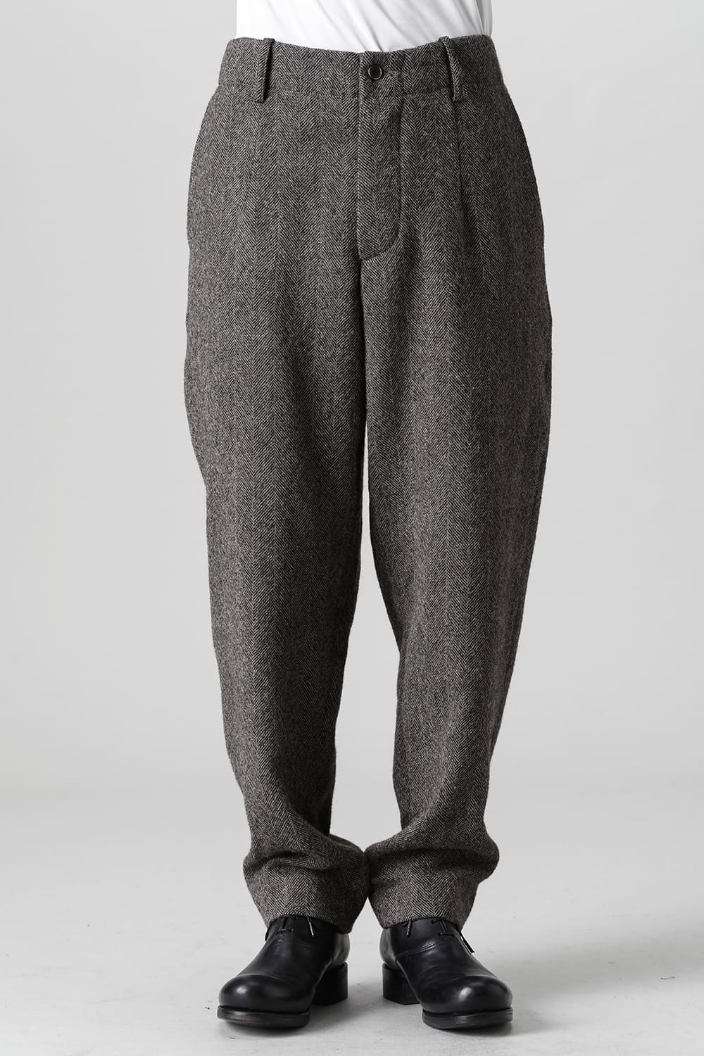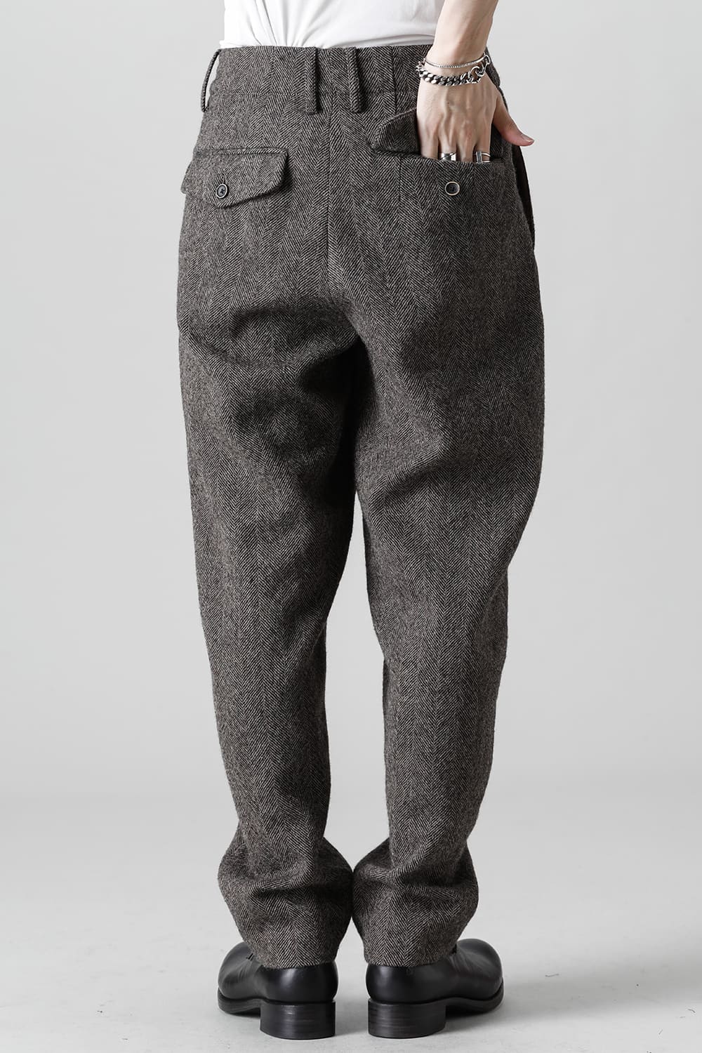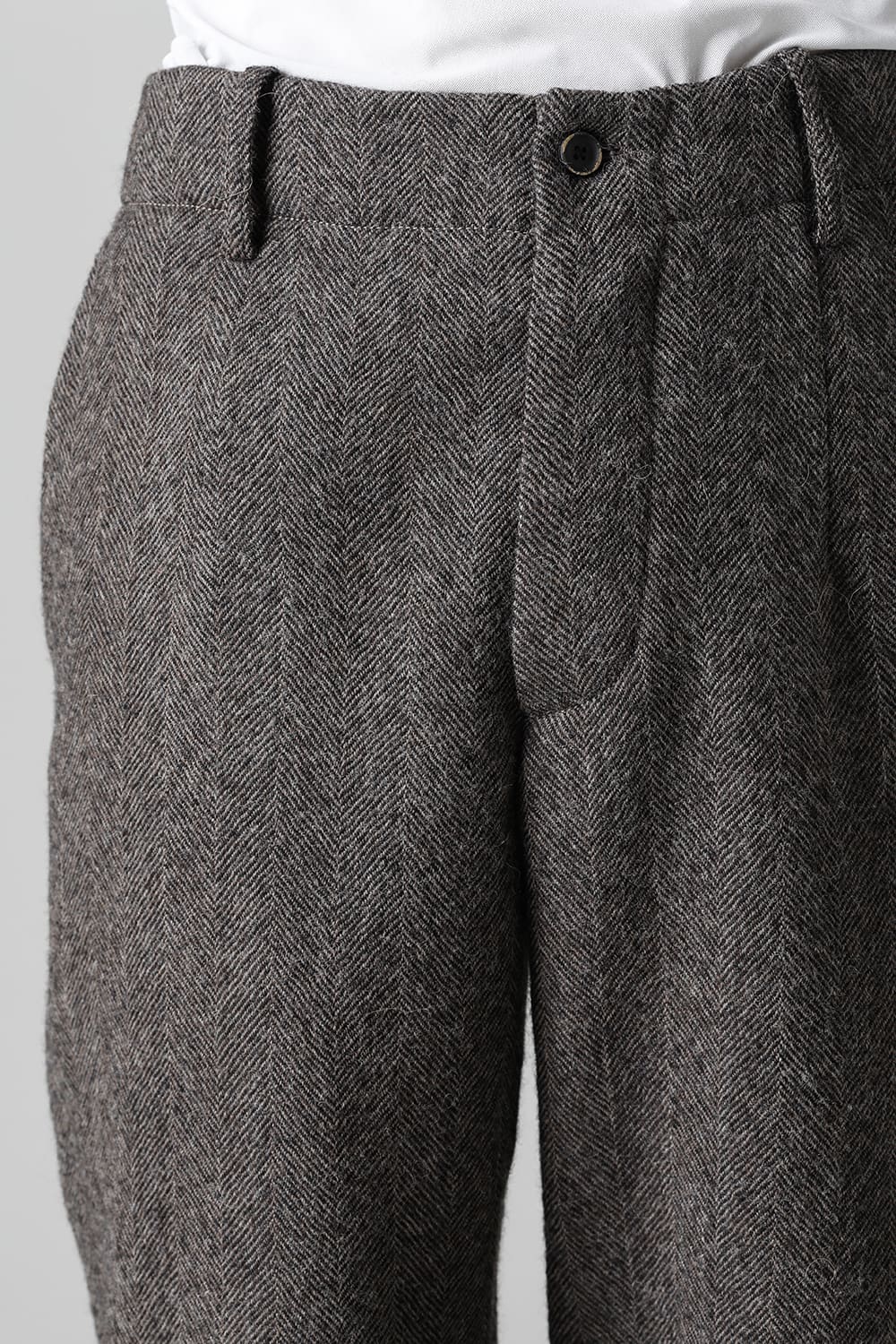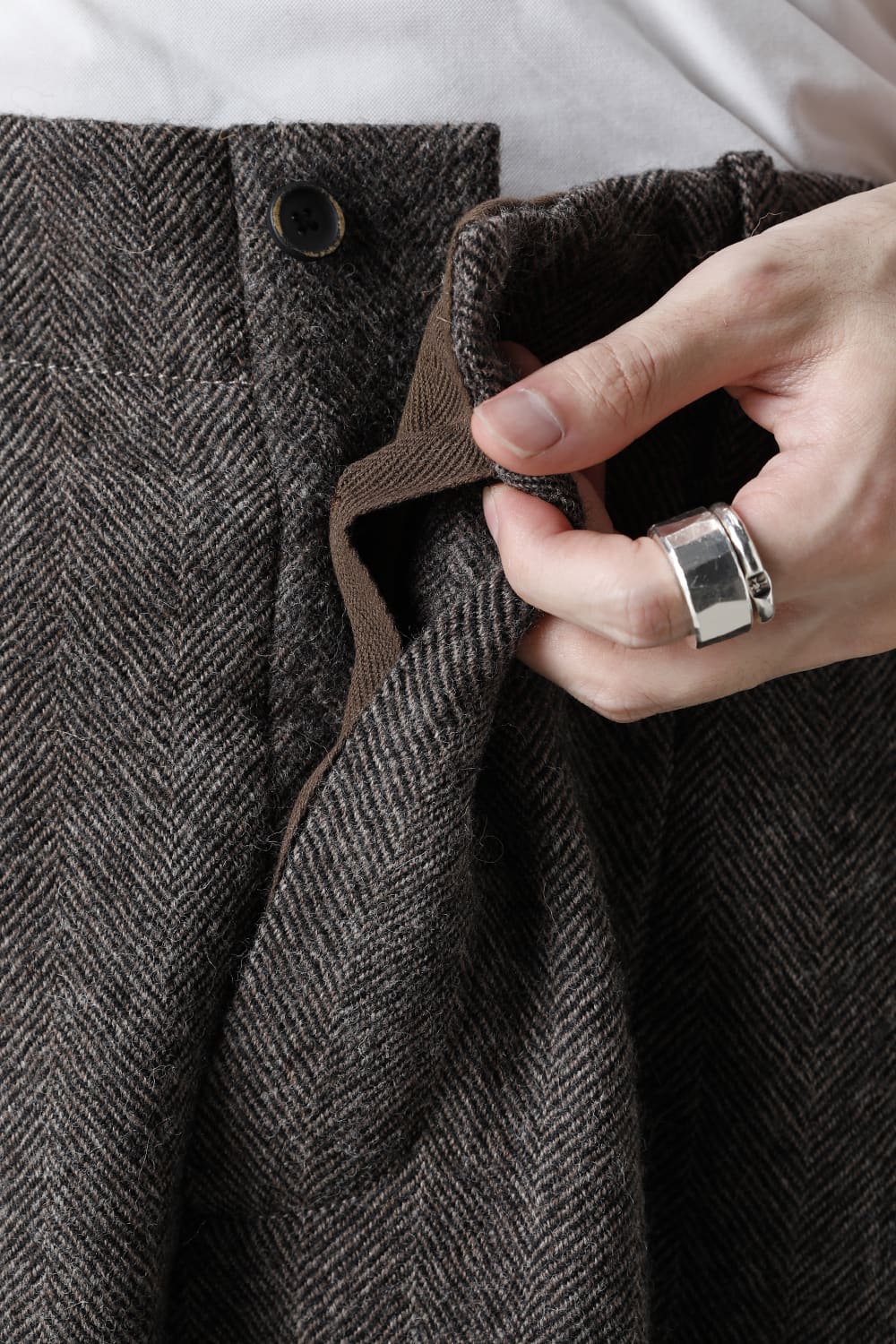 腿周りから裾先にかけて緩やかに細くなるテーパードシルエットのヘリンボーンツイードパンツ。 秋冬らしい表情を持った肉厚なツイードですが、着用感は非常に軽く快適な履きごこちです。