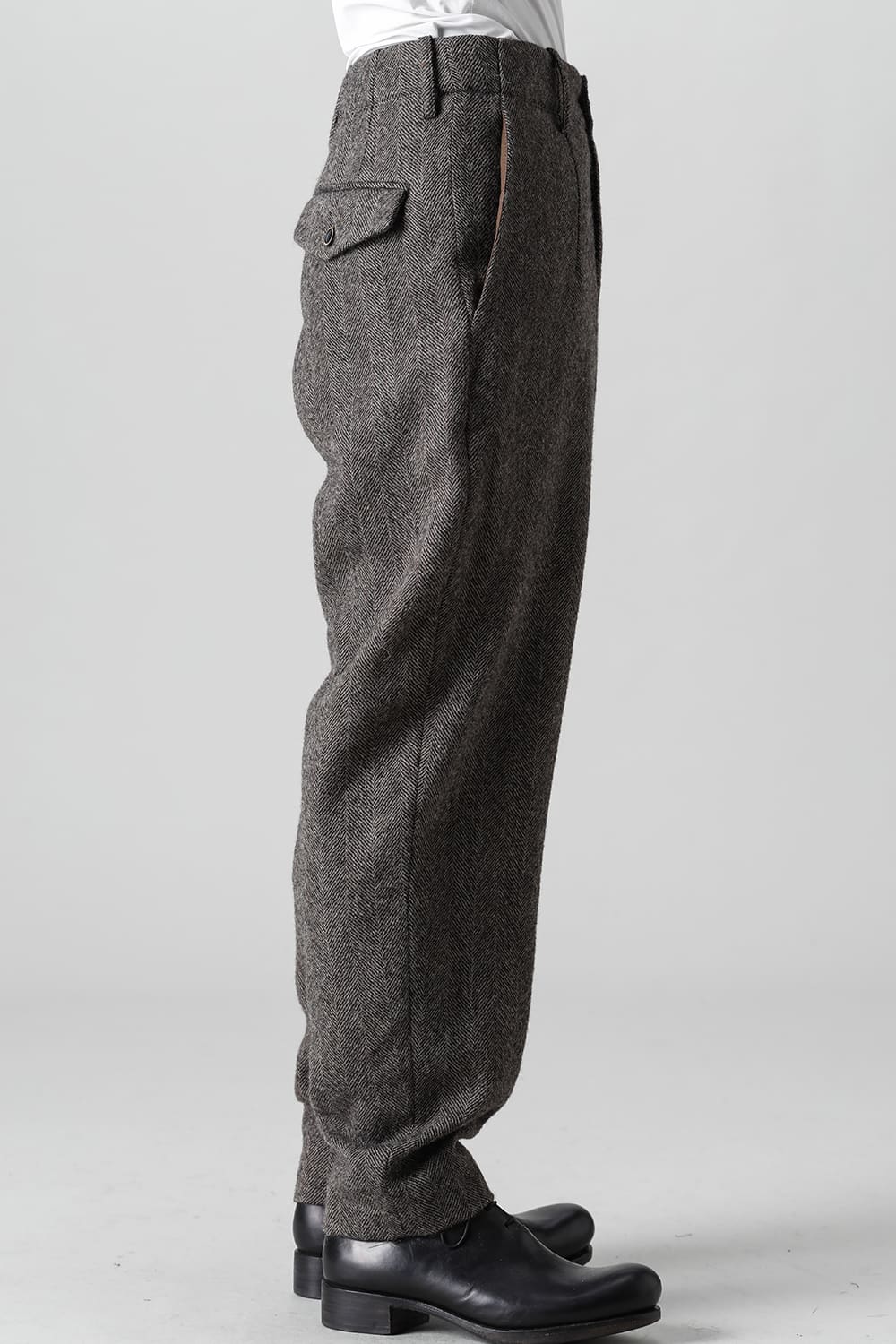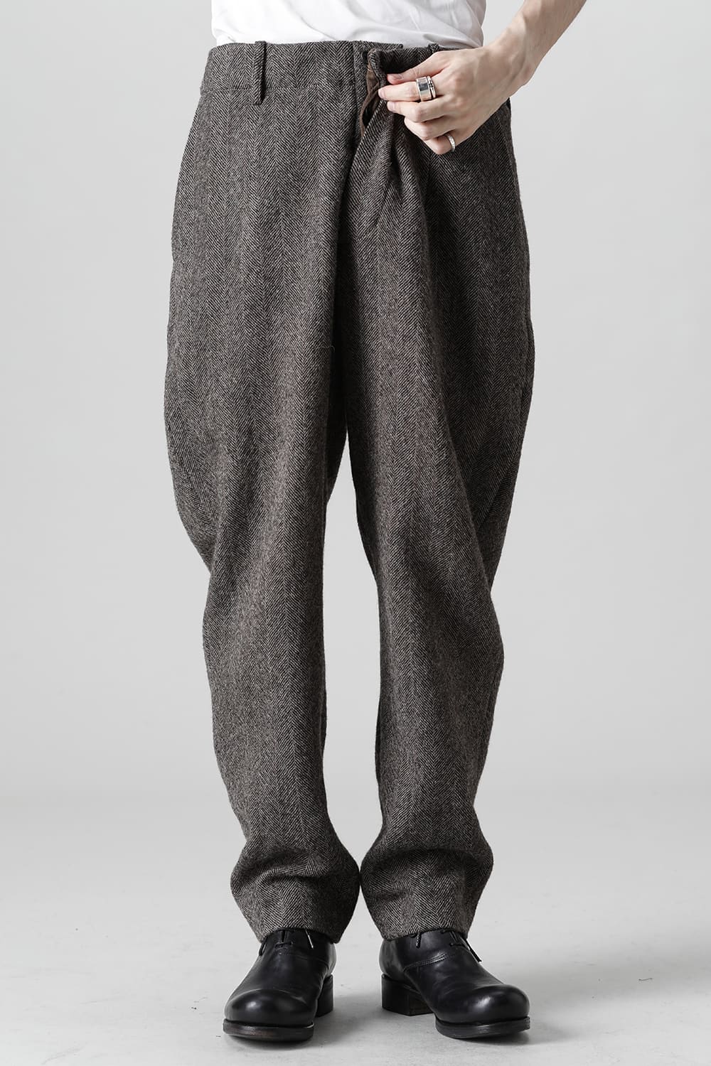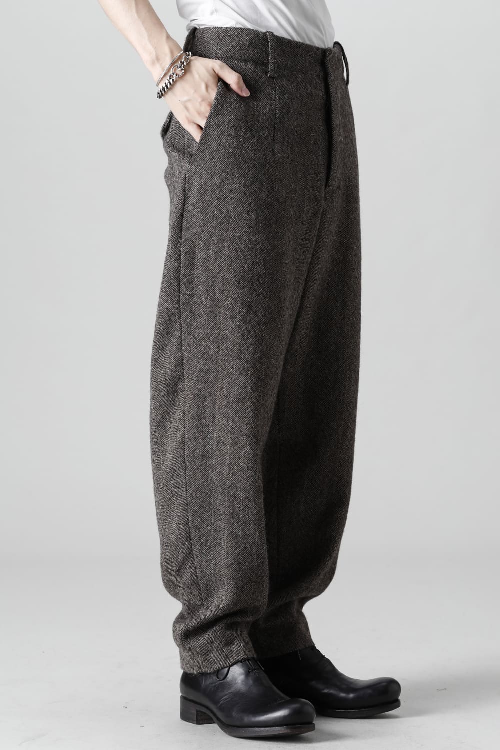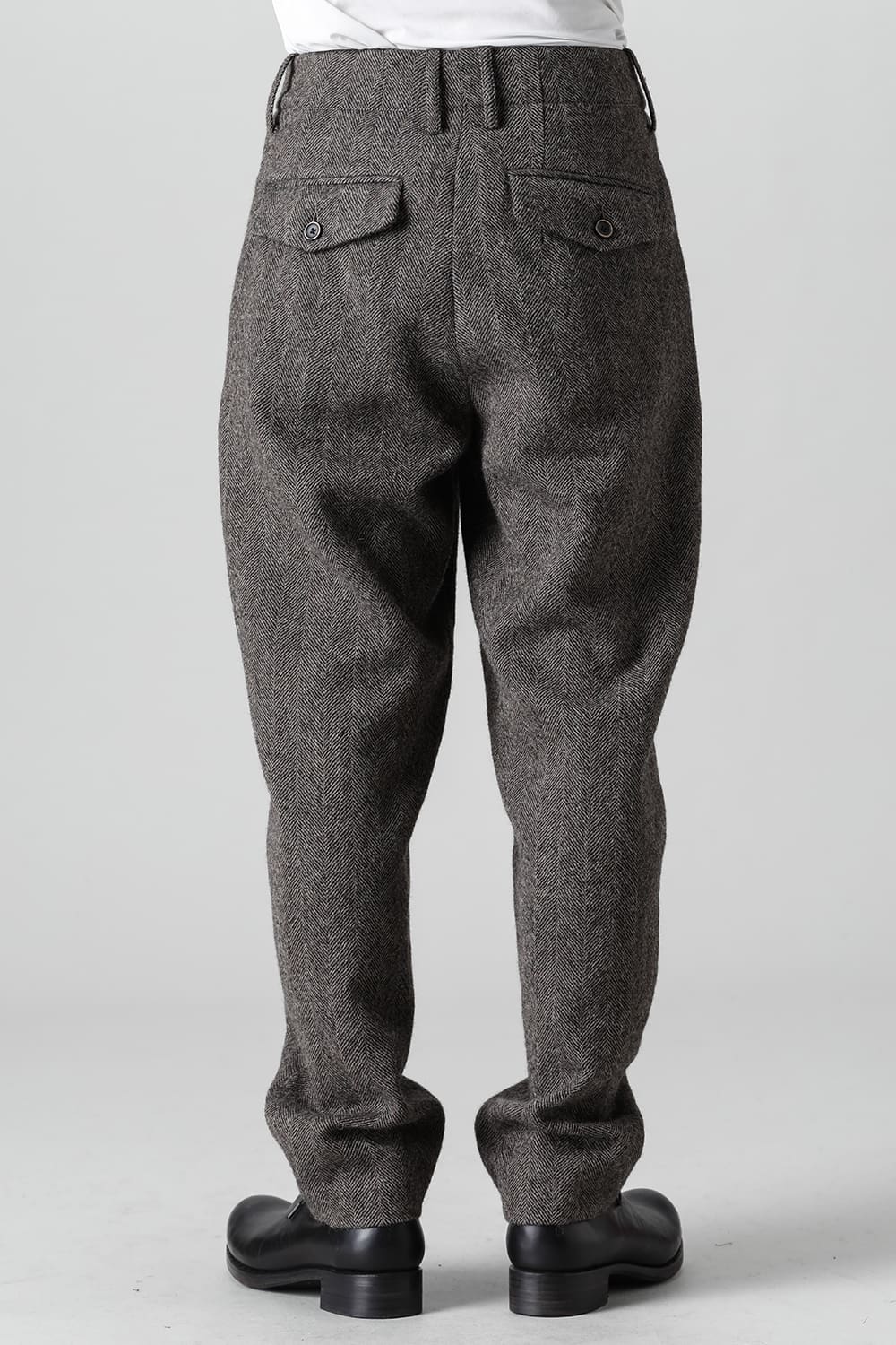 腿周りから裾先にかけて緩やかに細くなるテーパードシルエットのヘリンボーンツイードパンツ。 秋冬らしい表情を持った肉厚なツイードですが、着用感は非常に軽く快適な履きごこちです。