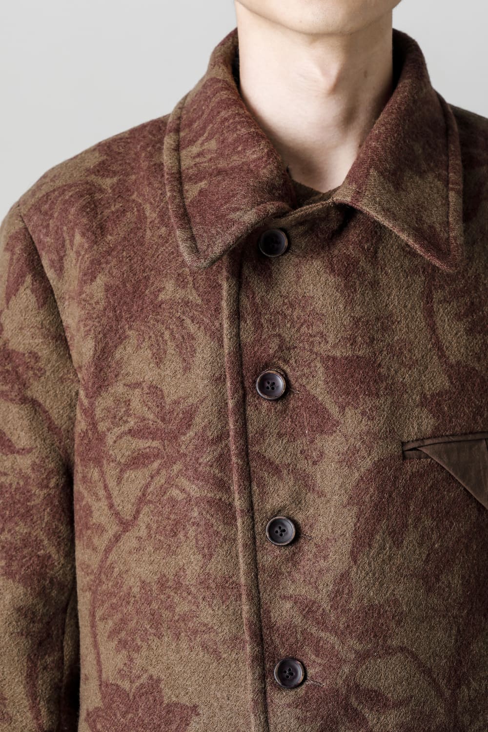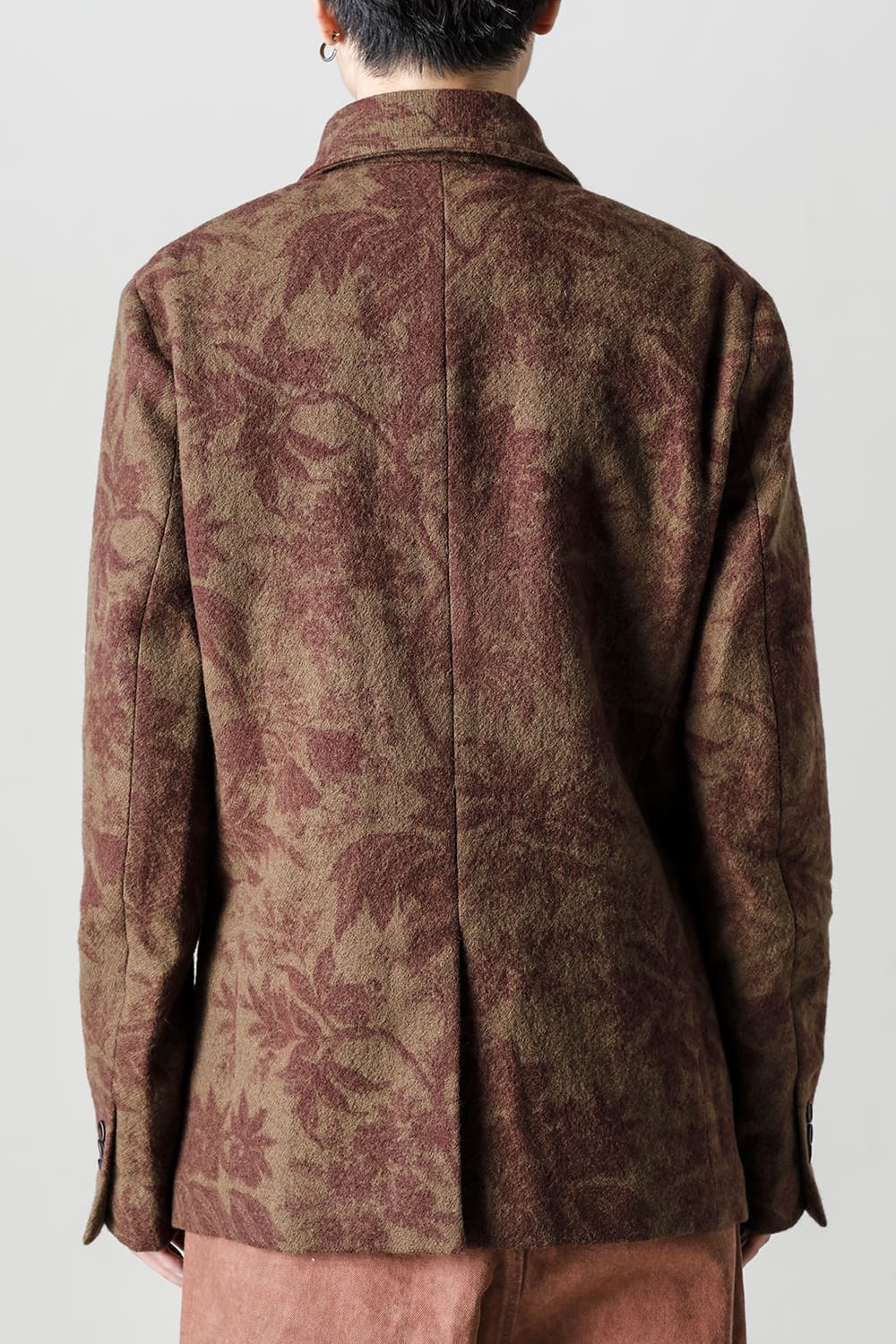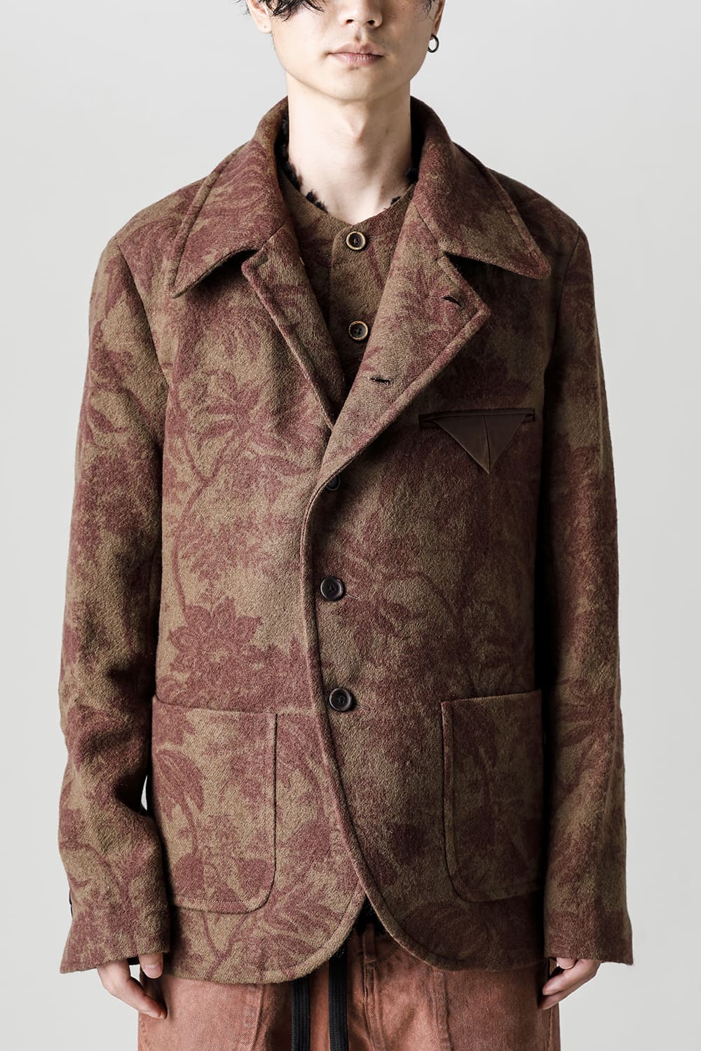 ミリタリージャケットをベースにデザインされた5ボタンジャケット。ボタンの開閉具合によってガラッと印象を変えることができます。胸ポケットにはフラップつき、パッチポケットが2つ袖口は本切羽、後ろ見頃にはセンターベンツが着きます。素材は繊細で味のあるヴァージンウール。オリエンタルな空気を醸し出すブラウンベースの生地にエンジ色でプリントされた植物の柄が印象的な1着です。同素材のベストUM6536-22AWとセットでの着用も可能です。ウール100%ですが、自宅での手洗い洗濯も可能です。