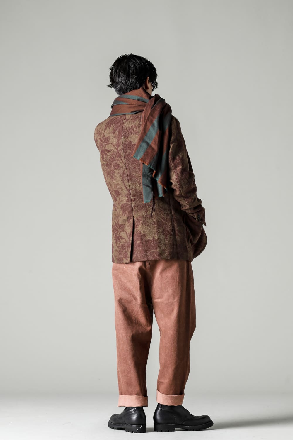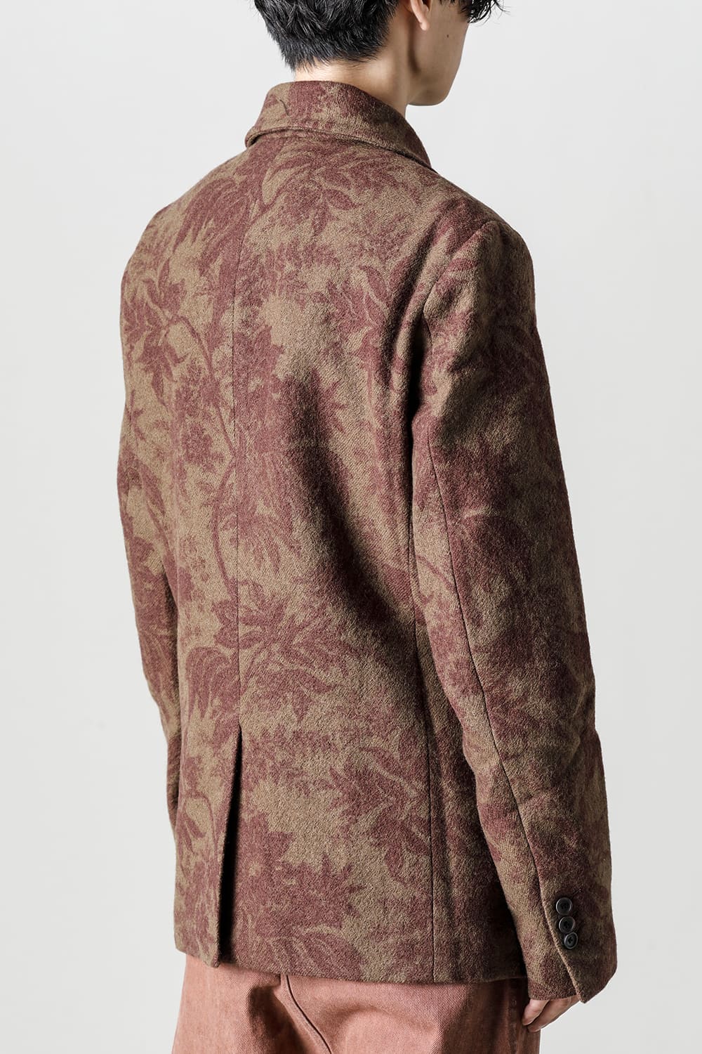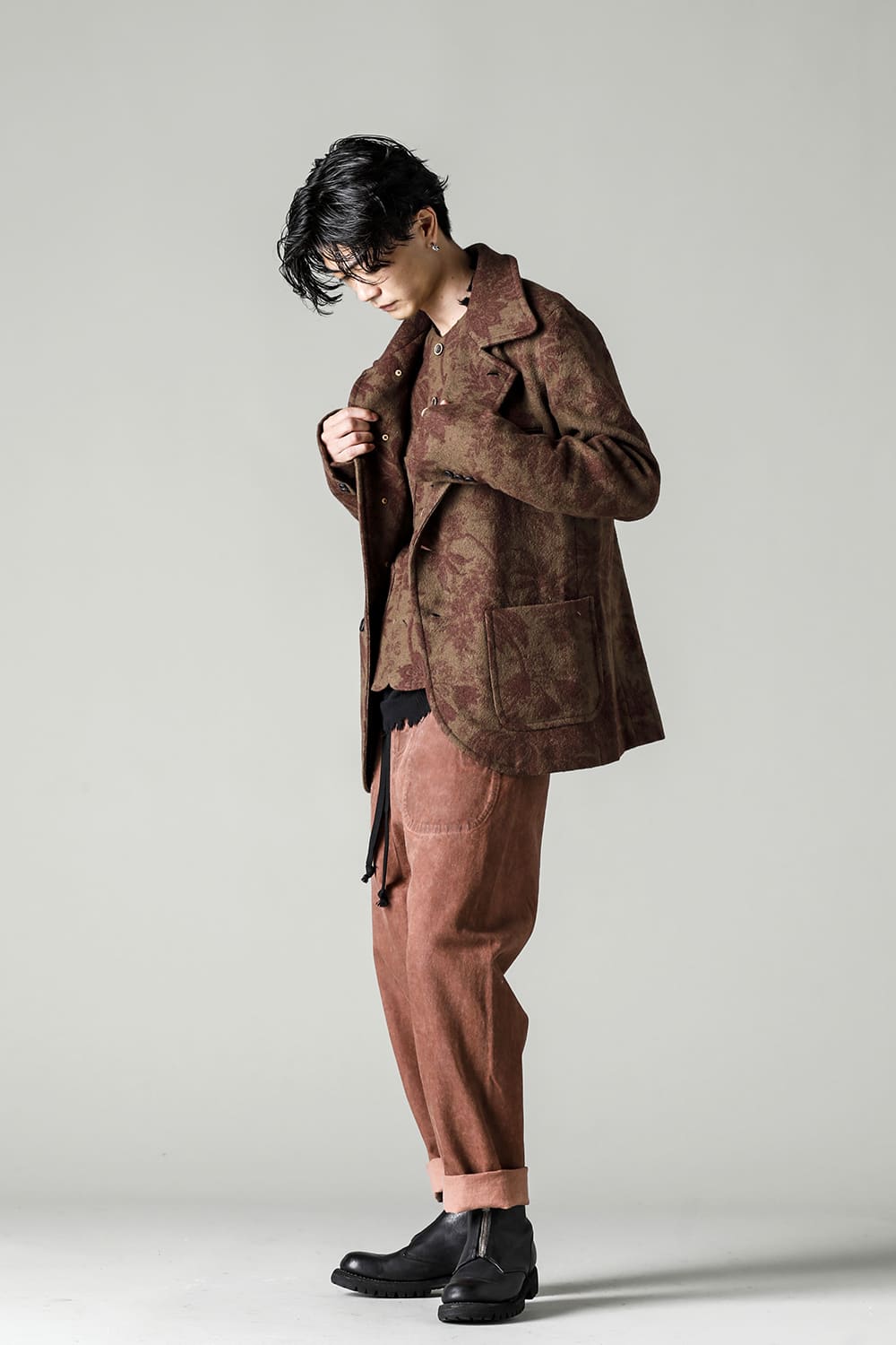 ミリタリージャケットをベースにデザインされた5ボタンジャケット。ボタンの開閉具合によってガラッと印象を変えることができます。胸ポケットにはフラップつき、パッチポケットが2つ袖口は本切羽、後ろ見頃にはセンターベンツが着きます。素材は繊細で味のあるヴァージンウール。オリエンタルな空気を醸し出すブラウンベースの生地にエンジ色でプリントされた植物の柄が印象的な1着です。同素材のベストUM6536-22AWとセットでの着用も可能です。ウール100%ですが、自宅での手洗い洗濯も可能です。