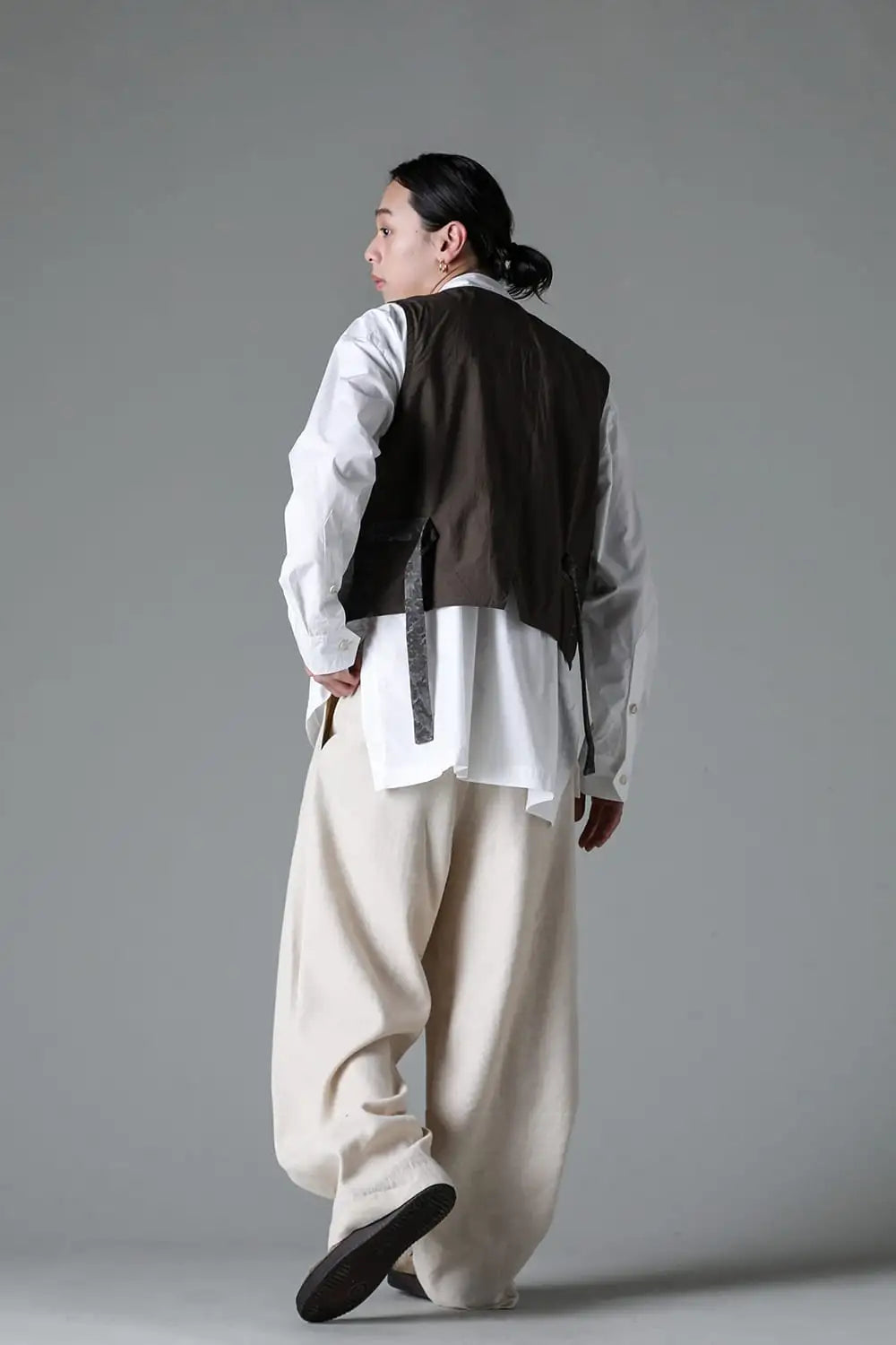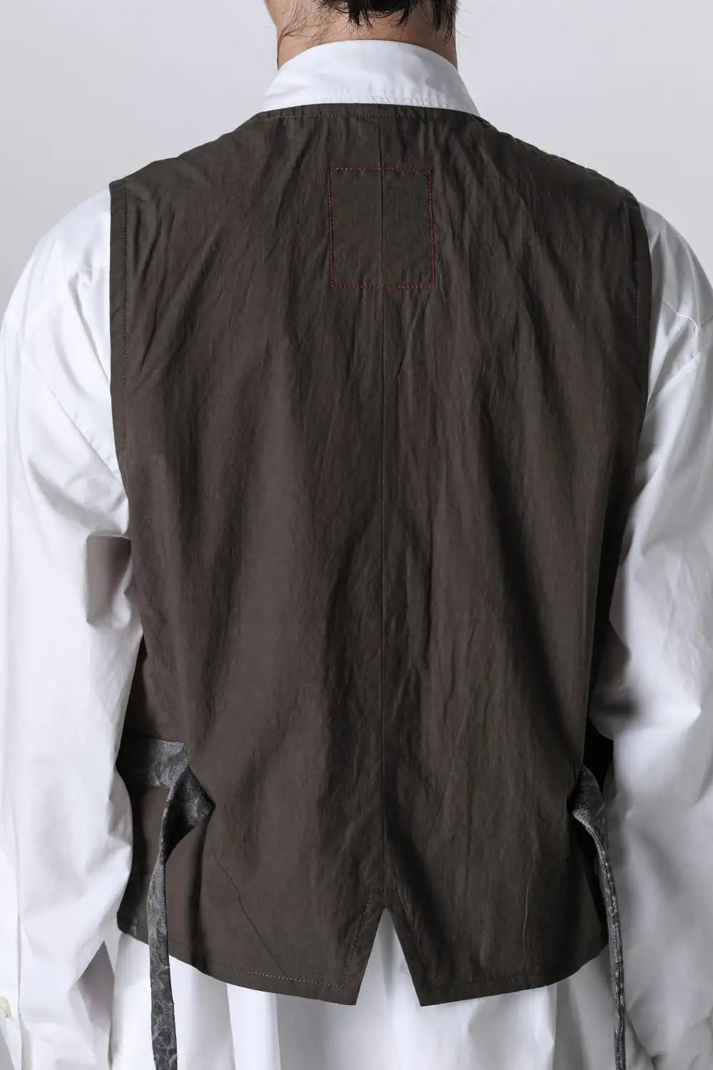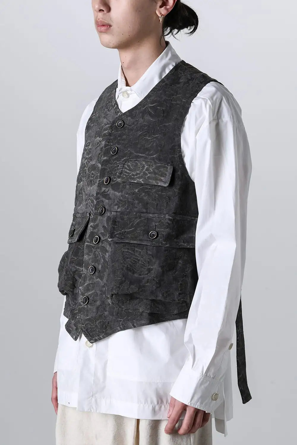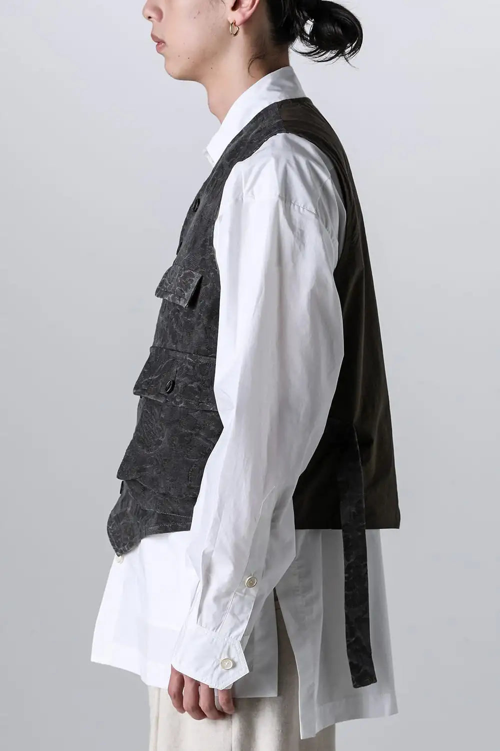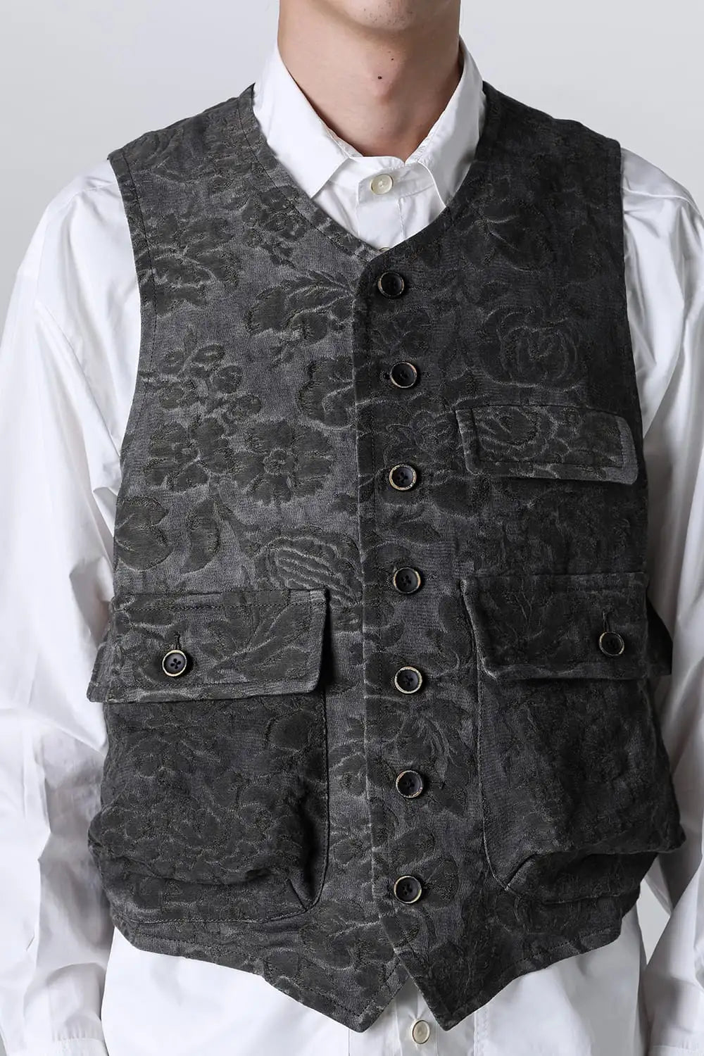 前後の身頃で生地を切り替えたベスト。 後ろ身頃はセンターのスリットやシルエットを調整できるコードがついており、前身頃は立体的なマチつきのポケットやユニークな形の襟元、少しゆとりのあるシルエットなど、クラシックなテーラードベストとミリタリーベストをミックスしたようなディテールが特徴です。 ボタンの表面の一部に使い込んだような削りを入れてヴィンテージ風に、前身頃の生地はジャカード織りで植物をあしらっており、深みのある色合いとともに雰囲気を作っています。