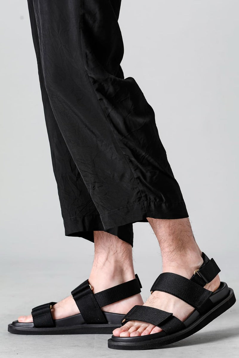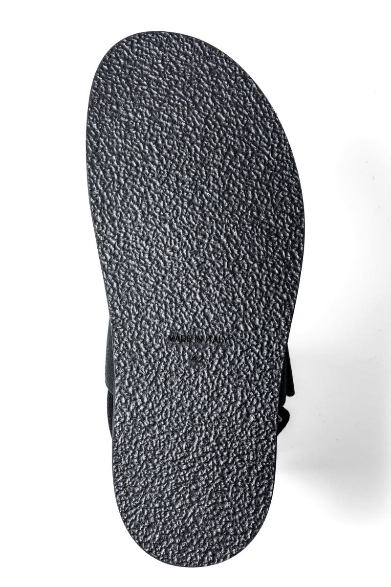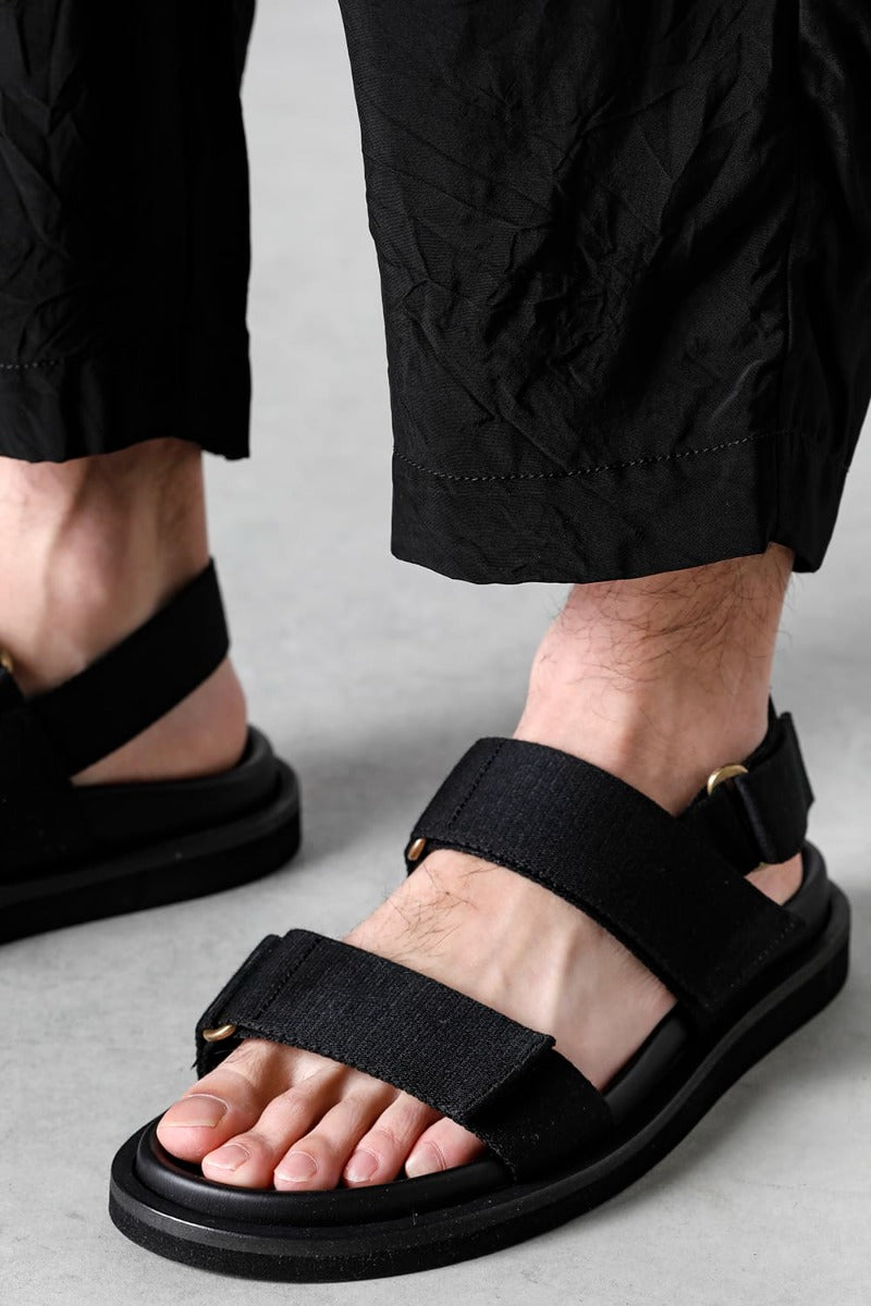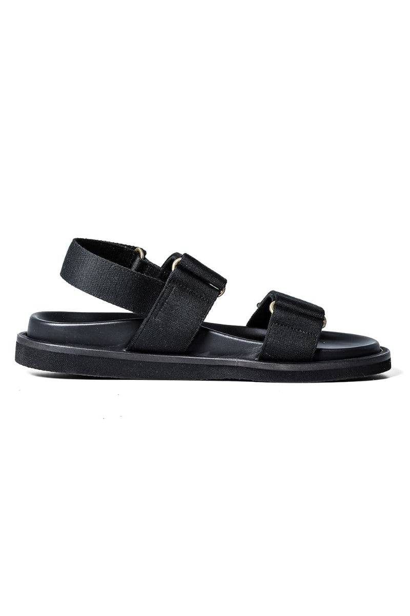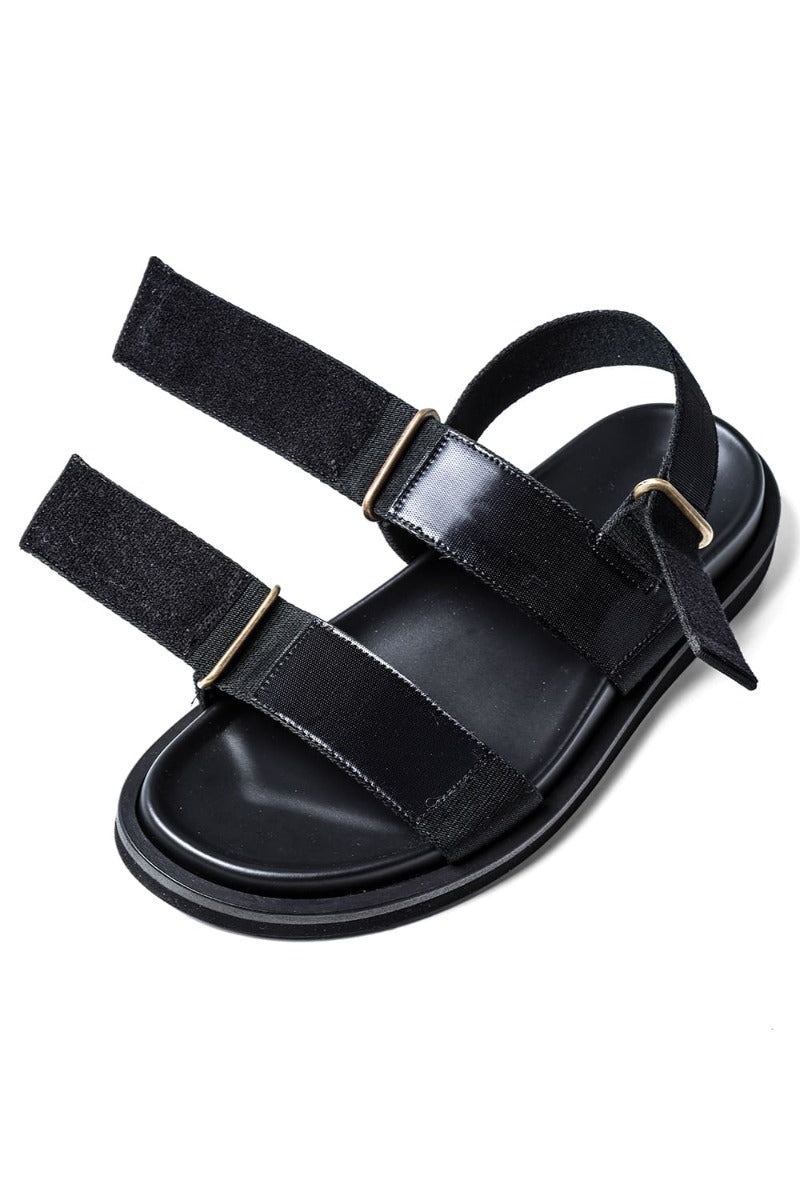 ポップな色使いやエレガントな素材を使た洋服が多いUMA WANGとしては珍しいカジュアルなストラップサンダル。クッション性のある中敷、ラバーソール、甲のストラップもマジックテープで止める仕様になっており、全体的に軽量な作りになっています。ブラック、アーミーグリーン、タンの3色展開。