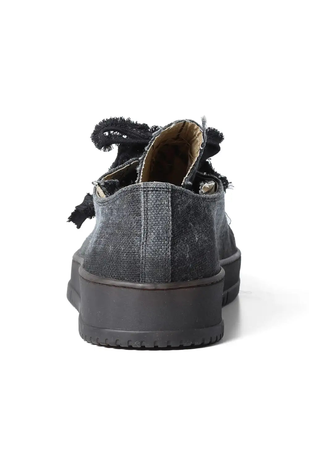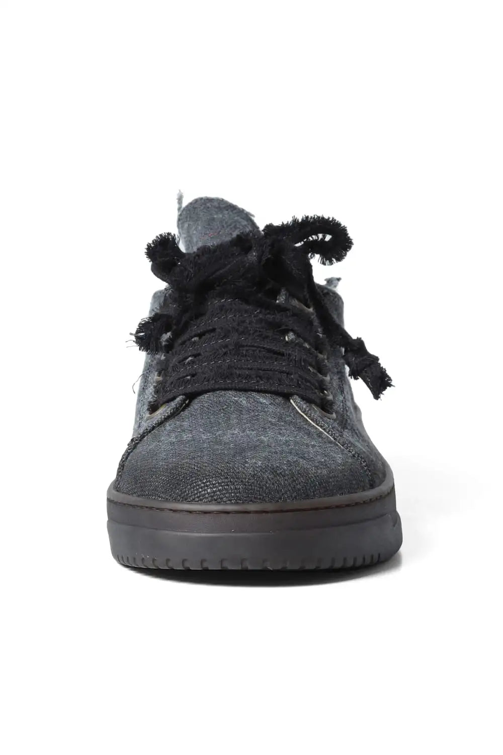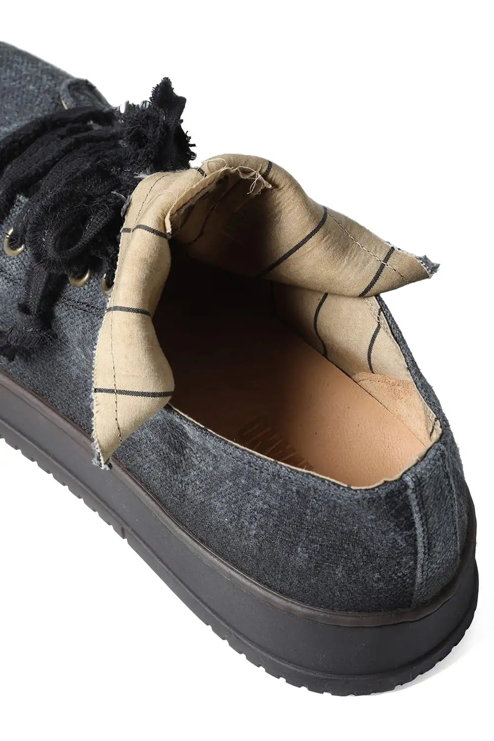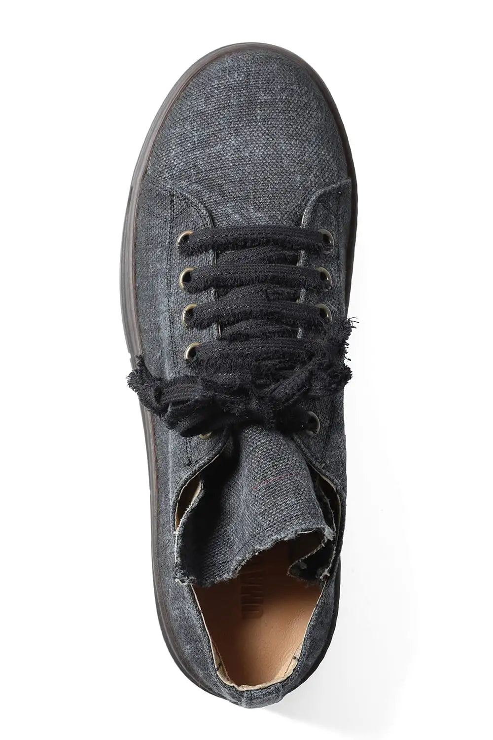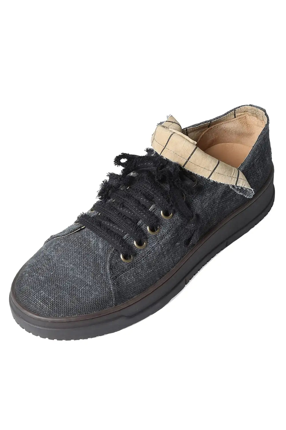 リネンキャンバスやほつれたようなシューレース、ところどころ色褪せであったり汚れのような色の差異が粗野な雰囲気のローカットスニーカー。 タンが大きく、折り返すとストライプの生地が見えるデザインになっています。 デザイン自体はローテクでシンプルなデザインですが、素材の雰囲気をダイレクトに反映させているため、スニーカーというカジュアルアイテムでありながらUMA WANGのアイテムだけでなく、アルチザンブランド全般と好相性です。 ブラックとタン(ベージュ)の2色をご用意しています。