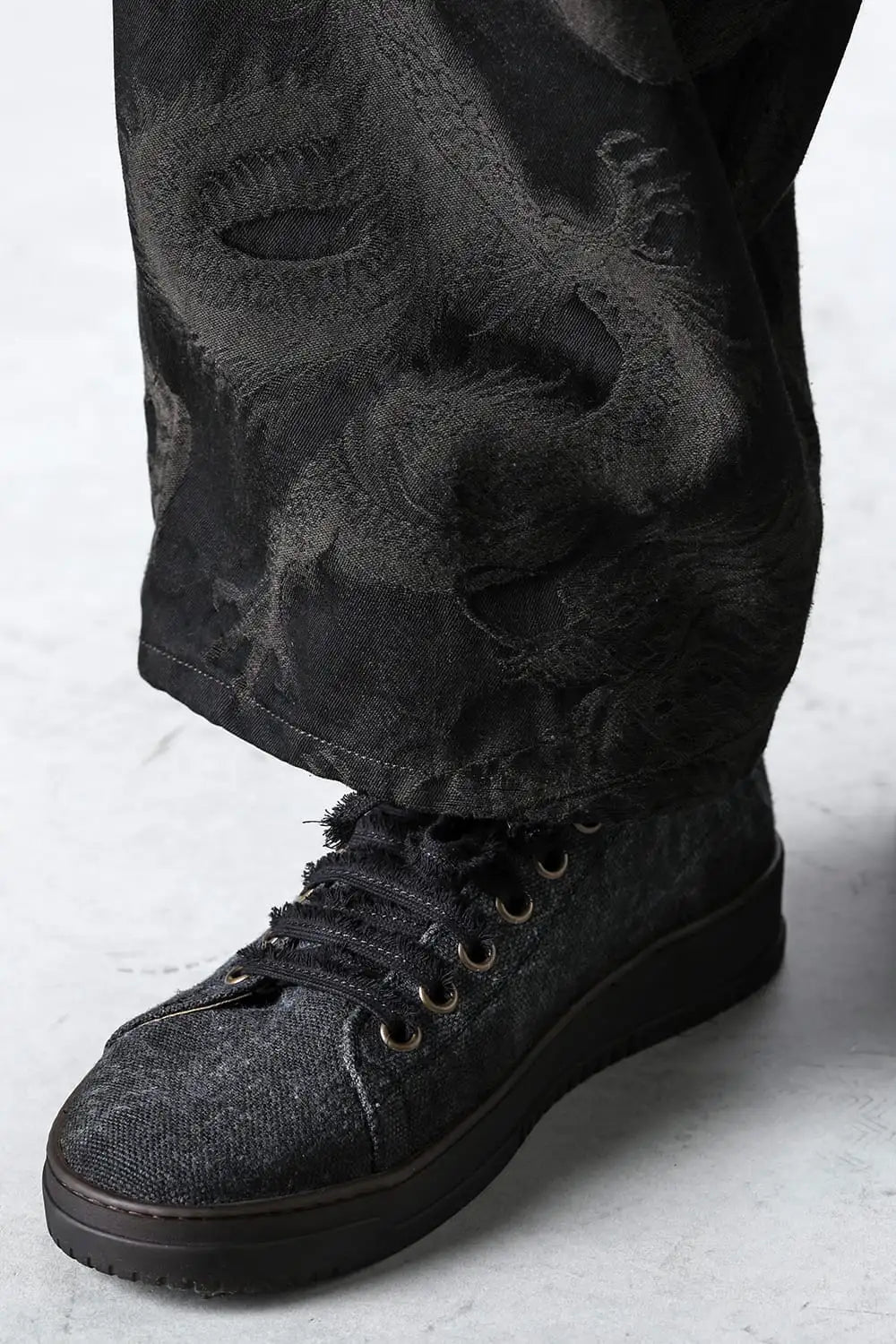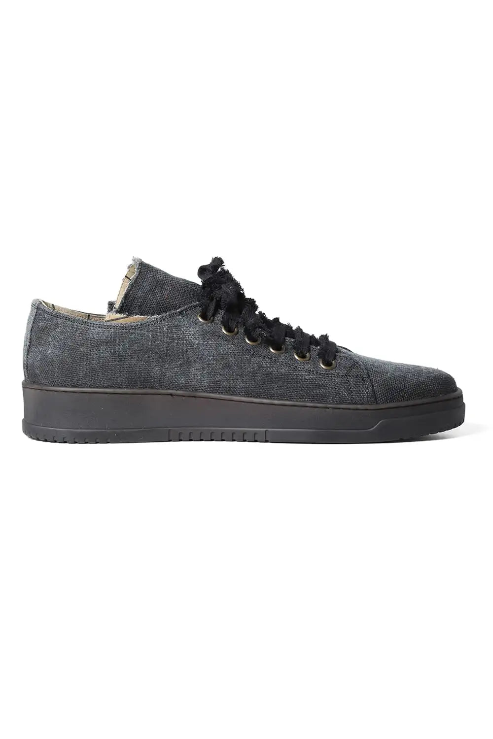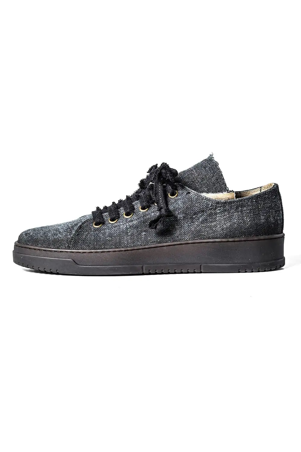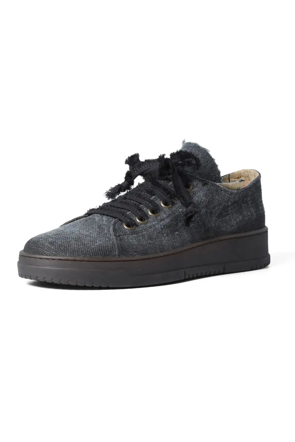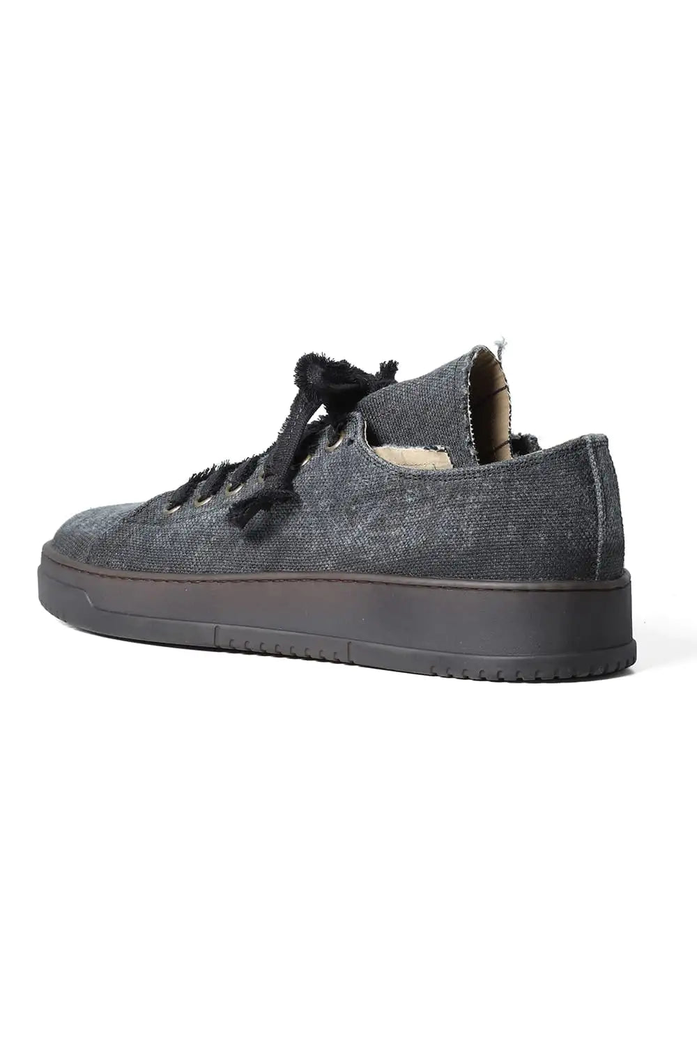 リネンキャンバスやほつれたようなシューレース、ところどころ色褪せであったり汚れのような色の差異が粗野な雰囲気のローカットスニーカー。 タンが大きく、折り返すとストライプの生地が見えるデザインになっています。 デザイン自体はローテクでシンプルなデザインですが、素材の雰囲気をダイレクトに反映させているため、スニーカーというカジュアルアイテムでありながらUMA WANGのアイテムだけでなく、アルチザンブランド全般と好相性です。 ブラックとタン(ベージュ)の2色をご用意しています。