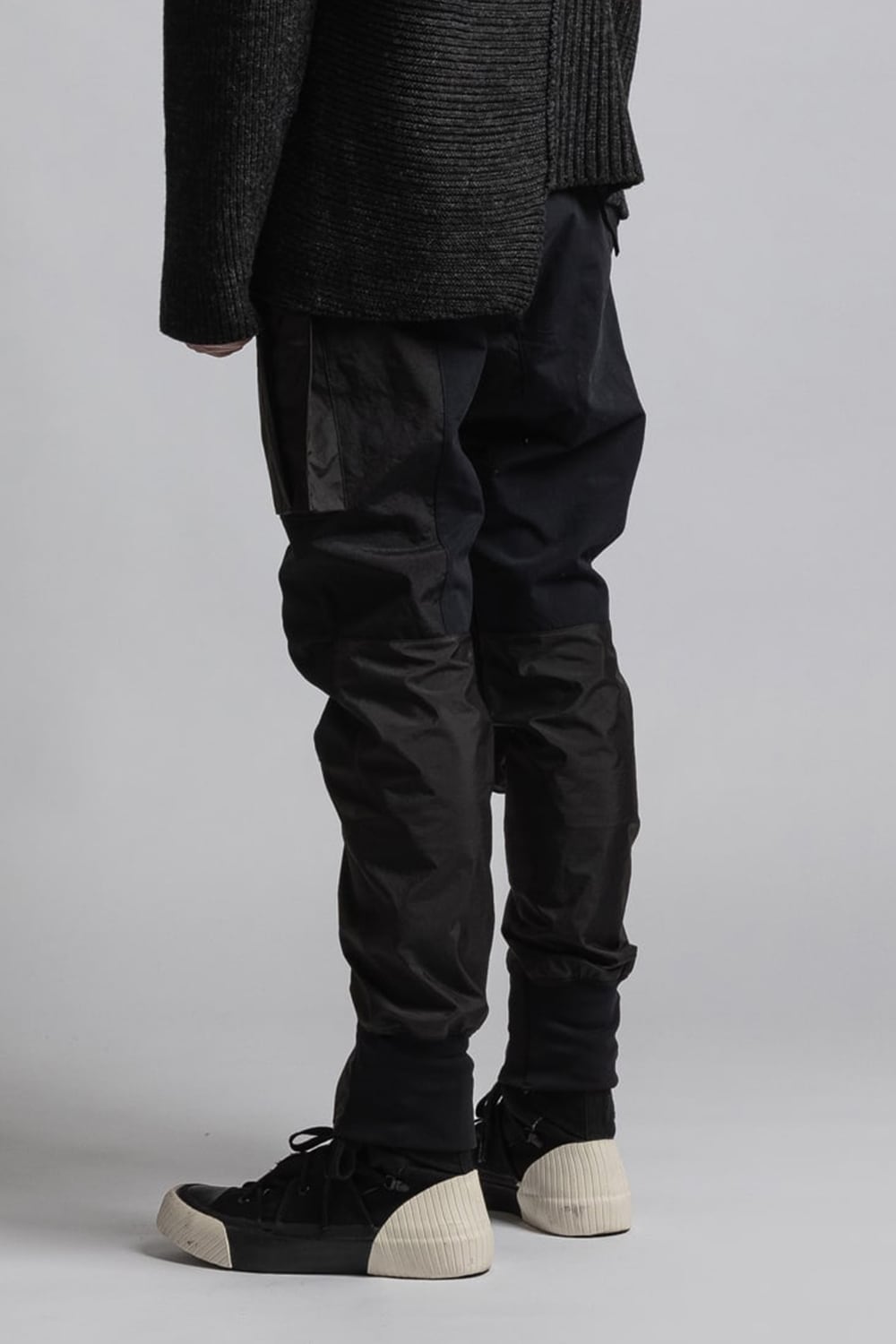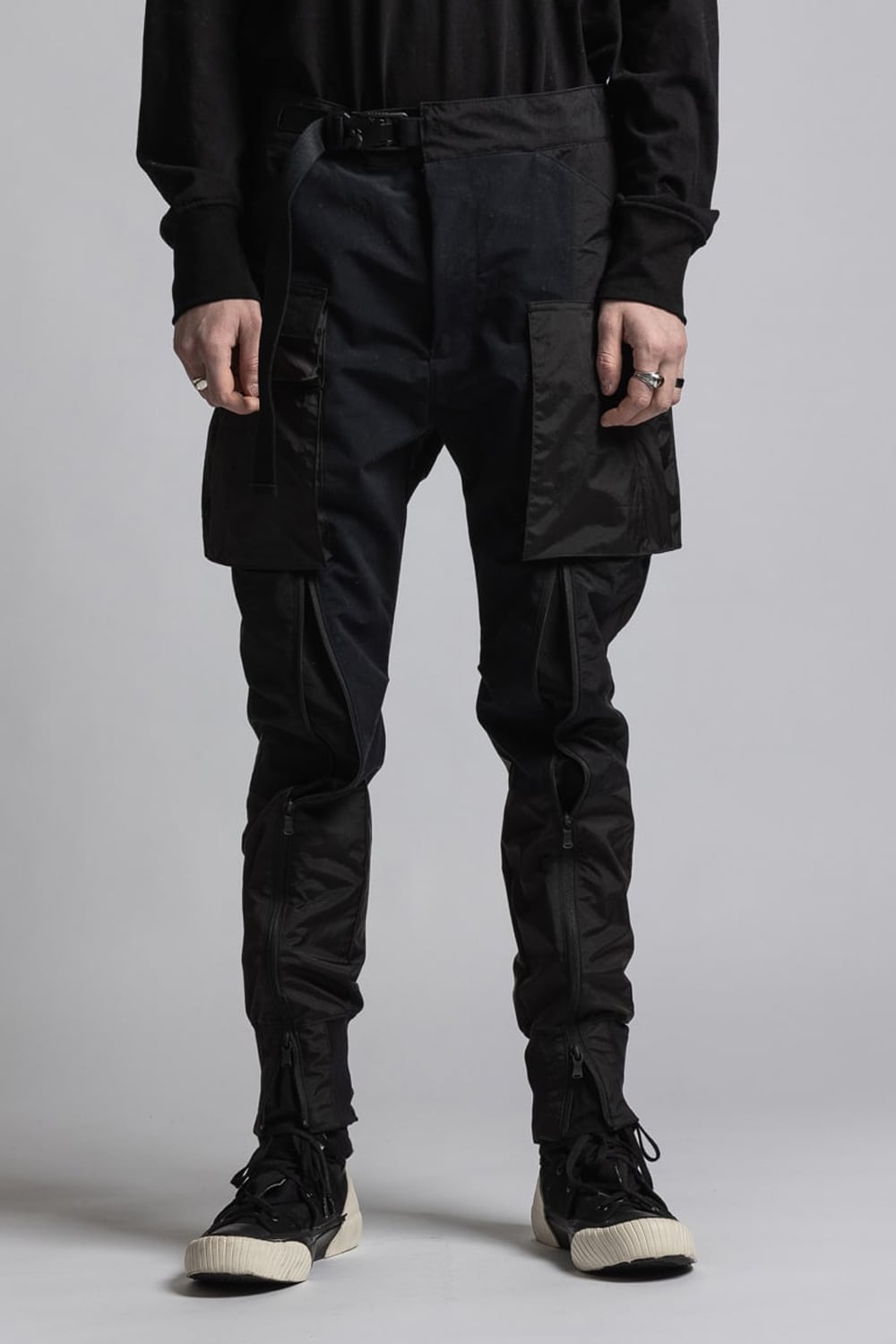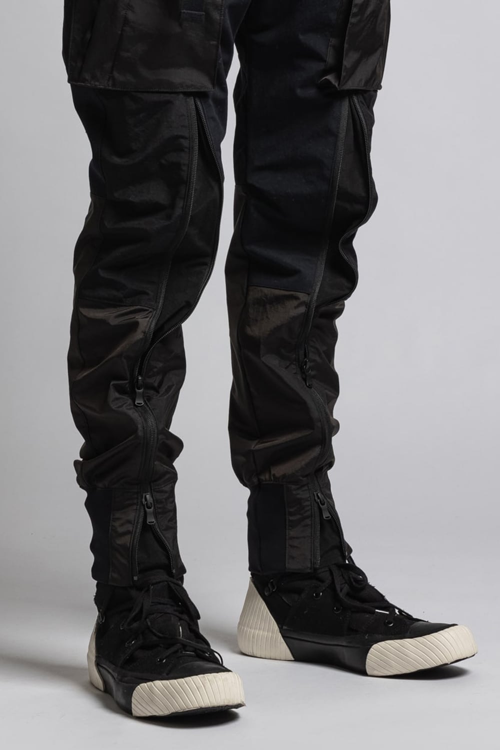 ・膝上から裾に配置されたファスナーでシルエットの調整が可能(ファスナーを開けるとマチがある)。