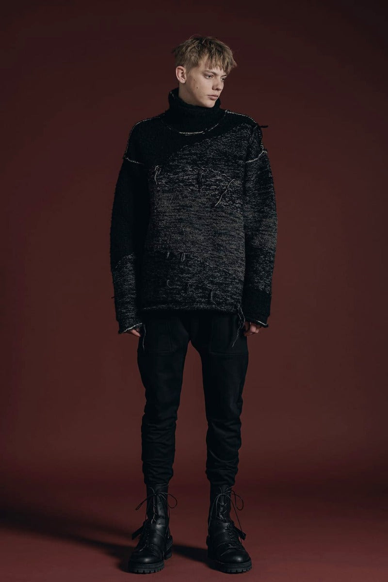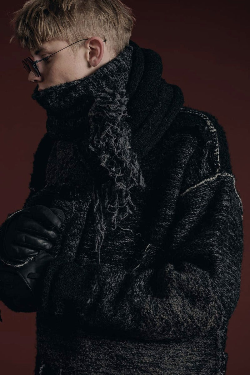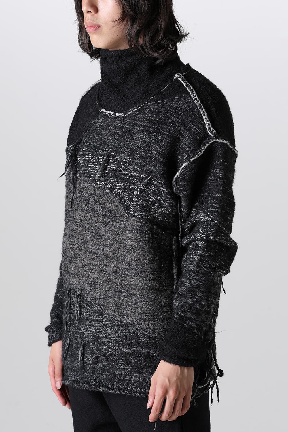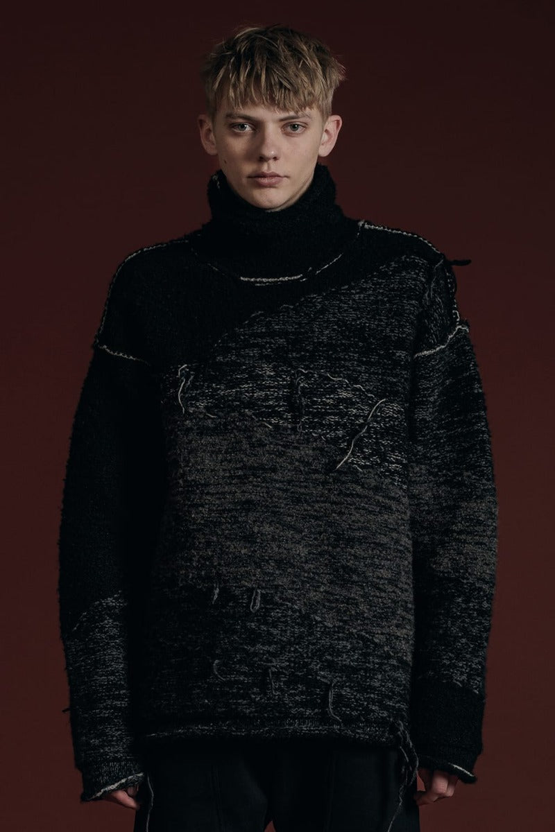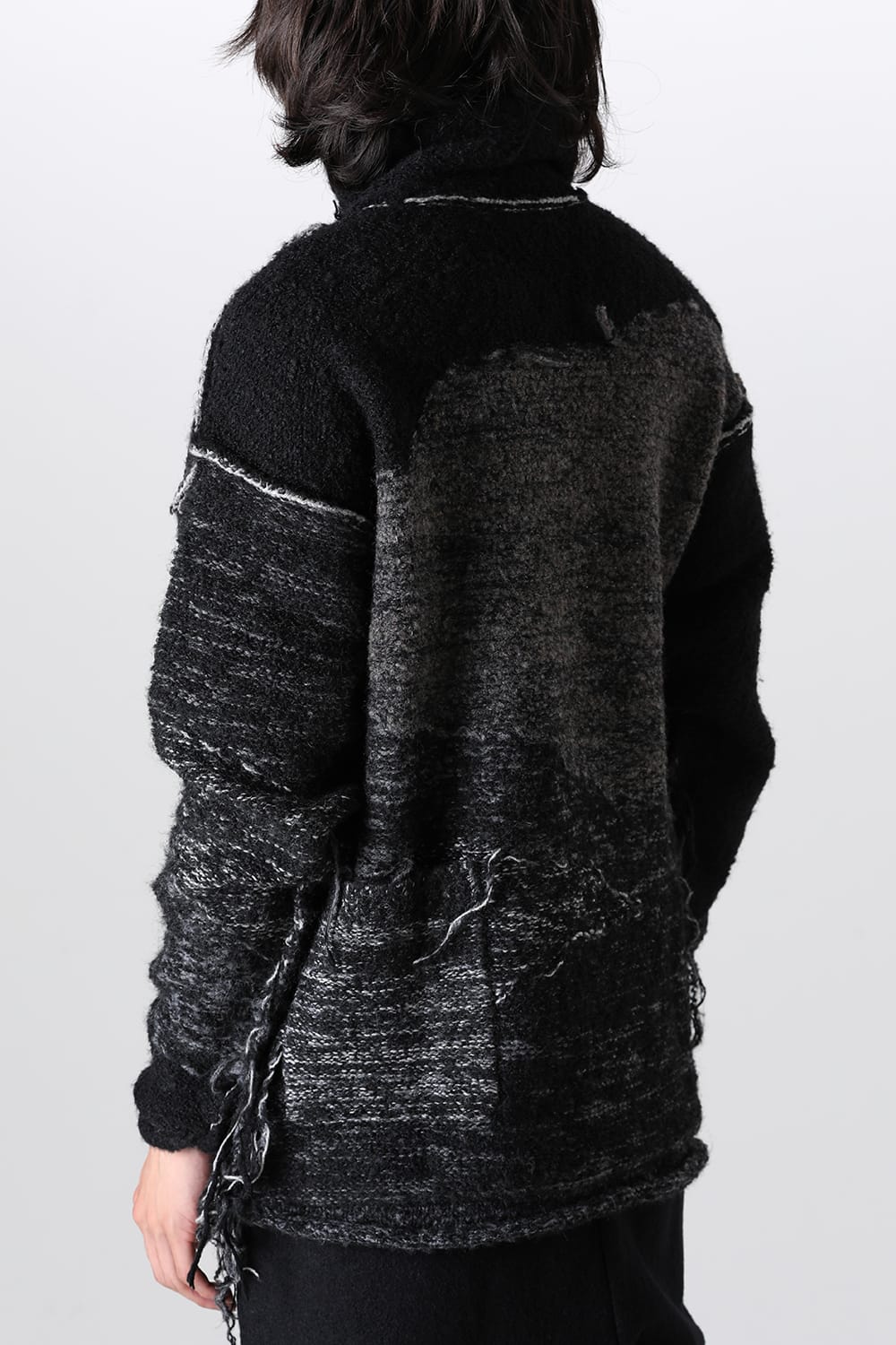 複数の異素材、異形状の糸を組み合わせて編んだタートルネック P/O。