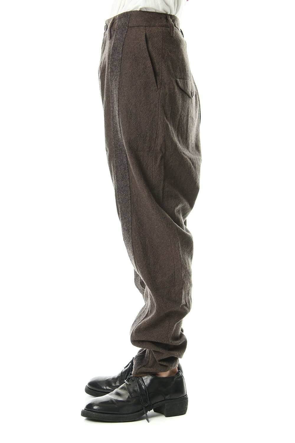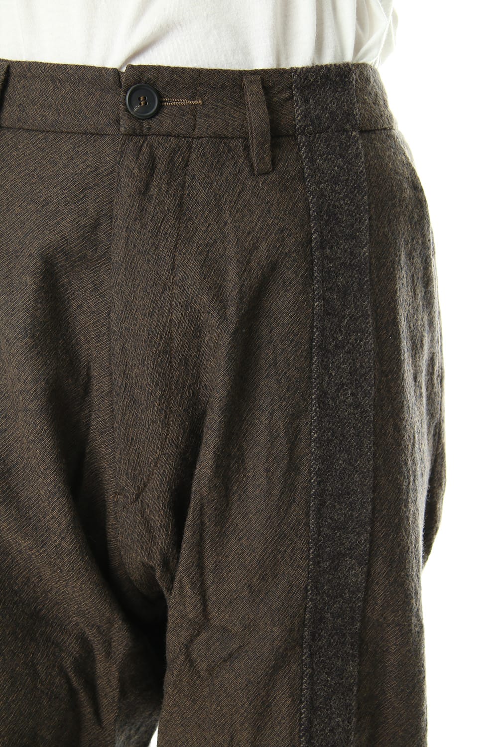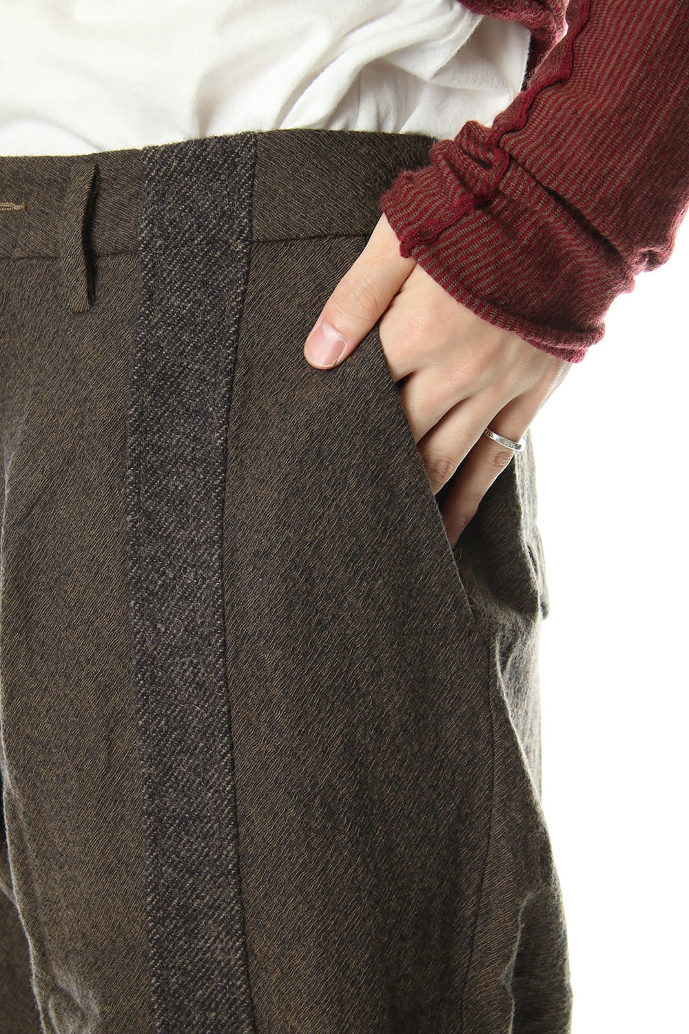 Pants with contrasting fabric lines on the front.