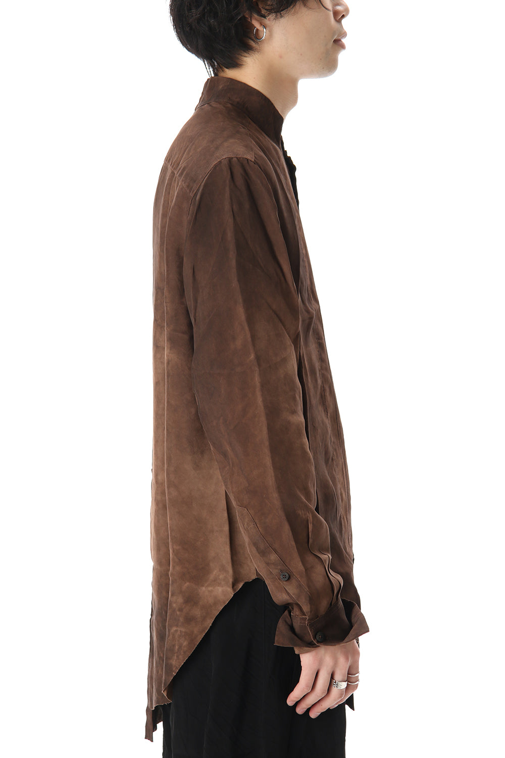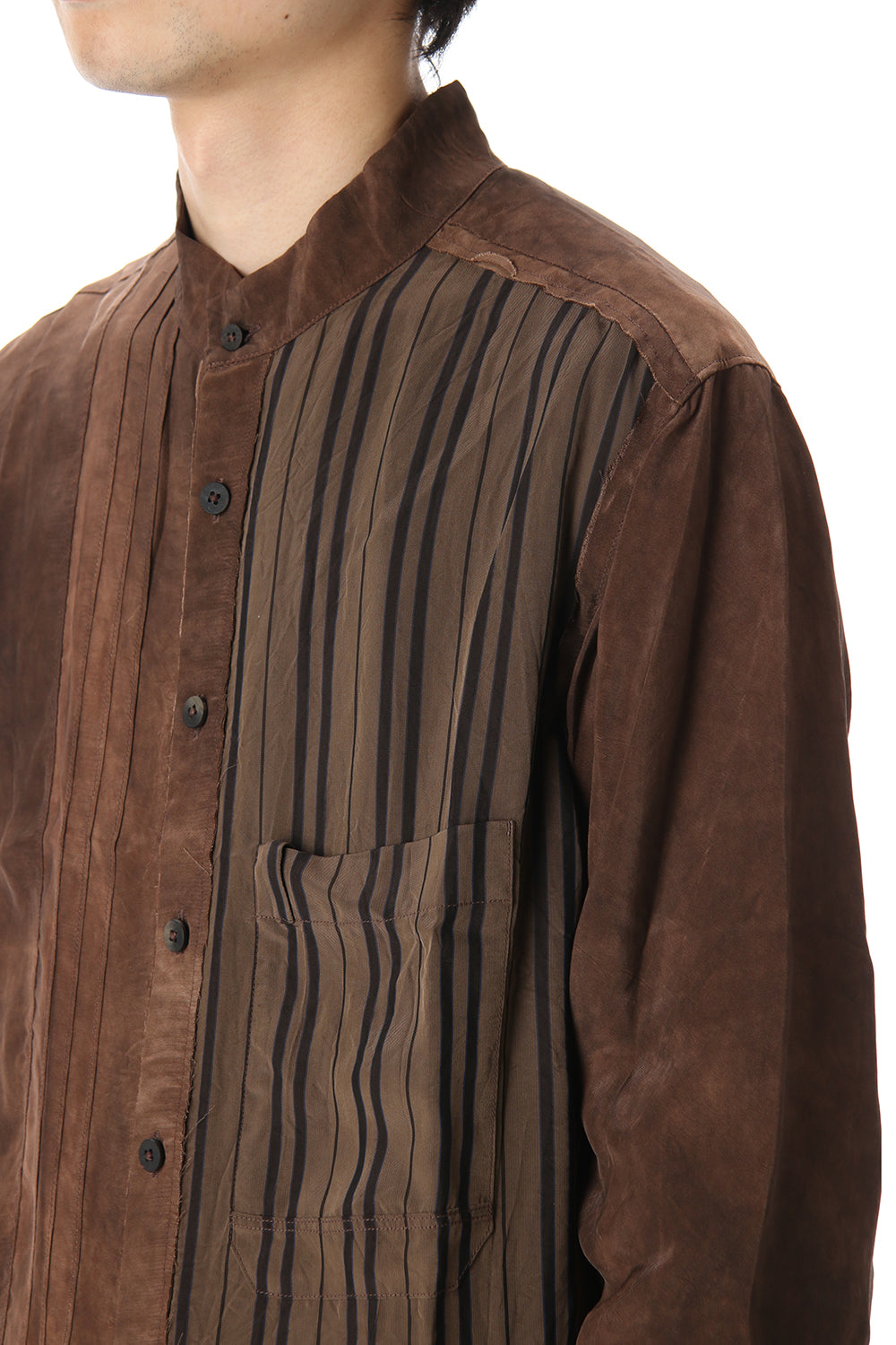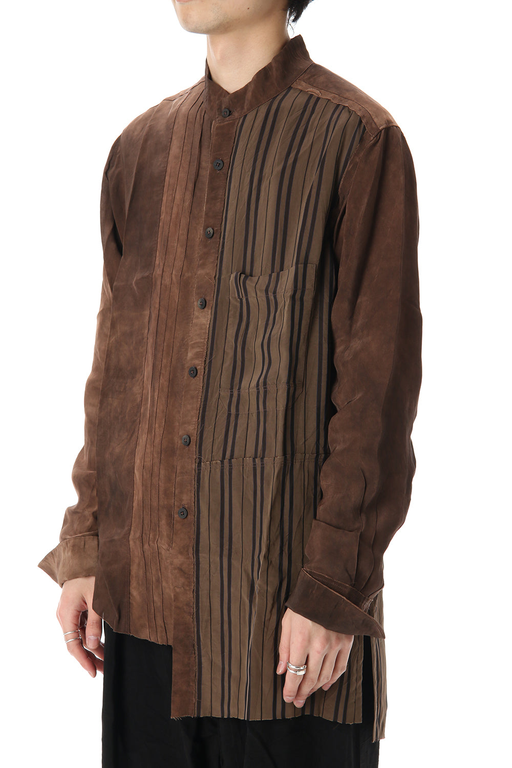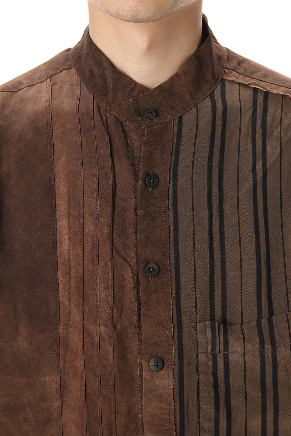 This is a collarless shirt with details that looks as if three types of Viscose fabric are combined into one shirt. The cut-off design is applied everywhere, creating a small, familiar texture like vintage wear. The cuffs are slightly wider like the turn-up cuffs.